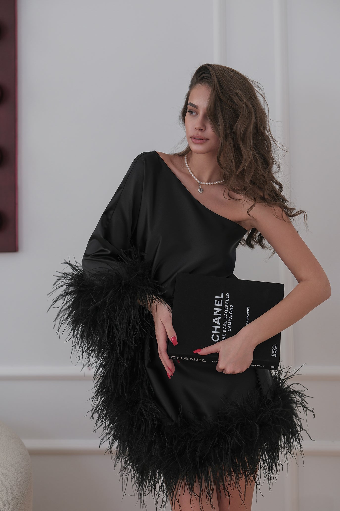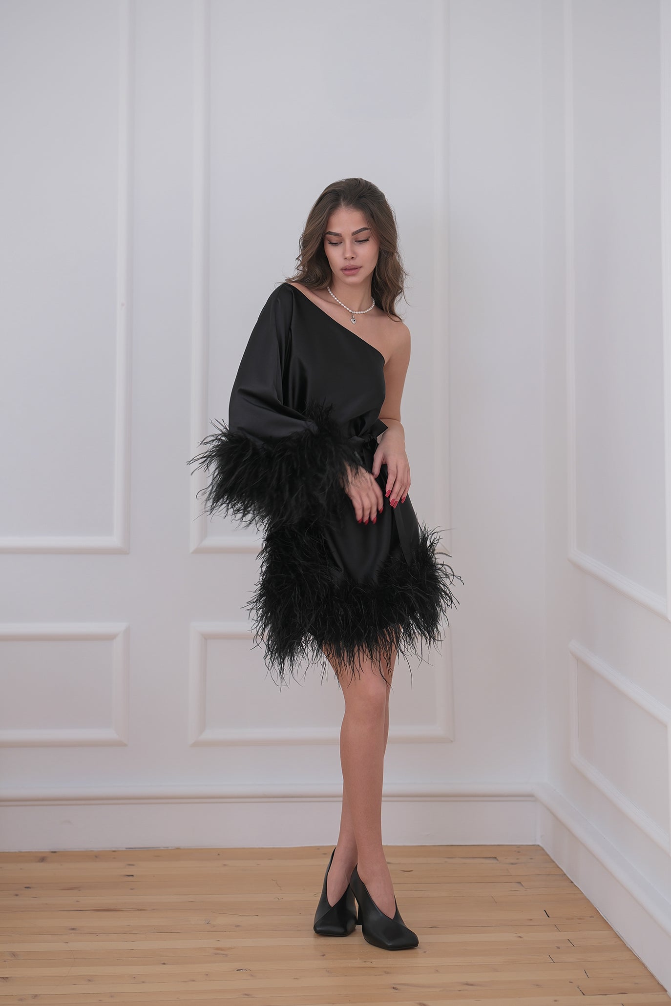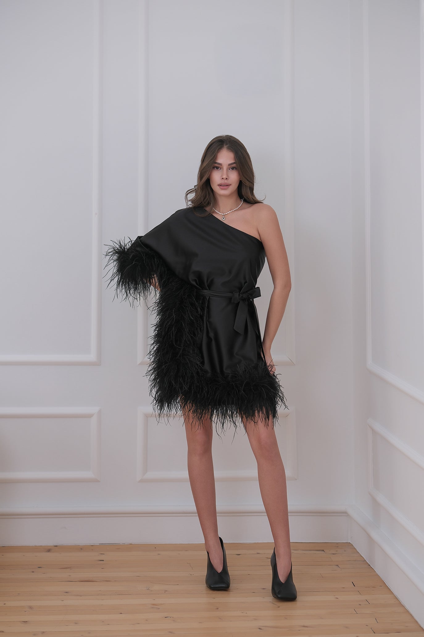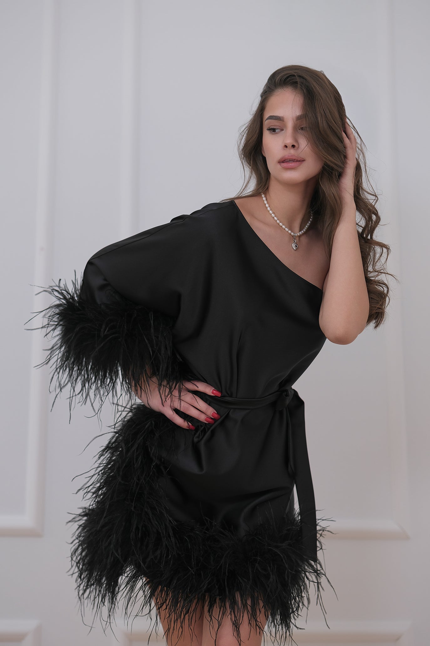 Елегантна къса рокля с асиметрично деколте и подчертана талия, създадена за впечатляващо присъствие. Моделът е с фина сатенирана материя и акцентни пера по подгъва и ръкава. Коланът оформя силуета.