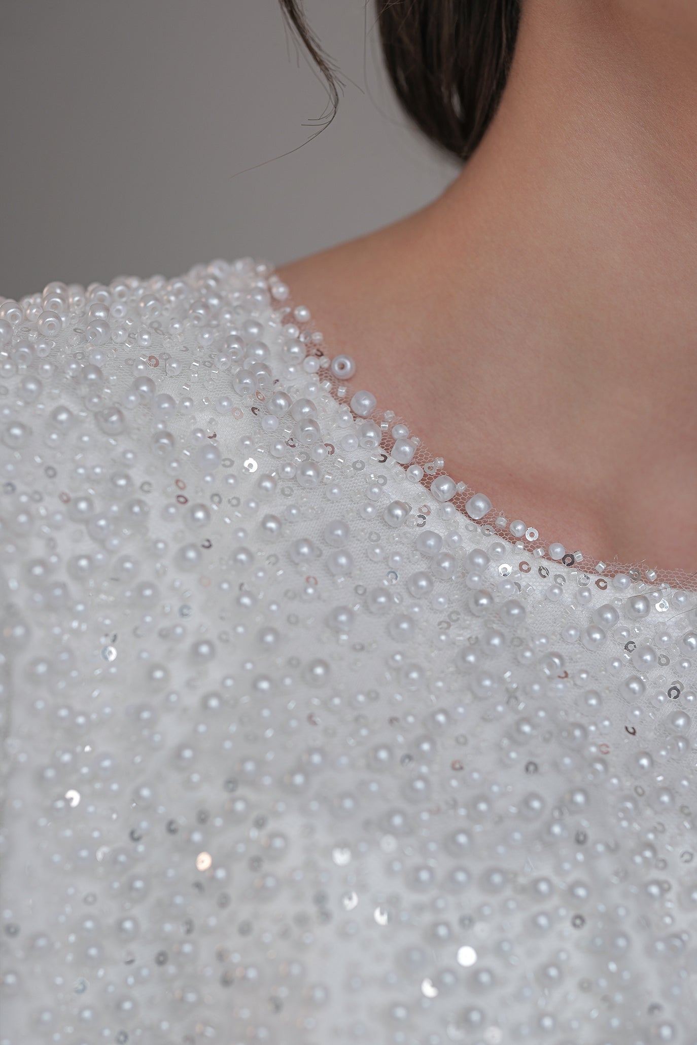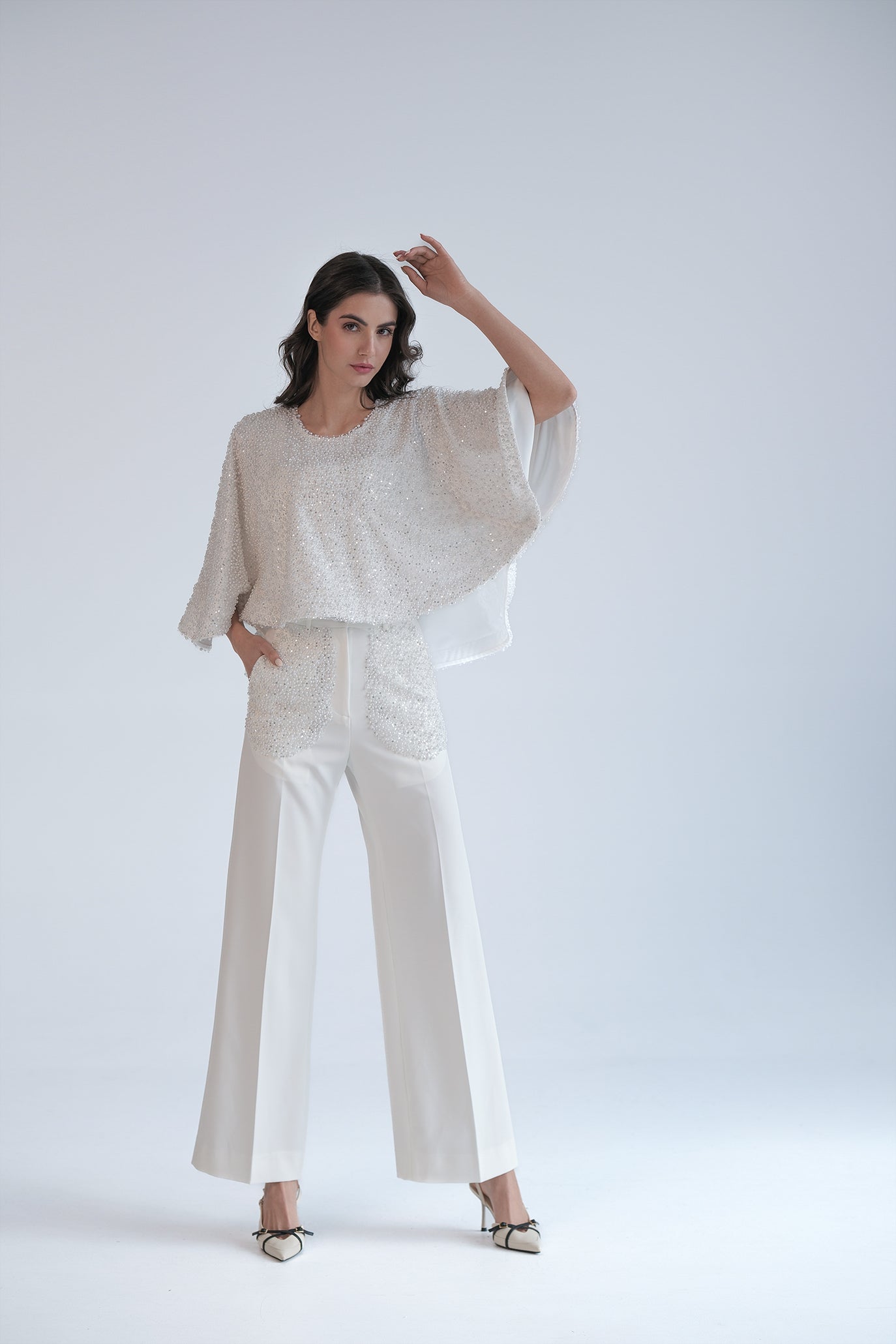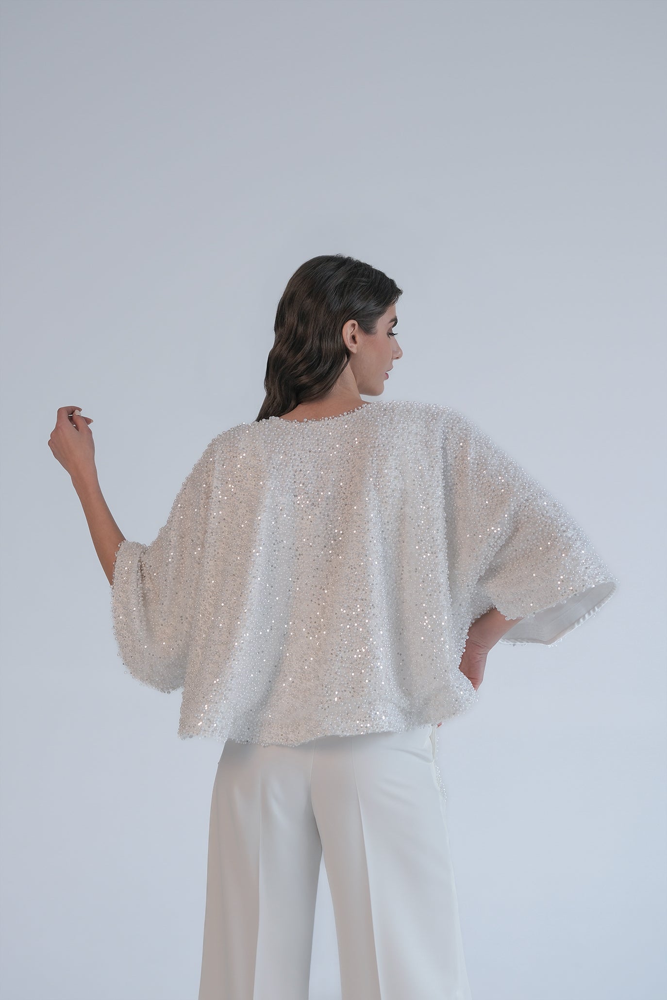 Блуза - наметало със свободен, пончо силует и фино обшита с пайети и перли повърхност, която създава деликатен блясък при движение. Кройката пада леко и ефирно около тялото, без да го очертава, като придава усещане за лекота и комфорт.