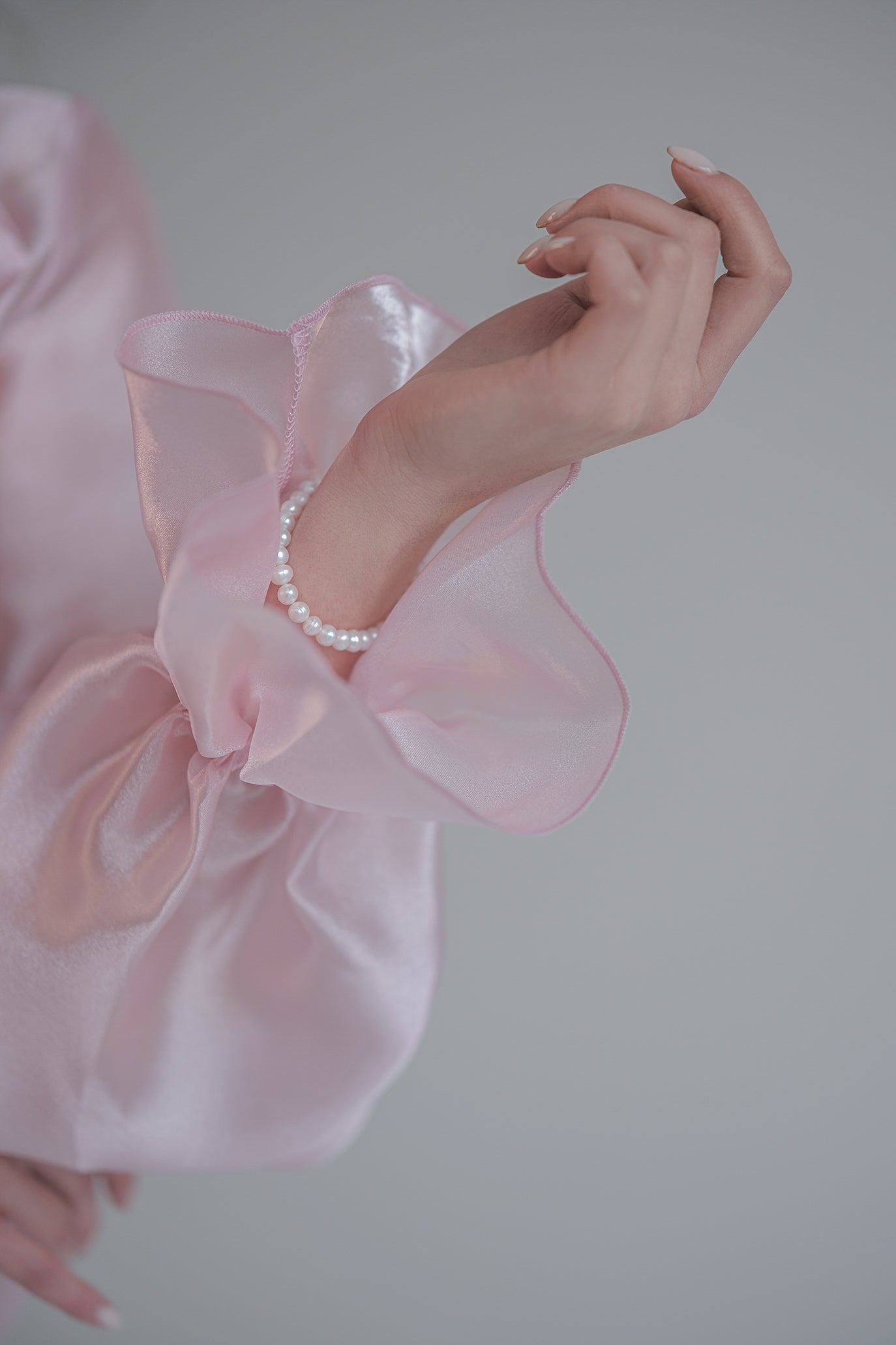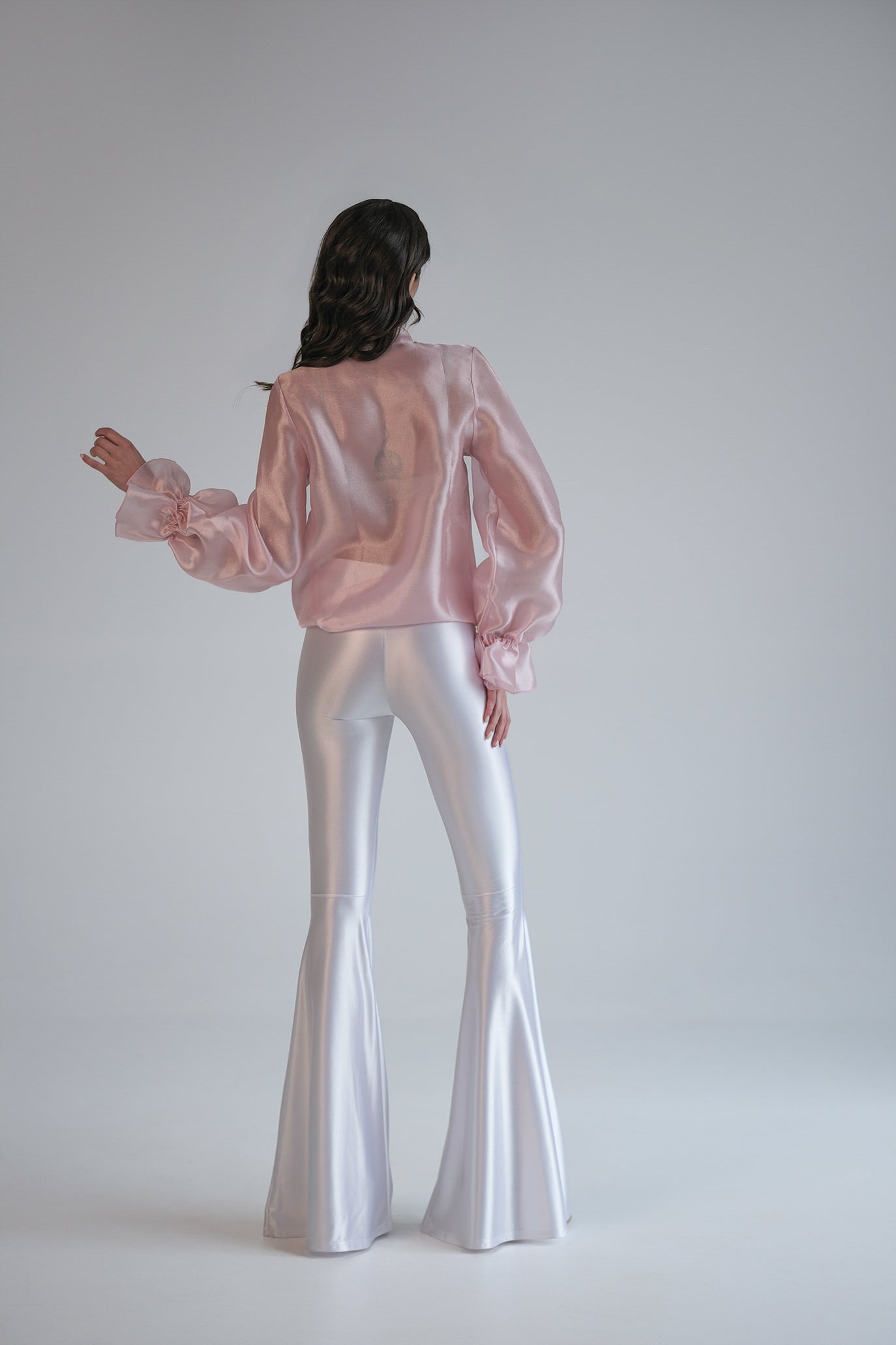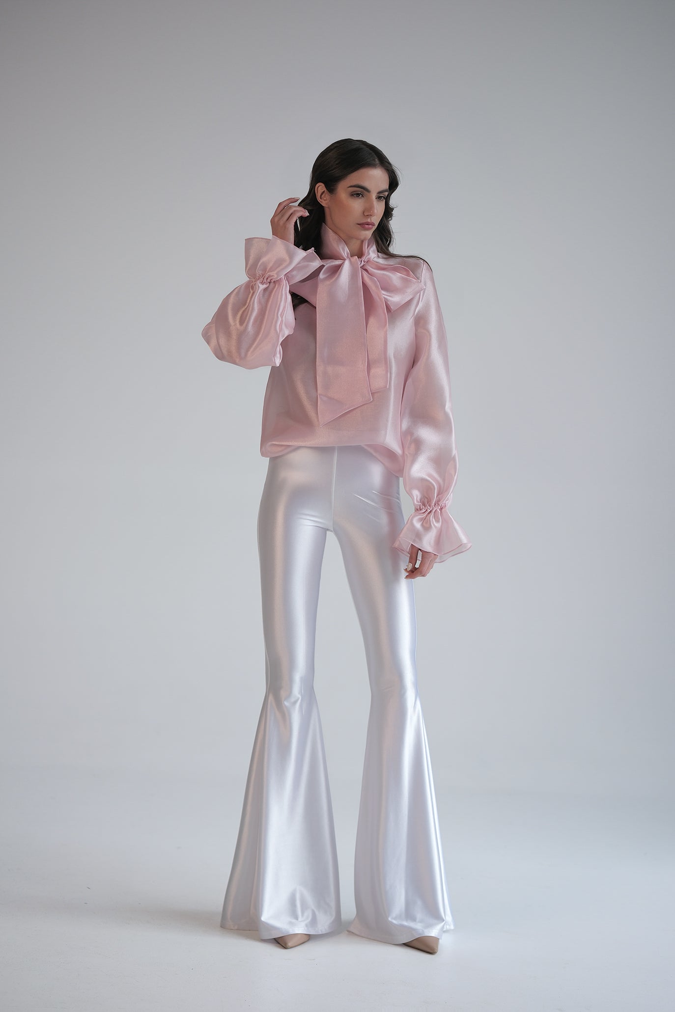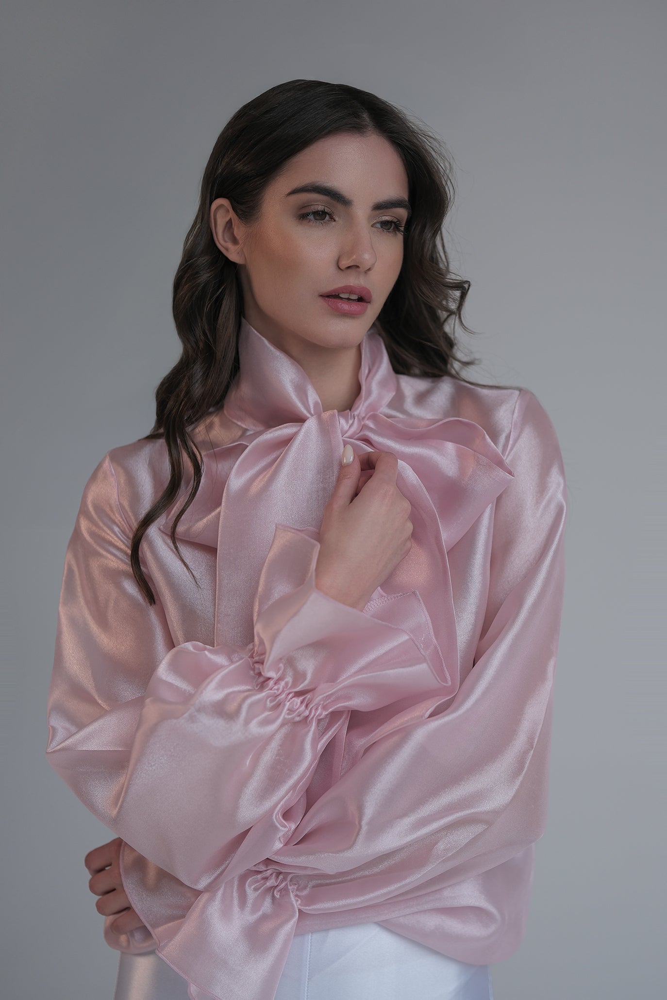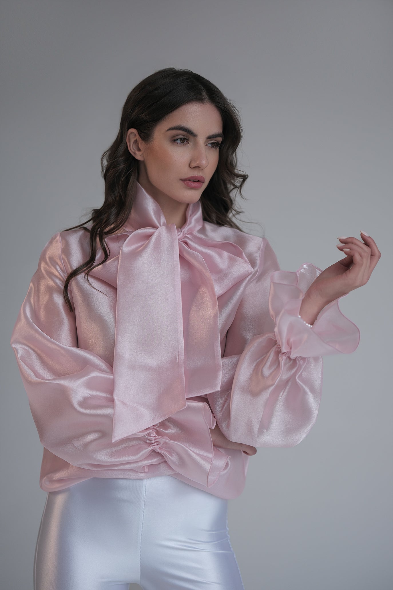 Блуза с дълъг ръкав, изработена от деликатен полупрозрачен и проветрив текстил, придаващ луксозен и ефирен вид. Акцентът е голяма панделка на врата, което добавя нестандартност на визията. Дизайнът е с леко обемни ръкави, които завършват с маншети, акцентирани с копчета. Може да се комбинира както с панталон, така и с пола, за да се създаде завършен и елегантен тоалет.