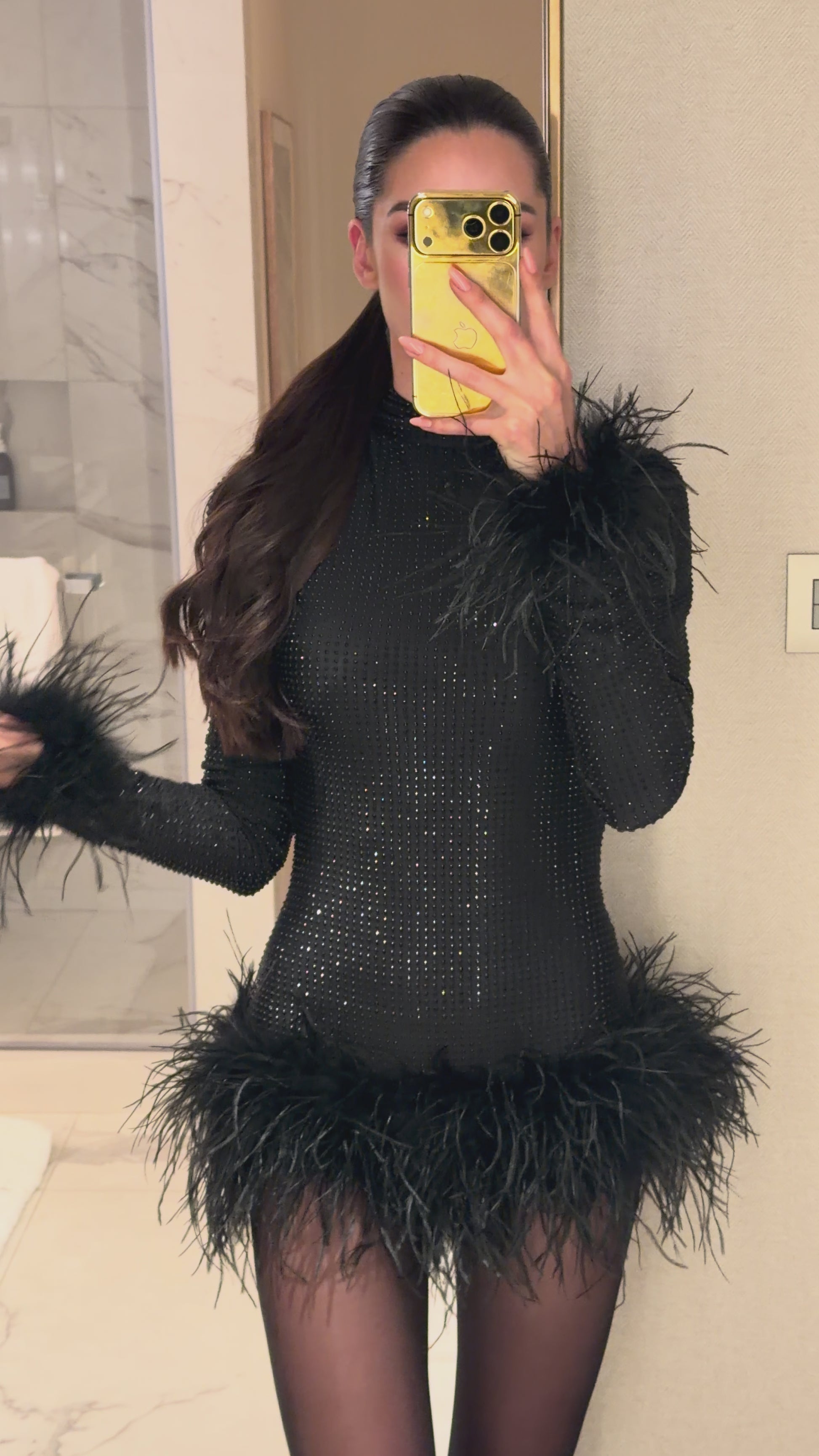 Къса вечерна рокля тип боди с втален силует, изработена от еластична материя с фино блестящ ефект. Текстурата е покрита с деликатни отблясъци, които придават дълбочина и елегантен блясък без да натоварват визията. Моделът е с висока яка и дълги ръкави, завършени с ефектни пера. Подгъвът също е декориран с пера, добавяйки движение и характер при всяка крачка. Кройката следва плътно линията на тялото, оформя силуета и подчертава женствеността, като същевременно осигурява комфорт благодарение на еластичността на материята.