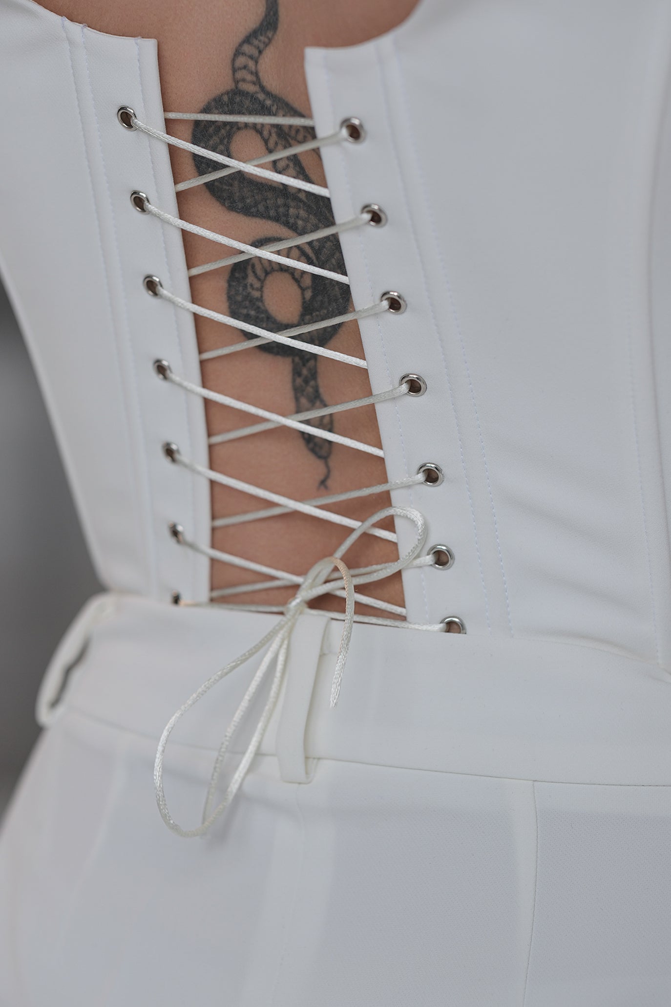 Луксозно ръчно изработено бюстие - потник от плътна дишаща материя. Приляга идеално върху тялото. Благодарение на корсетното завързване на гърба, пасва по линията на тялото и може леко да се регулира размерът. V-линията му подчертава талията, а квадратното деколте - врата и раменете. Ръчно декорирано е с перли и пайети в предната част. Бюстието лесно се комбинира както с поли, така и с панталони.