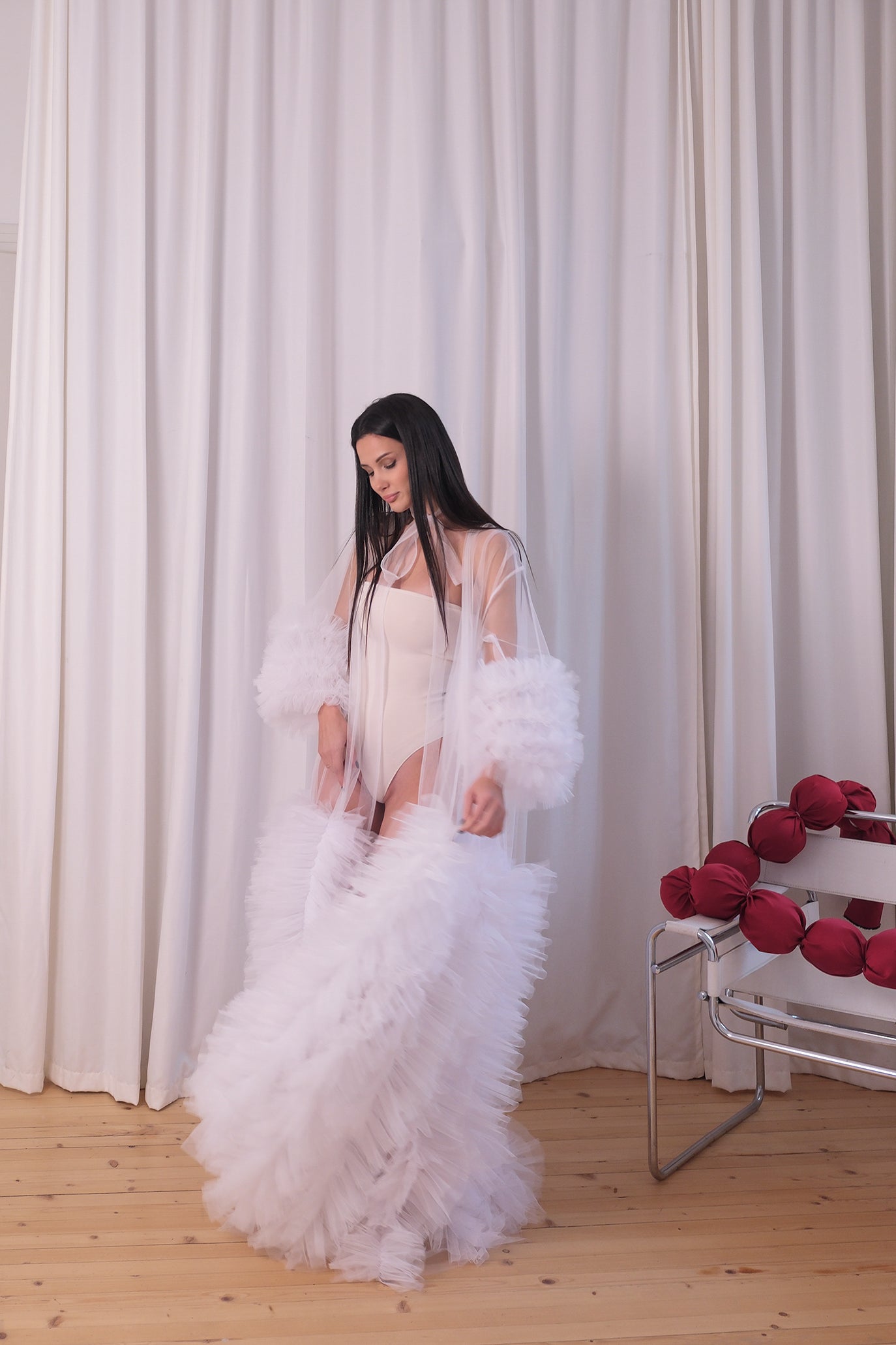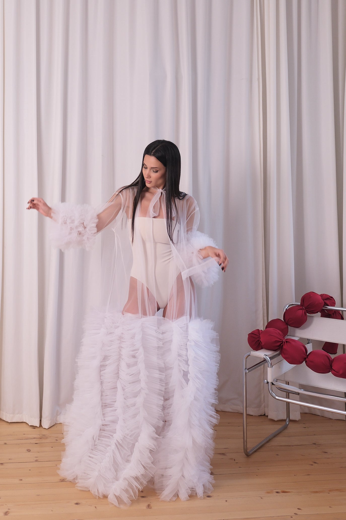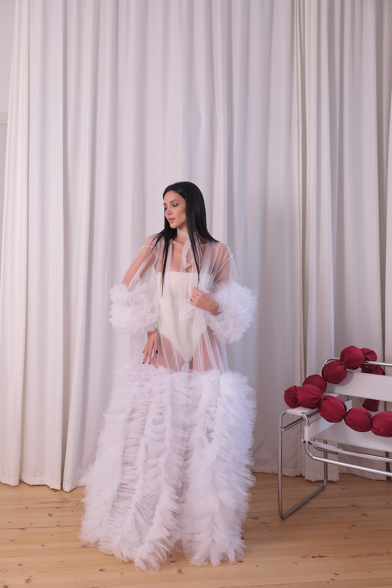 Луксозен дълъг халат от многослоен тюл, който впечатлява с изключителна лекота, обем и сценично излъчване. Ръкавите са оформени с тюлени волани, придаващи обем и ефирност при движение. Цялата дължина е декорирана с ръчно подредени тюлени пера, които създават уникален текстуриран ефект и движение. Прозрачната структура на халата позволява да се носи както върху бельо, така и като акцент към фотосесии, сватбени подготовки или специални моменти. Коланът от тюл подчертава талията и завършва визията с нежна женственост.