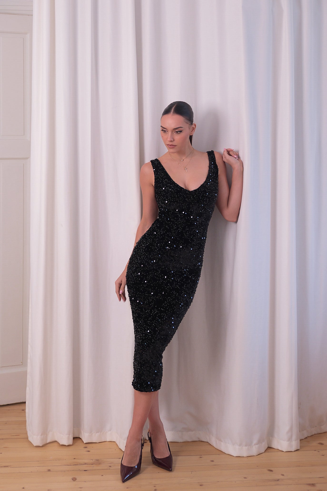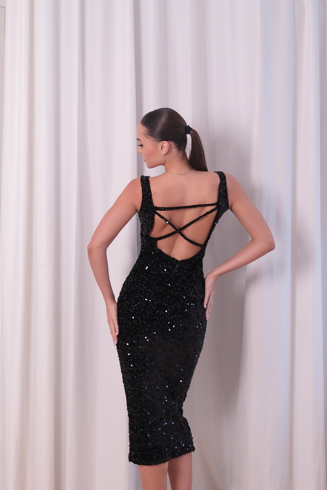 Рокля, изработена от богато декорирана, блестяща материя, която придава незабравимо присъствие. Поради специфичната декоративна текстура на материята, може да се усеща като леко по-твърда при директен контакт с кожата. Това е характерно за тъкани с плътни пайети и не влияе на външния вид и качеството на изделието. Роклята е с издължен, женствен силует и дължина под коляното, с изчистено деколте и ефектен гръб с кръстосани презрамки, които подчертават фигурата. Моделът е без подплата.