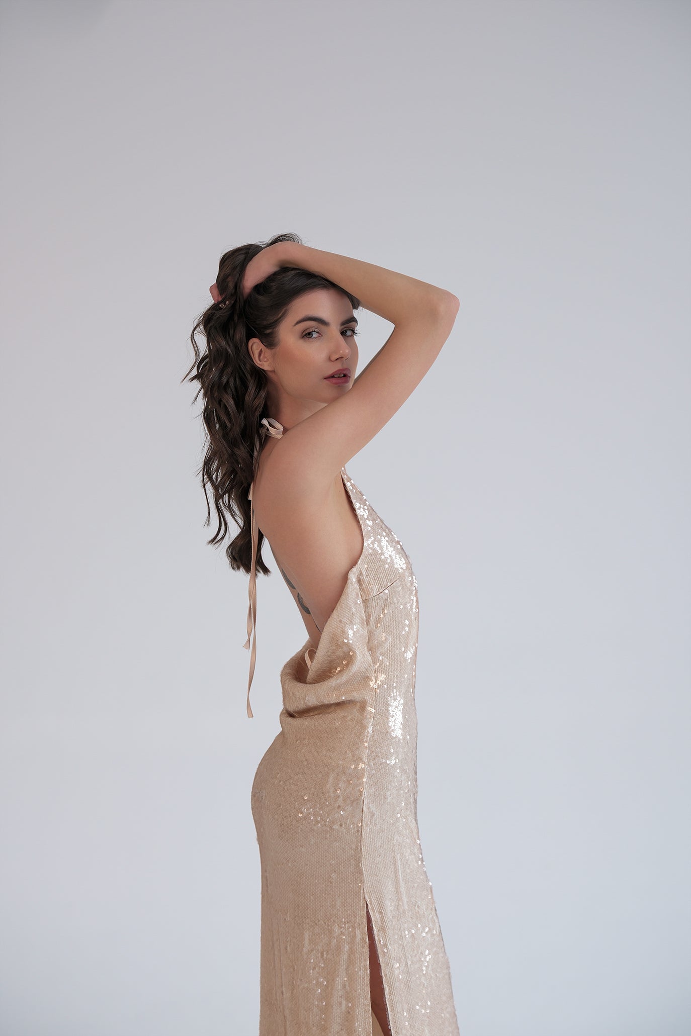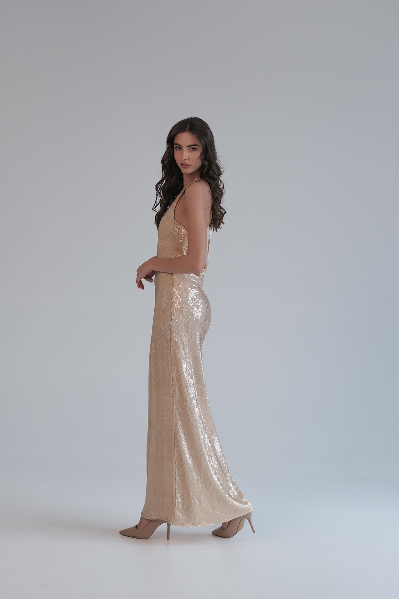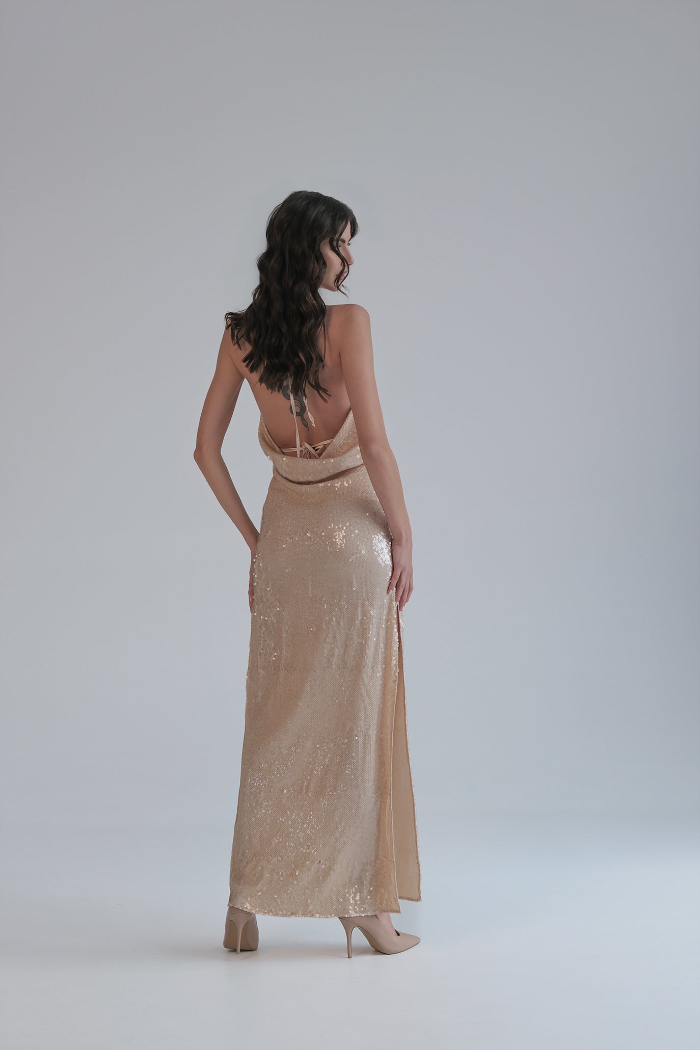 Рокля с изваян, женствен силует. Изработени от специален плат с безброй малки пайети, създаващ ослепителен ефект. С подплата, която е много приятна на допир към тялото. С изваян гол гръб и привлекателна висока цепка.