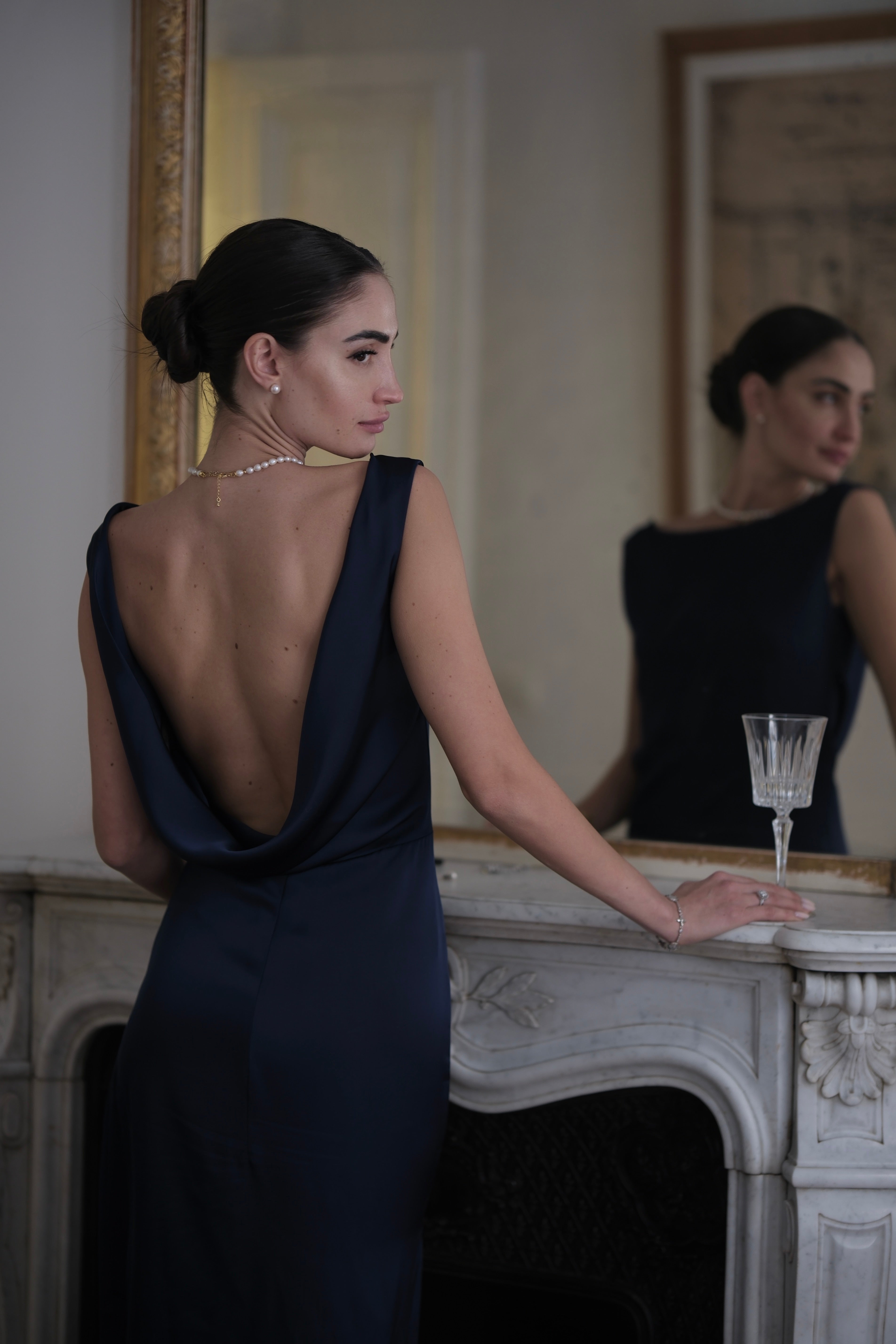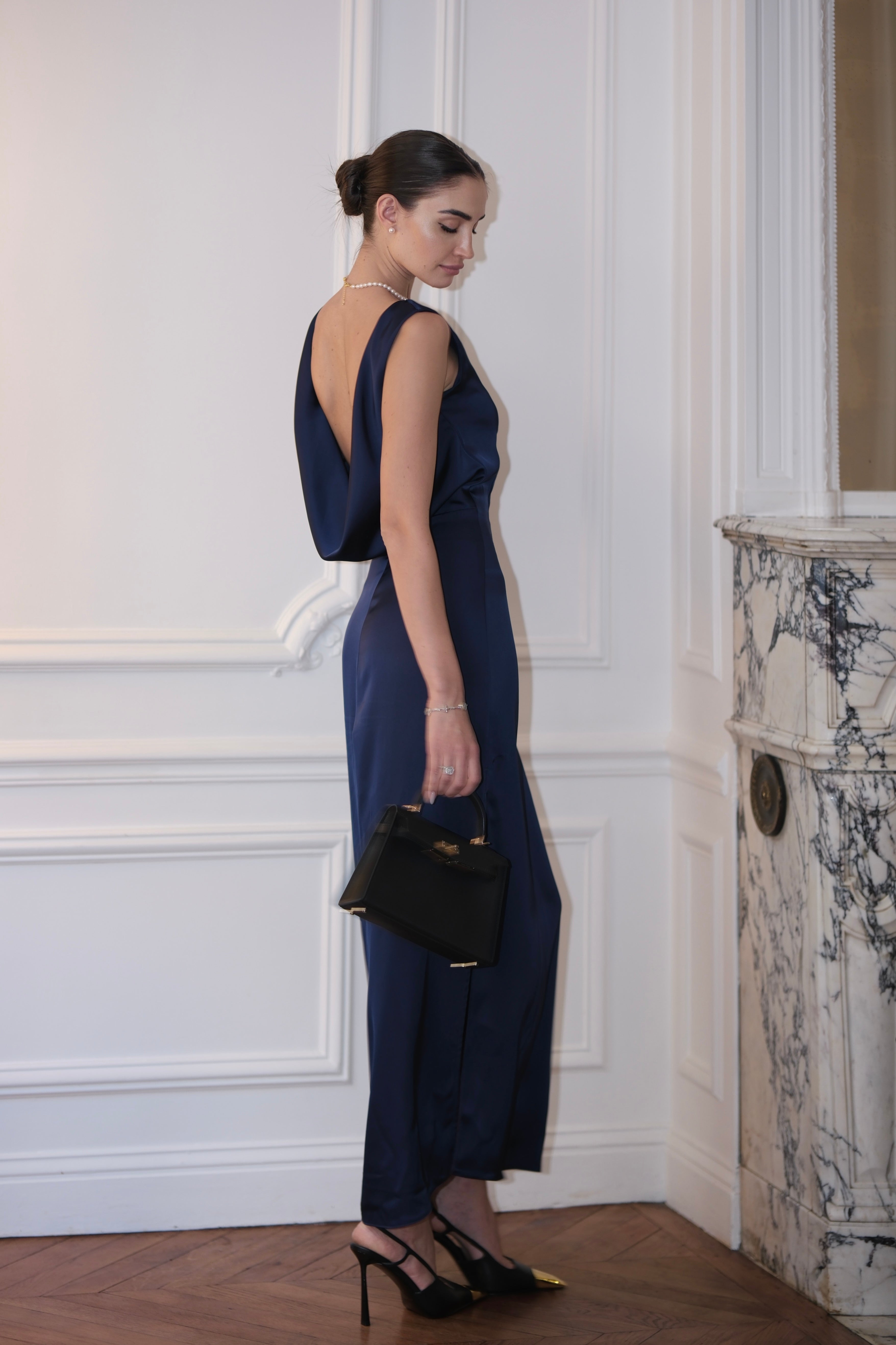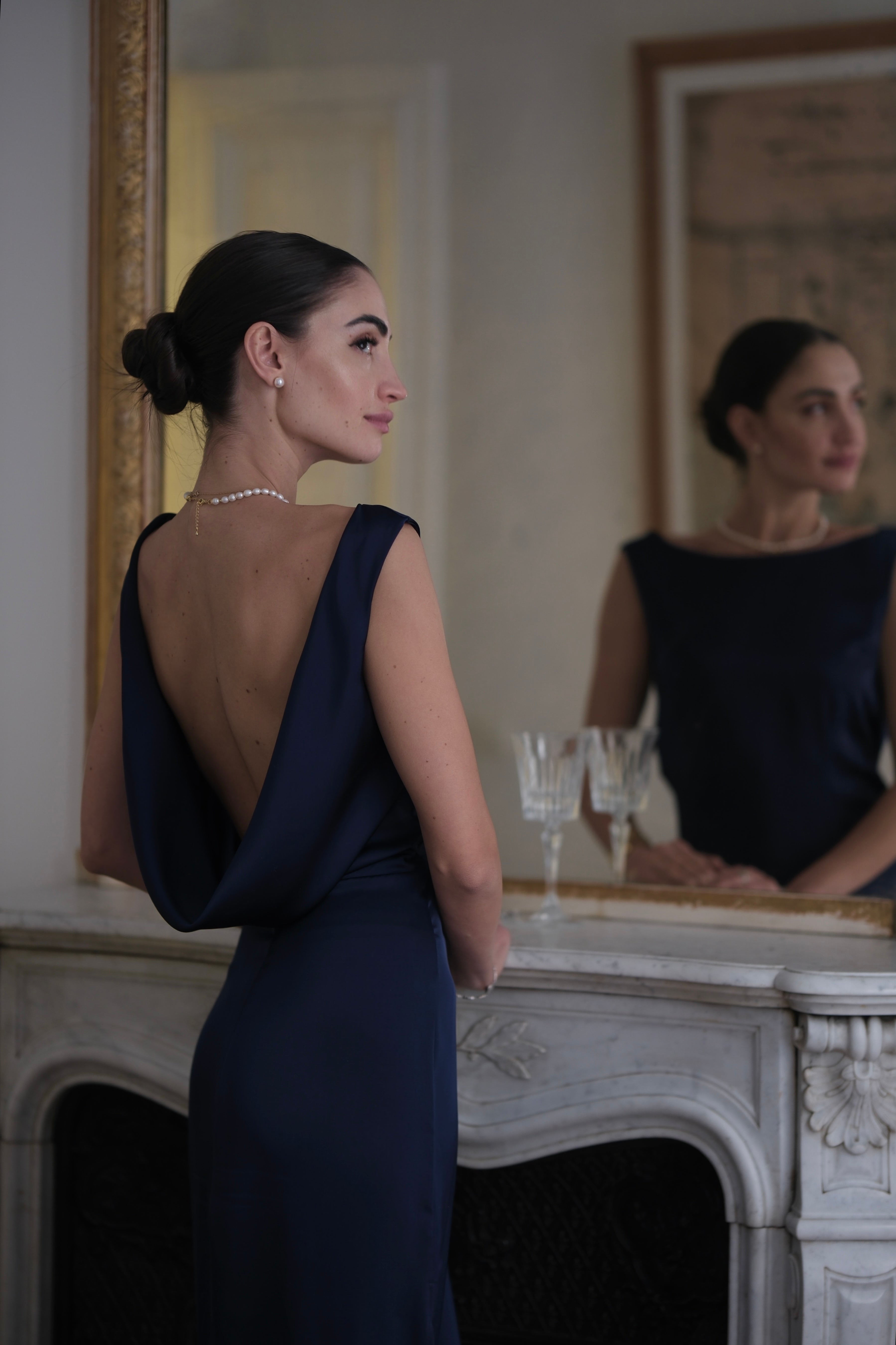 Елегантна дълга рокля с изчистен и издължаващ силует, кроен на верев, подчертаващ линията на тялото. Моделът е с класическо закрито деколте отпред и акцентен отворен гръб с мека падаща линия, който придава изтънченост и женственост. Материята е гладък сатен, фино падаща, осигуряваща комфорт и стил при движение. Има цип отстрани, благодарение на който се облича и съблича лесно и се подчертава талията.