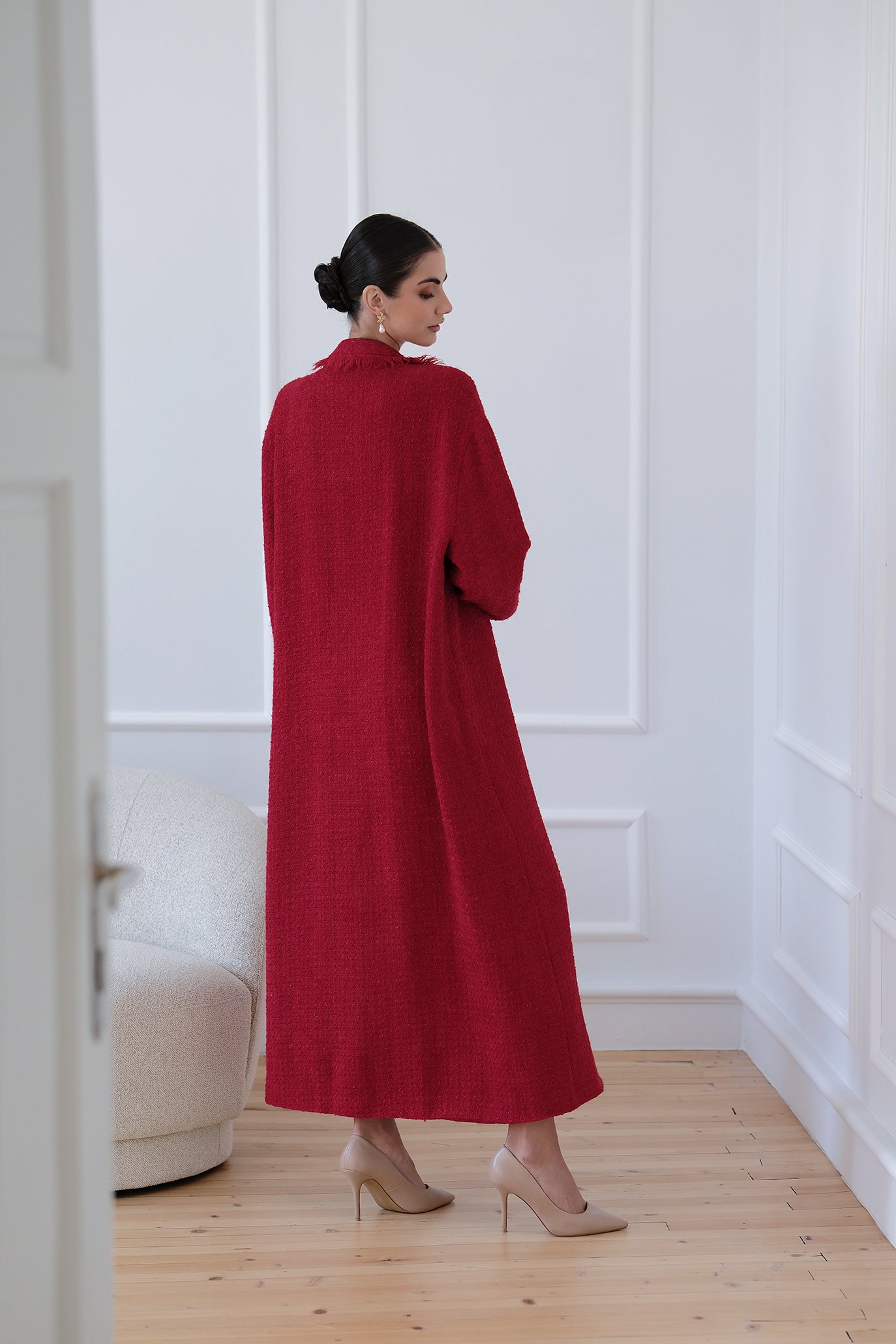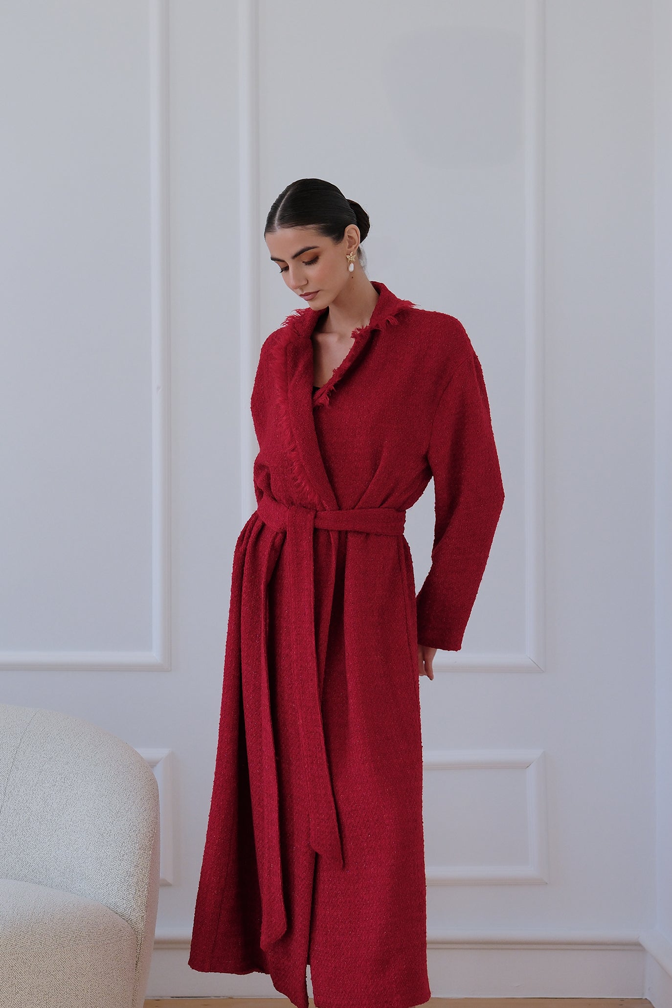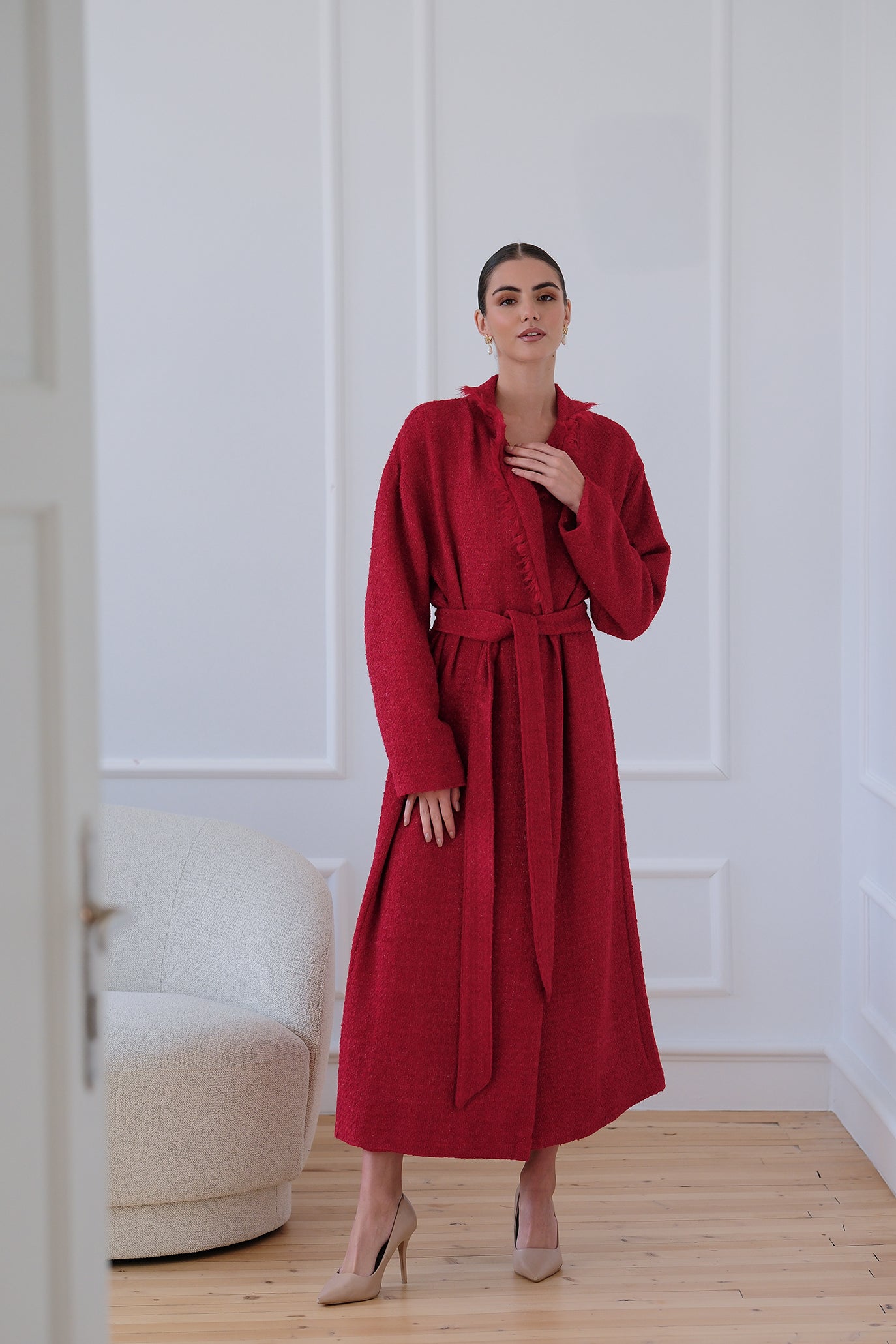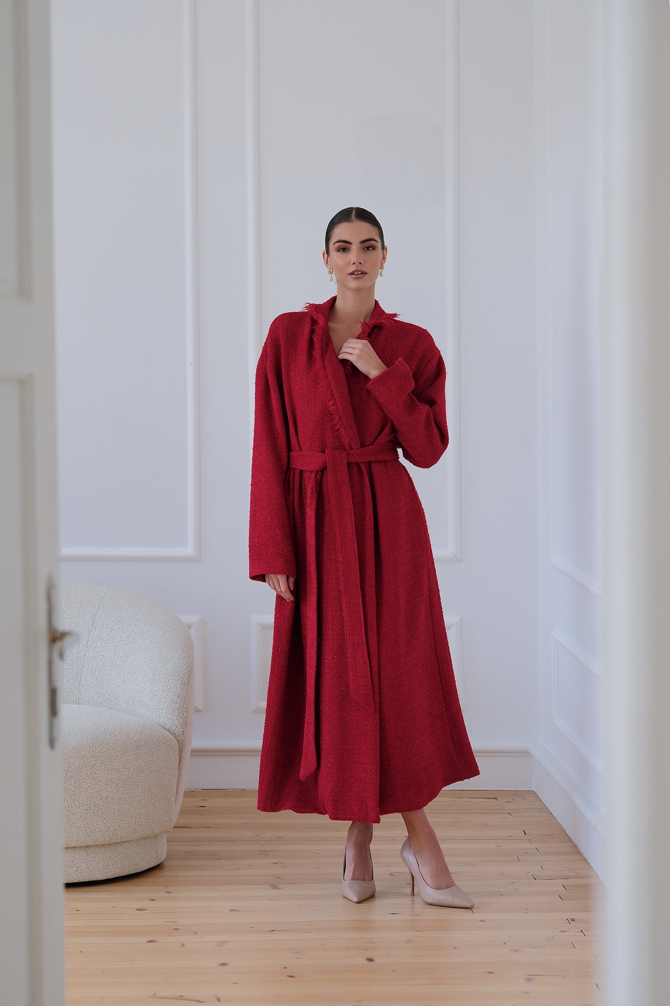 Комфортна и стилна дълга жилетка, изработена от плат тип букле. Дълъг ръкав, дължина до глезена и леко движение при всяка стъпка. Моделът е с прав силует и фино ресниран кант по краищата. Идеален завършек за нежна женствена визия.