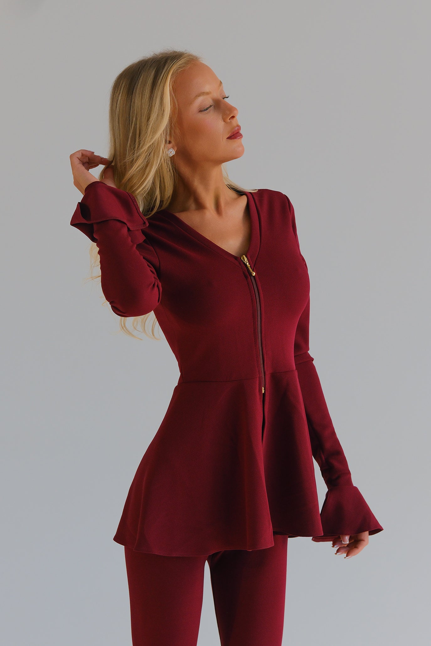 Сетът е създаден да моделира фигурата и да придава елегантен „пясъчен часовник“. Пеплумът балансира линията на ханша и визуално стяга талията, а детайлът от плат при глезена издължава крака и стои ефектно с ток или маратонка. Еластичната материя осигурява комфорт и прилягане.