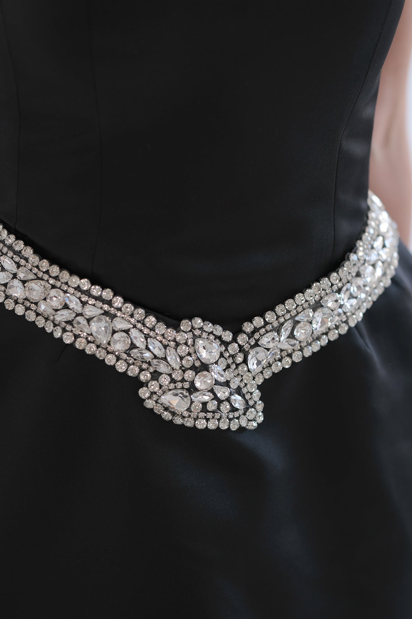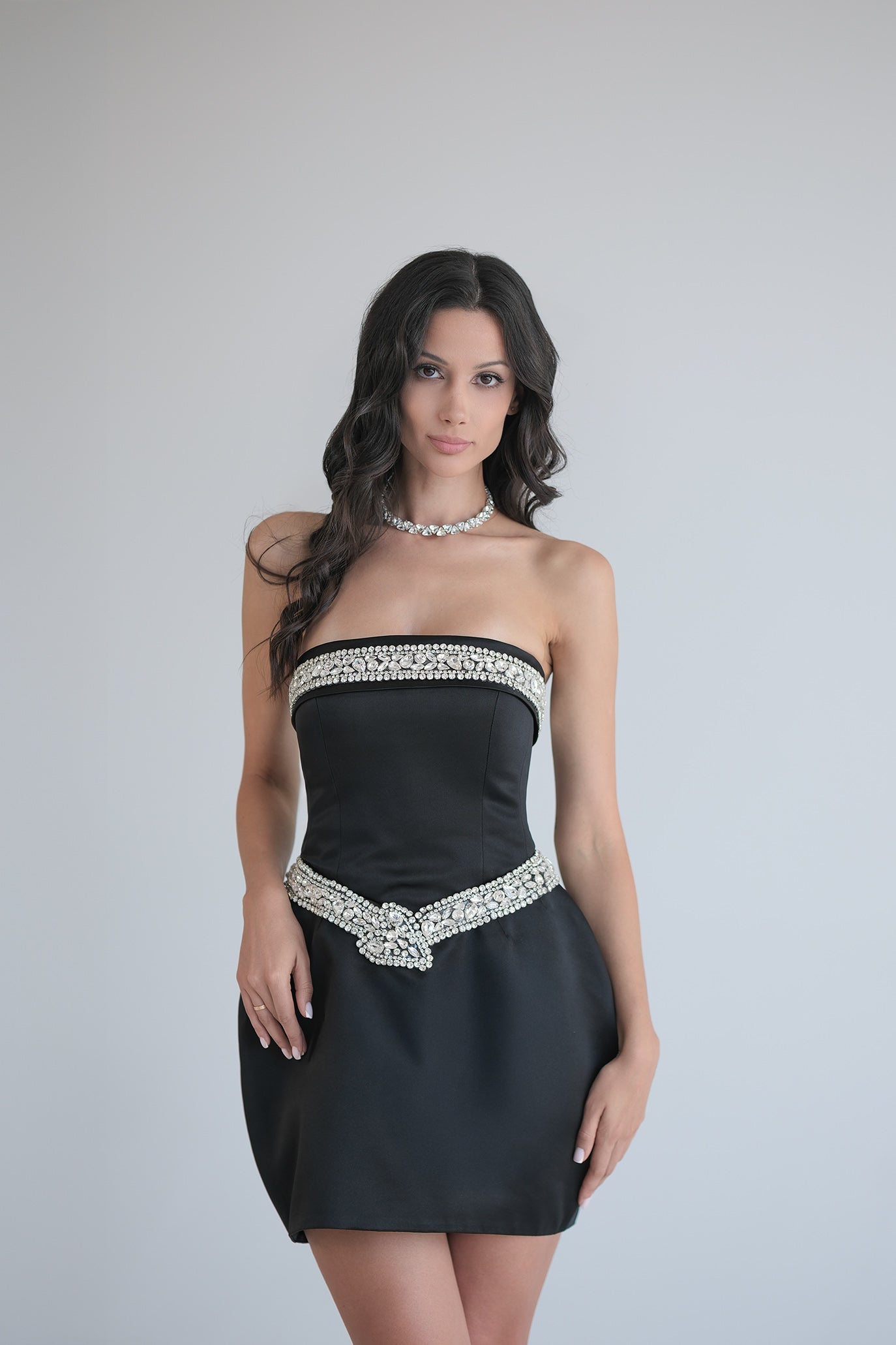 Луксозна, изцяло ръчно изработена къса рокля с нежни детайли от верижка блестящи кристали цирконий. Материята е висококачествена и плътна, благодарение на която долната част държи обемната си форма. Роклята е без презрамки, с вградени чашки. Отзад се закопчава с връзки. Може да бъде изработена според мерките на клиента срещу допълнително заплащане.