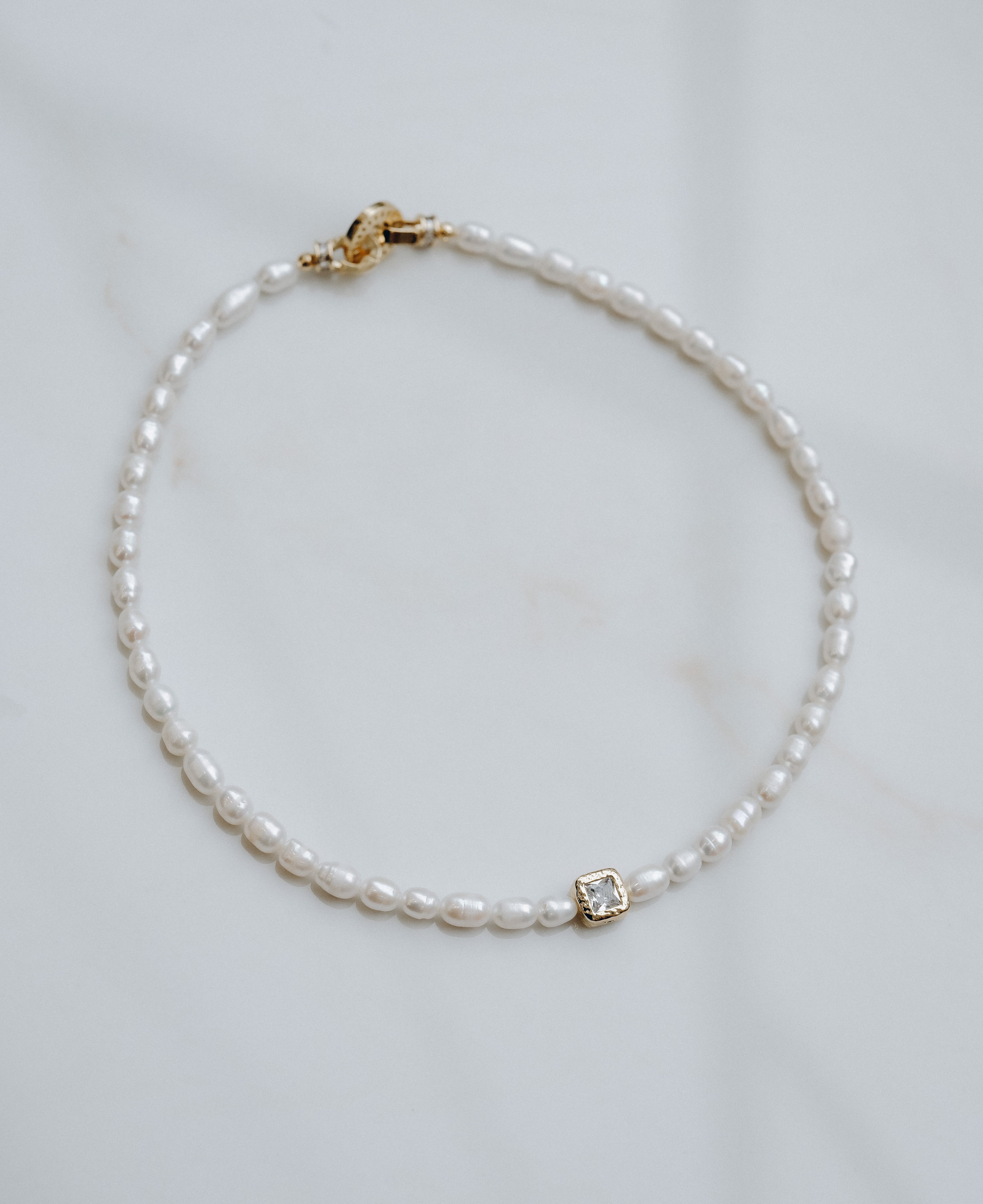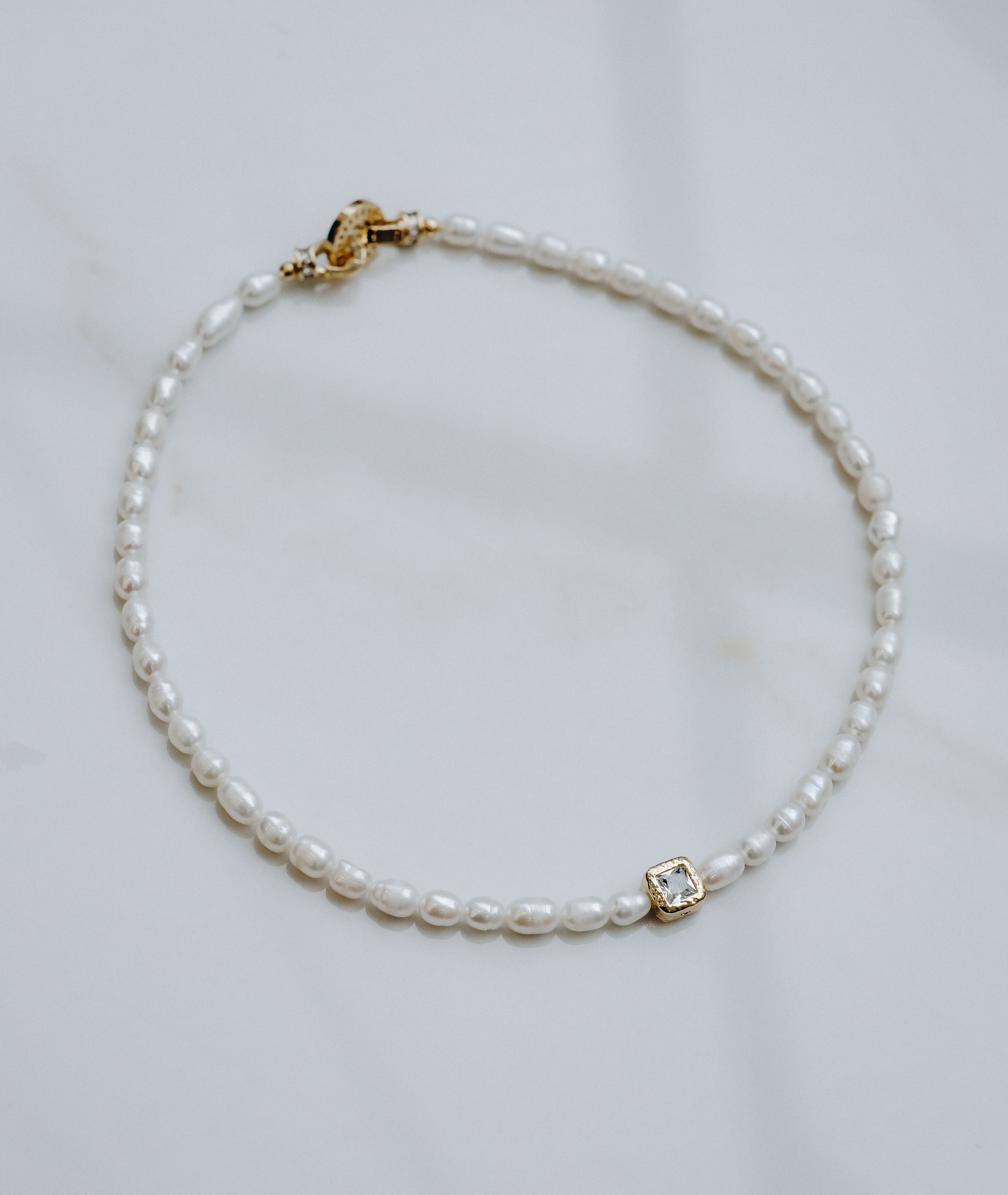 Материал – барокови перли от най-високо качество, квадратна мъниста с циркон и декоративна закопчалка с 24K позлата.