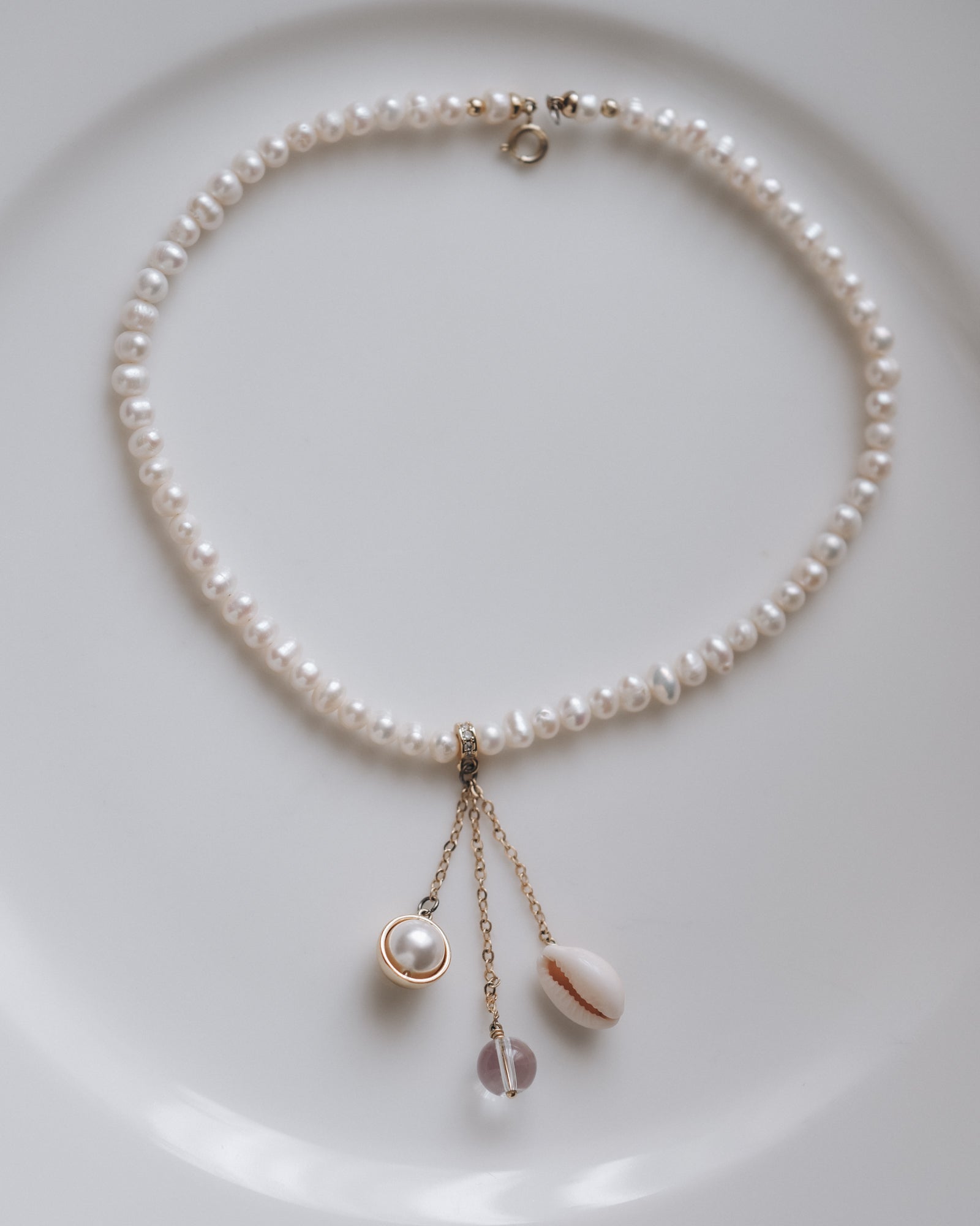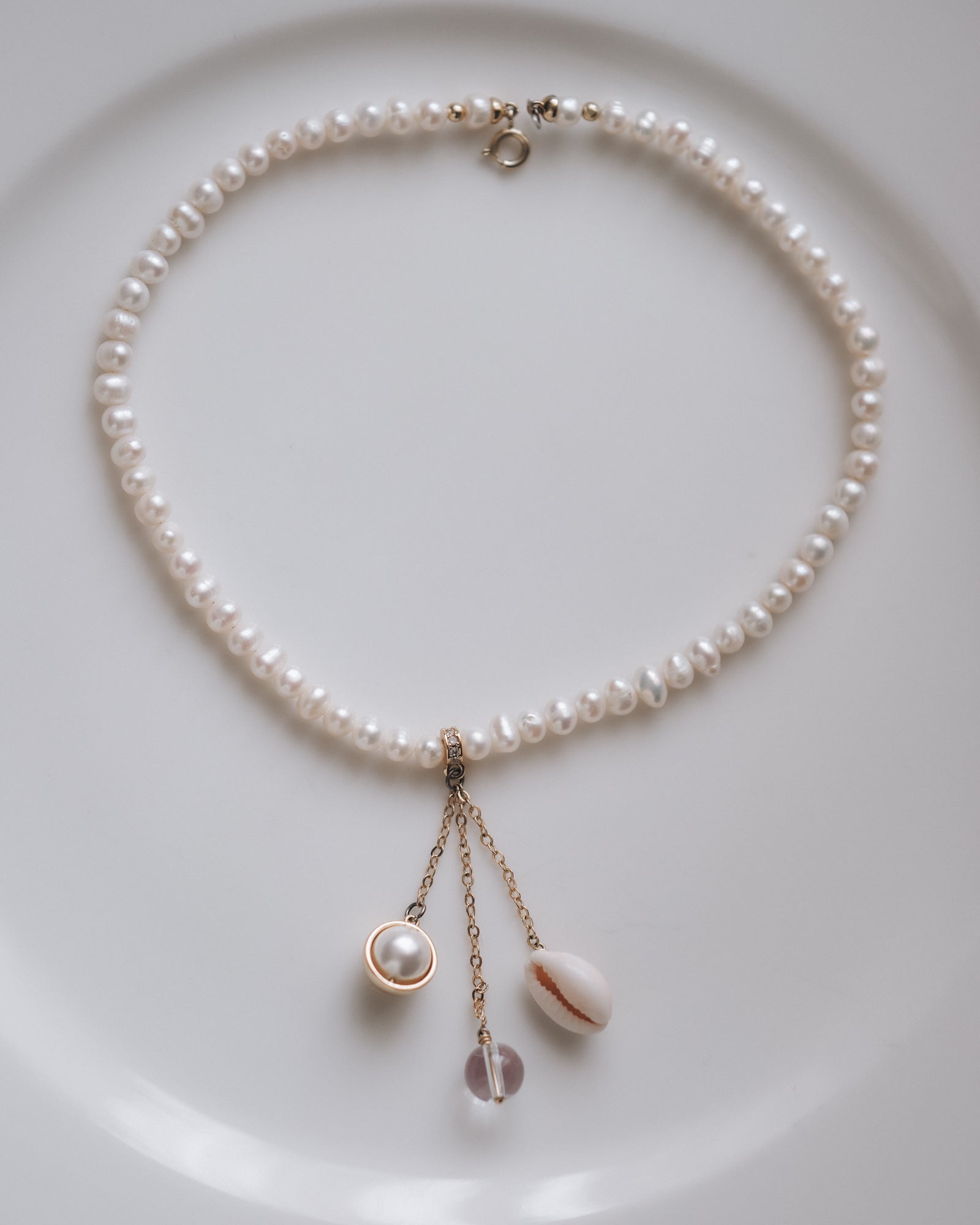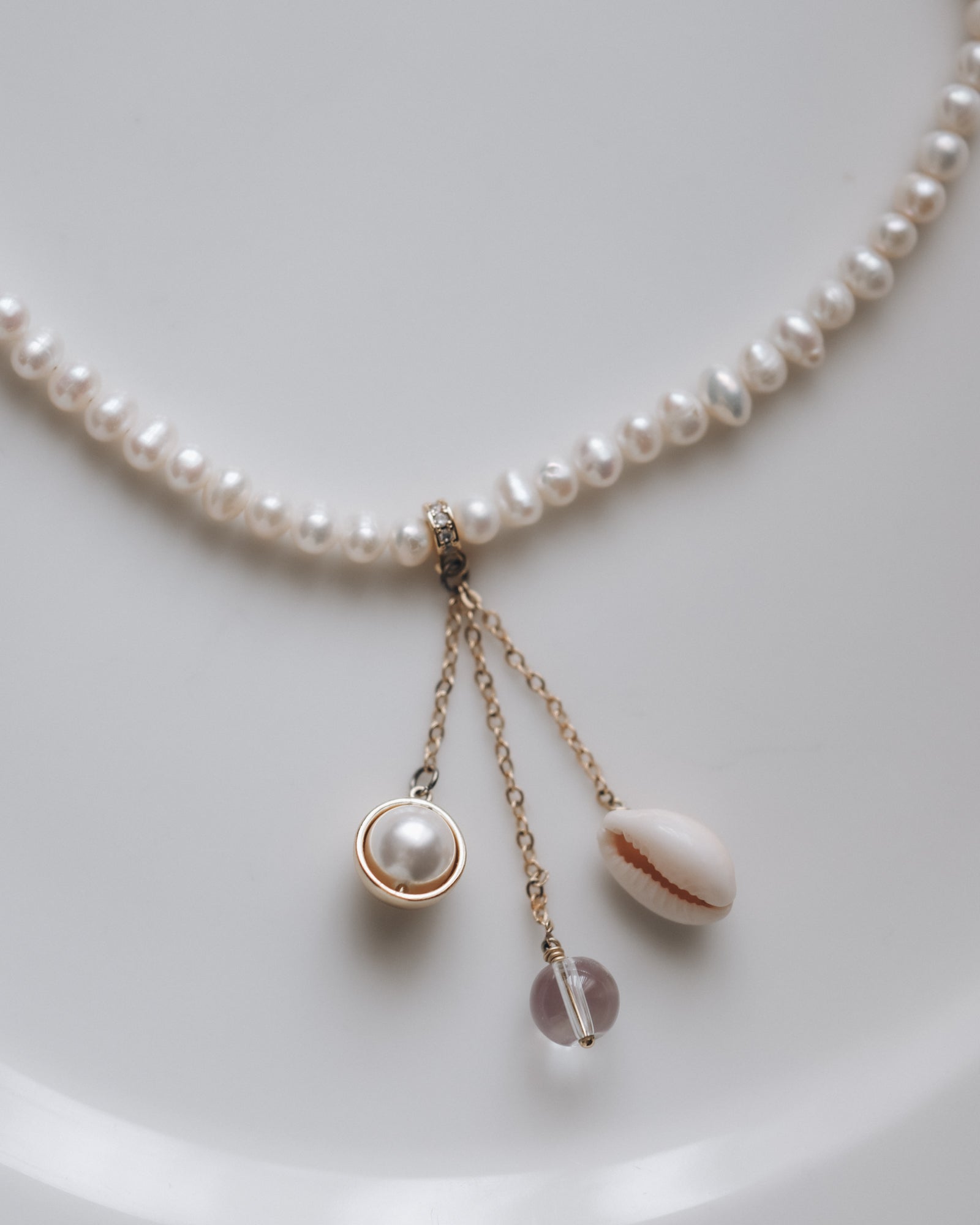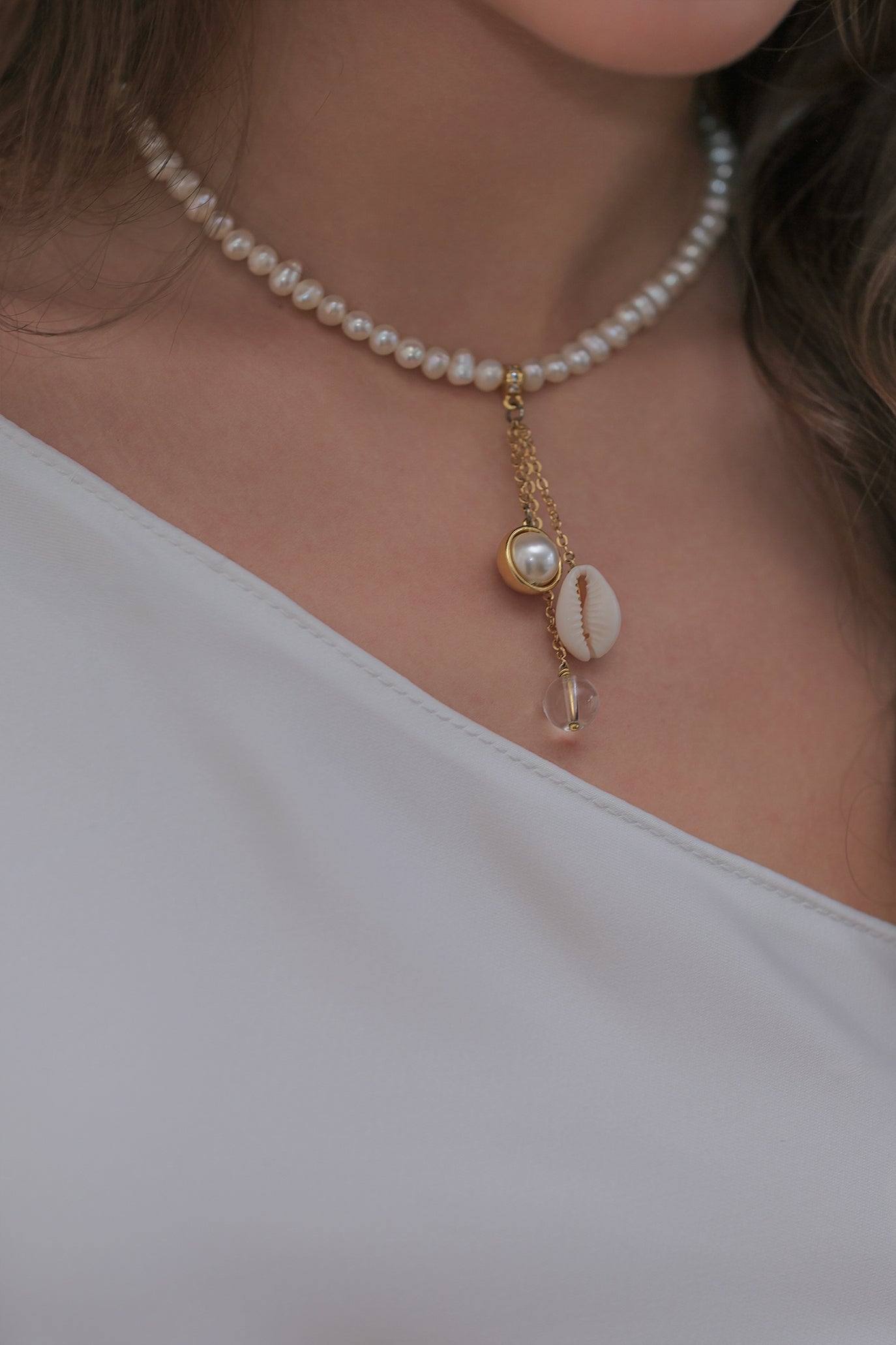 Елегантно перлено колие с фин златист акцент и декоративни висящи елементи, които придават деликатно движение. Колието е изработено от класически бели перли, нежно обгръщащи шията, допълнени от три висящи детайла – перла в златиста рамка, естествена мида и стъклен елемент, създаващи балансиран и отличителен акцент. Моделът е подходящ както за официални поводи, така и за стилни вечерни визии.