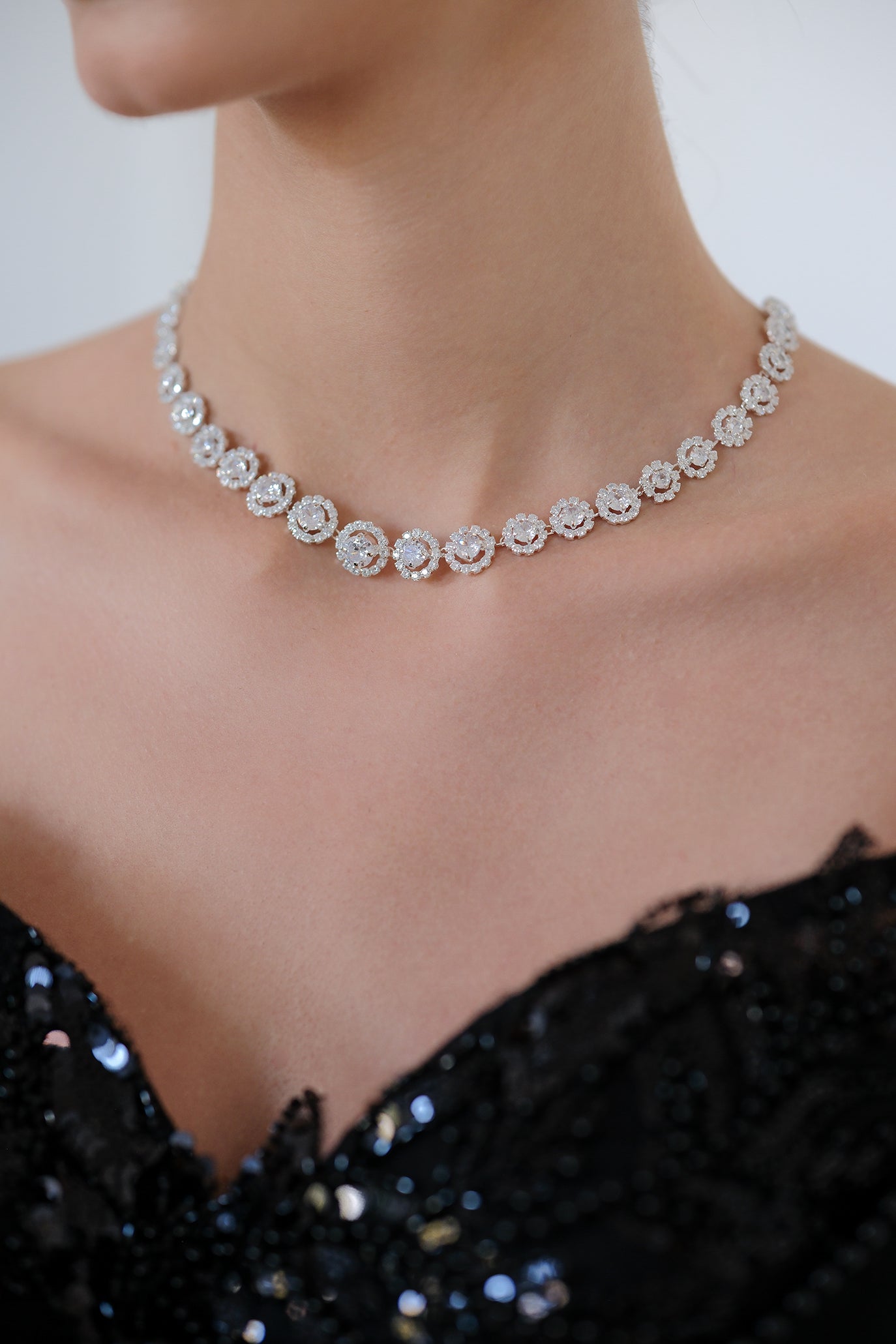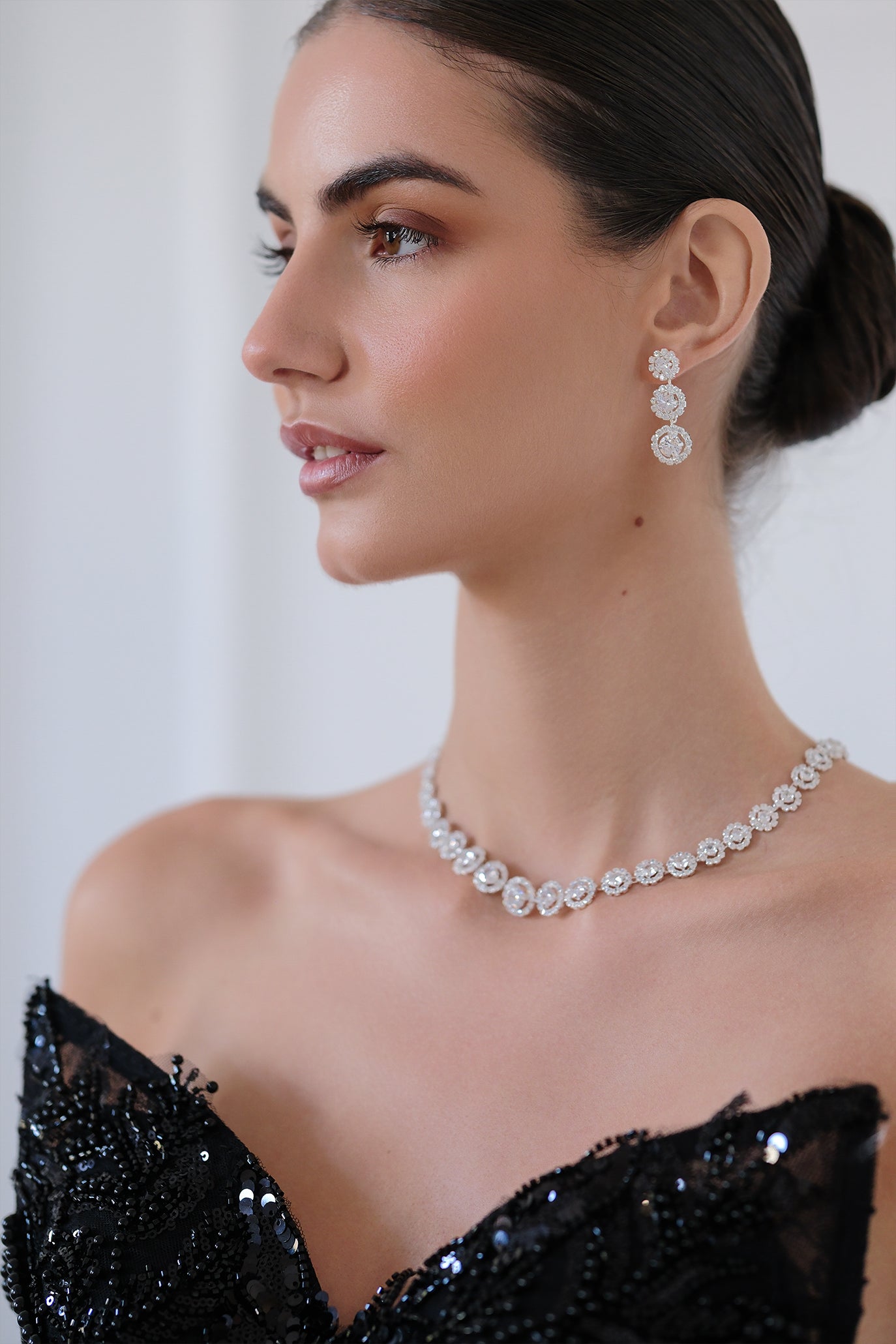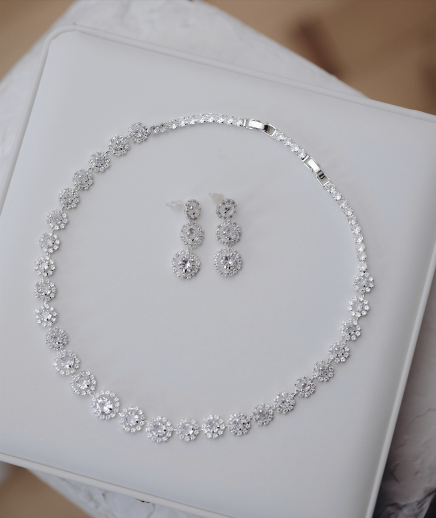 Елегантен комплект колие и обеци, изработен с внимание към всеки детайл. Деликатните кристали цирконий създават впечатляващ блясък, който улавя светлината от всеки ъгъл. Колието прилепва изящно по врата, а обеците с три висящи елемента придават изтънчена грация и завършеност на визията.