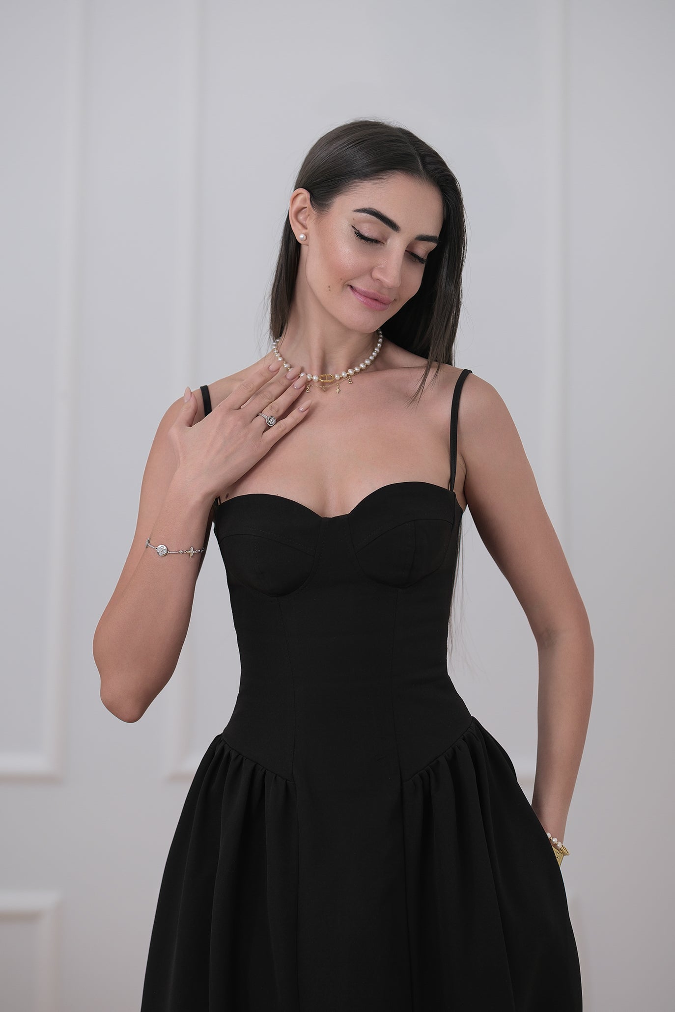 Елегантна миди рокля с корсетна горна част, която красиво оформя бюста и подчертава талията. Фините презрамки придават женственост и лекота. Има и джобове за още по-голямо удобство.