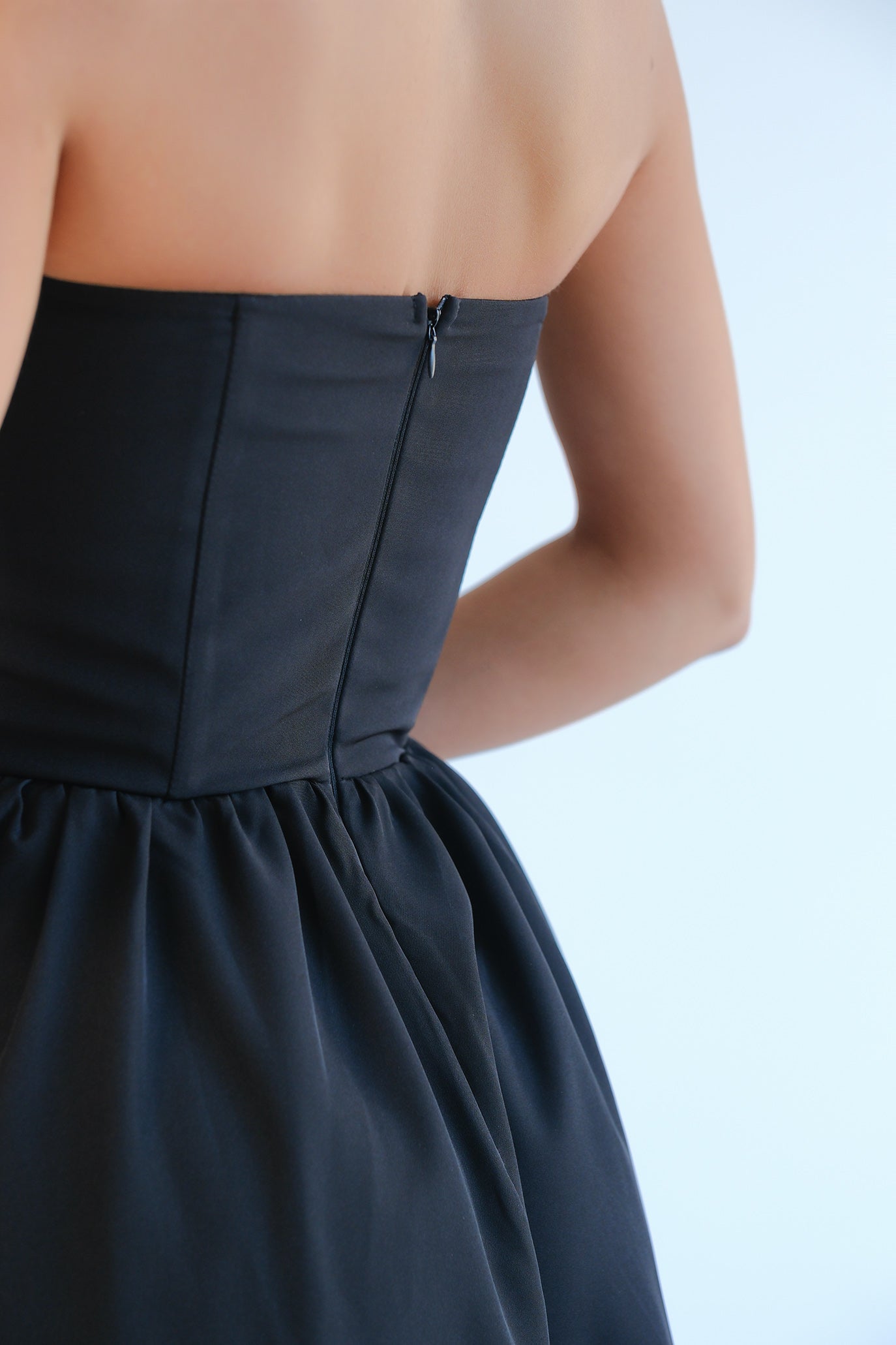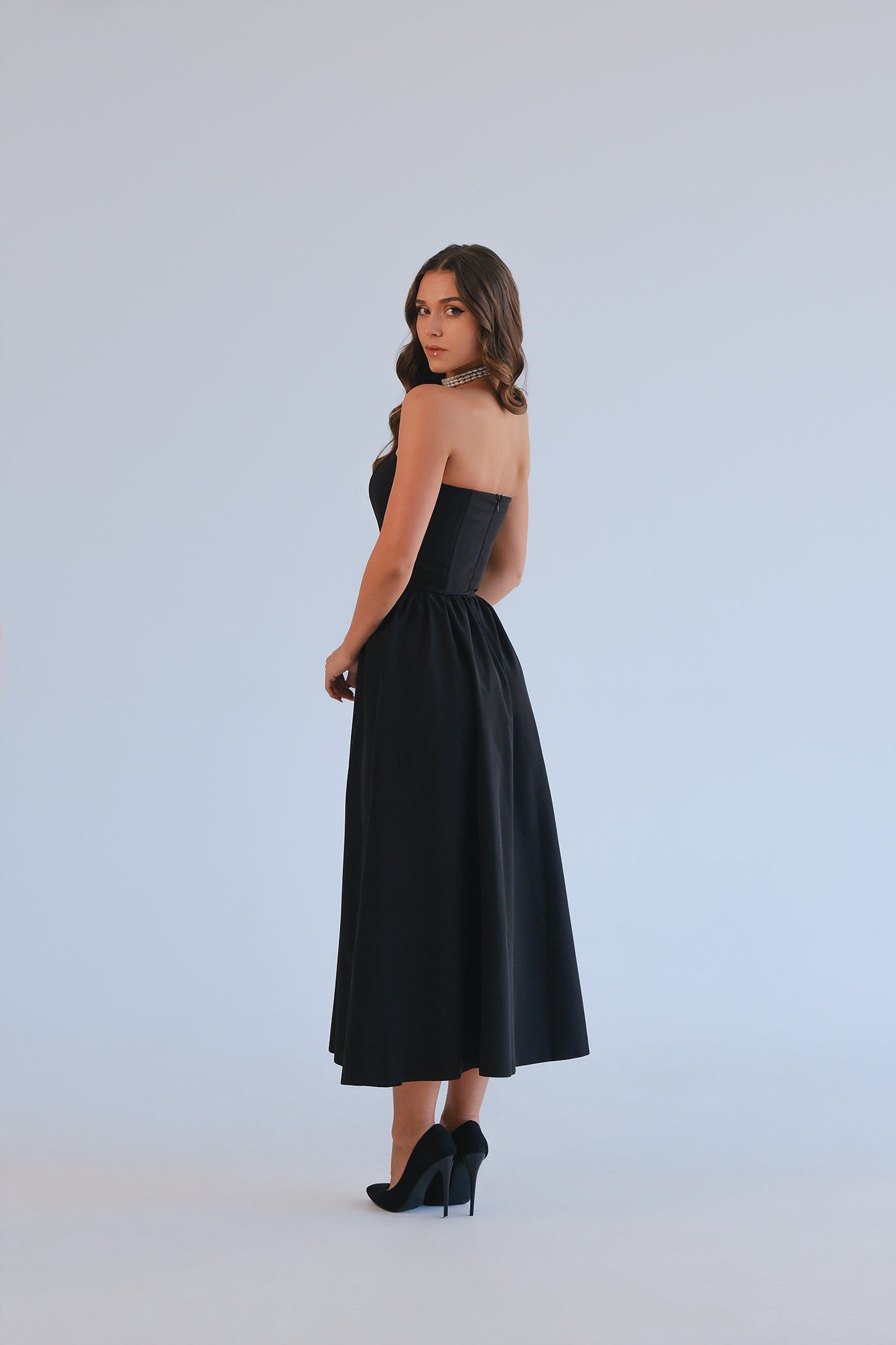 Минималистична, но впечатляваща рокля със съвременен силует. Горната част е тип бюстие със стабилна вътрешна конструкция, която прибира и оформя бюста, а V-образният шев към талията визуално издължава фигурата. Полата е с меки гънки, които придават обем и движение, падащи до елегантна миди дължина. Моделът е изработен от плътна, меко падаща материя с лек еластичен комфорт.