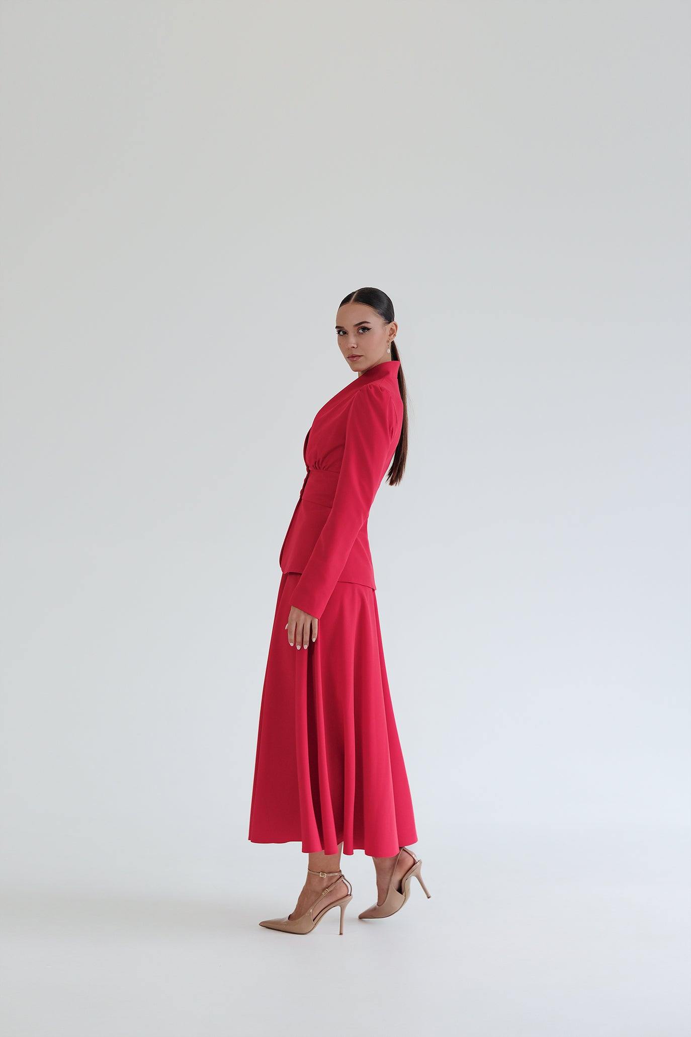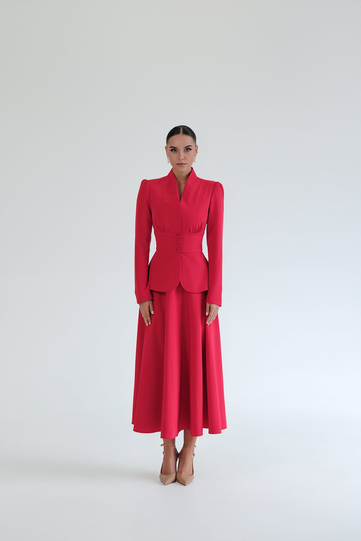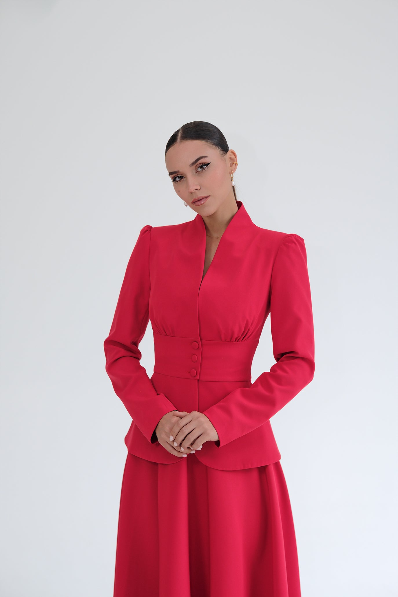 Променете визията си с този елегантен сет от пола и блуза-сако. Горната част е с елегантно деколте и е оформена с деликатни плисирани детайли, които подчертават тялото и придават структура. Долната част е с лека и ефирна пола с разкроен силует, който осигурява комфорт и свобода на движенията. Моделът е завършен с три декоративни копчета на талията, които добавят допълнителен акцент и елегантност. За перфектния завършек на визията, комбинирайте със стилни обувки на висок ток. Продава се само в комплект.