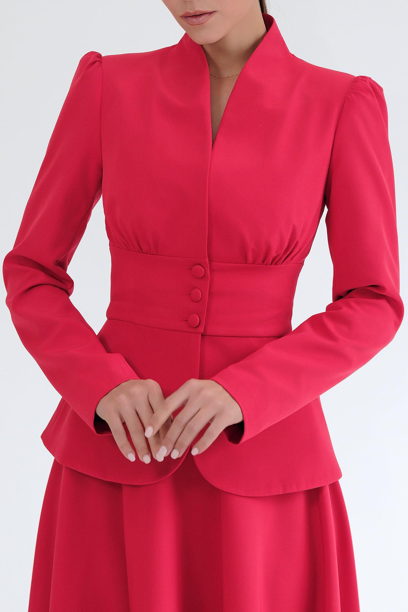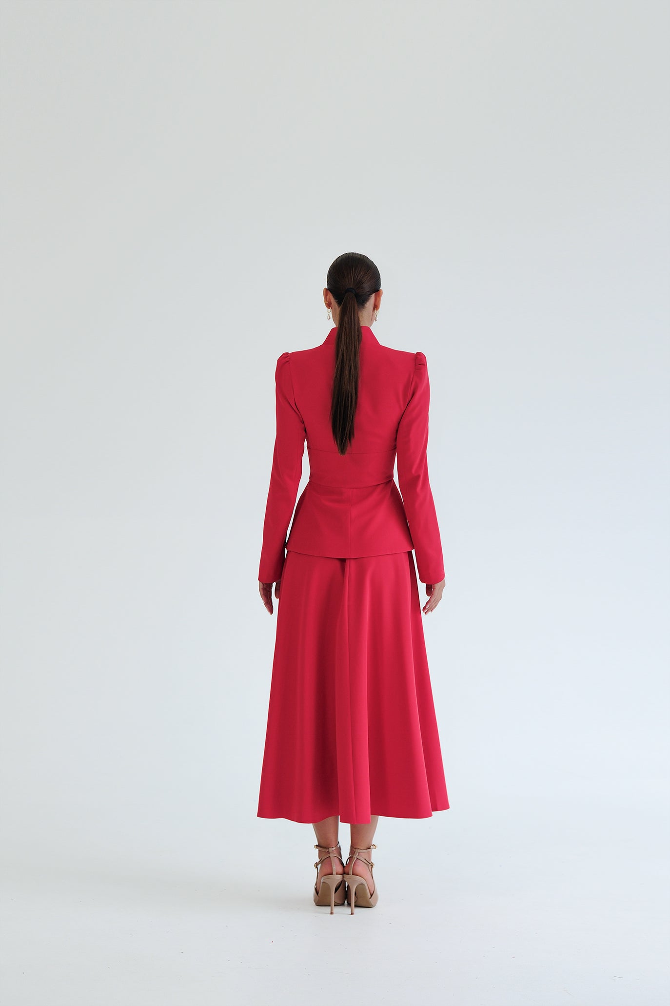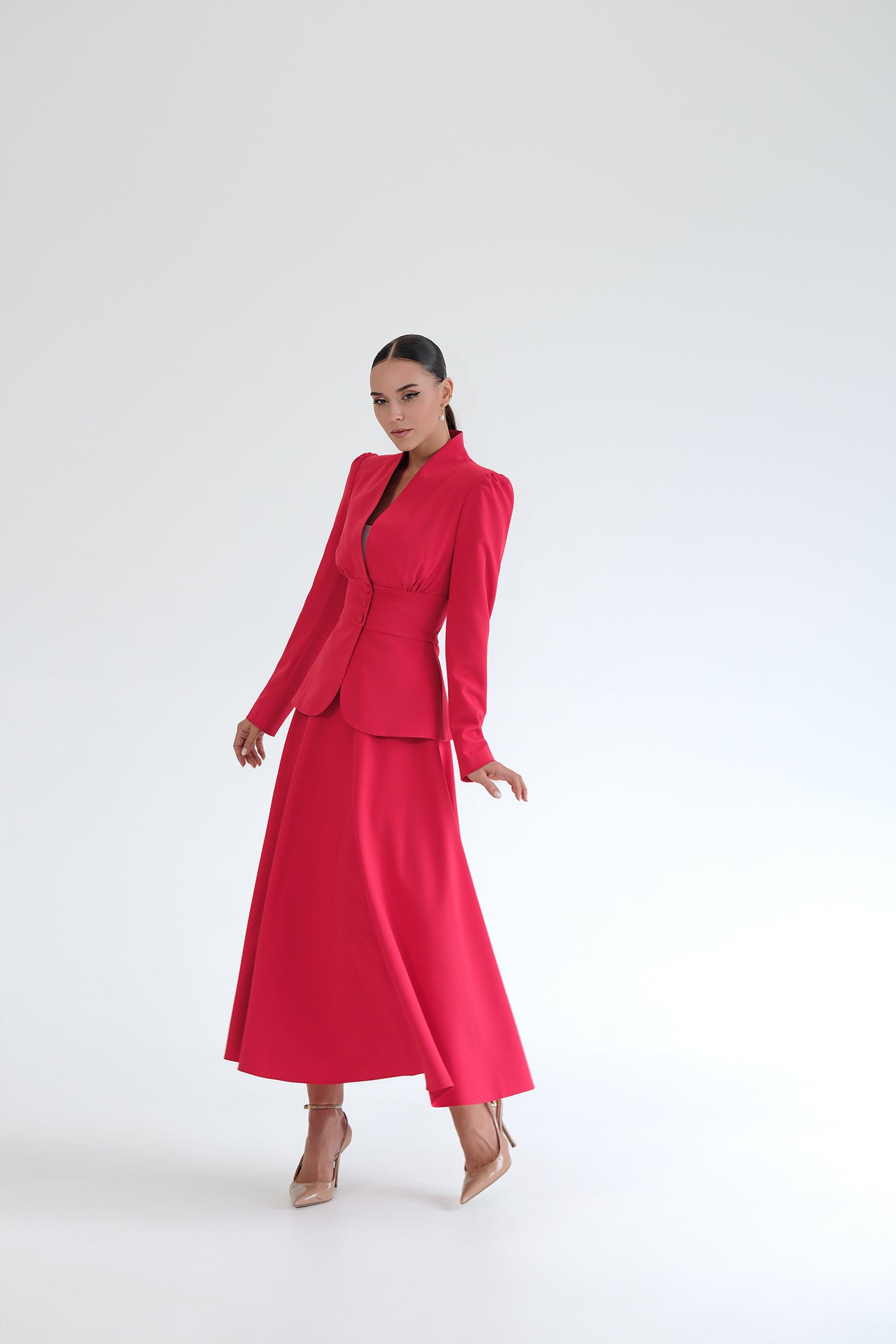 Променете визията си с този елегантен сет от пола и блуза-сако. Горната част е с елегантно деколте и е оформена с деликатни плисирани детайли, които подчертават тялото и придават структура. Долната част е с лека и ефирна пола с разкроен силует, който осигурява комфорт и свобода на движенията. Моделът е завършен с три декоративни копчета на талията, които добавят допълнителен акцент и елегантност. За перфектния завършек на визията, комбинирайте със стилни обувки на висок ток. Продава се само в комплект.