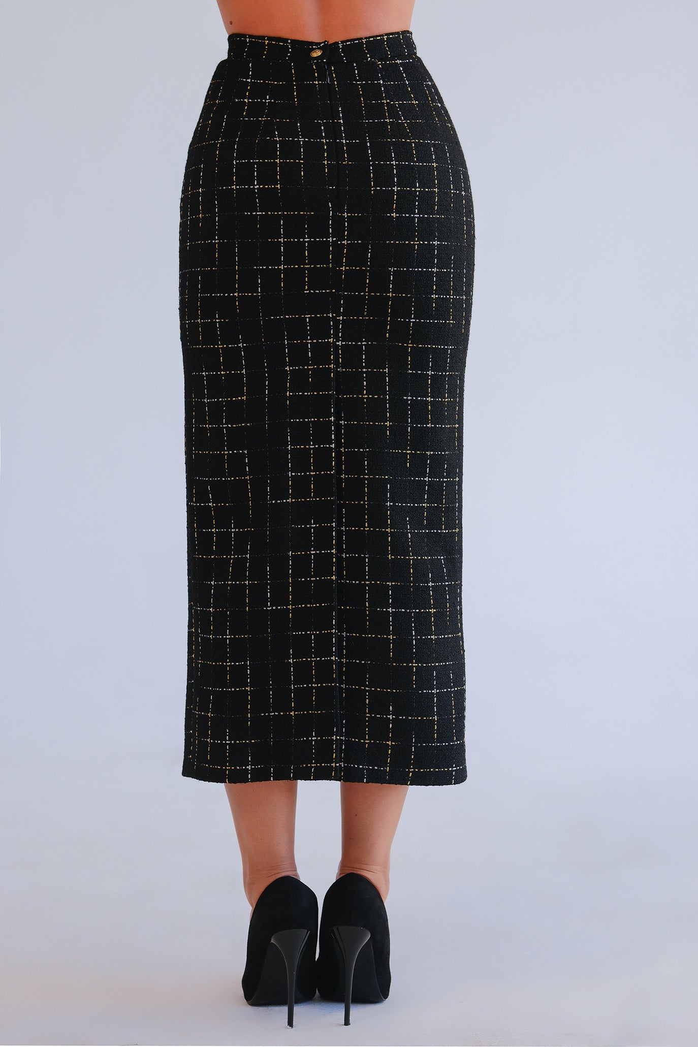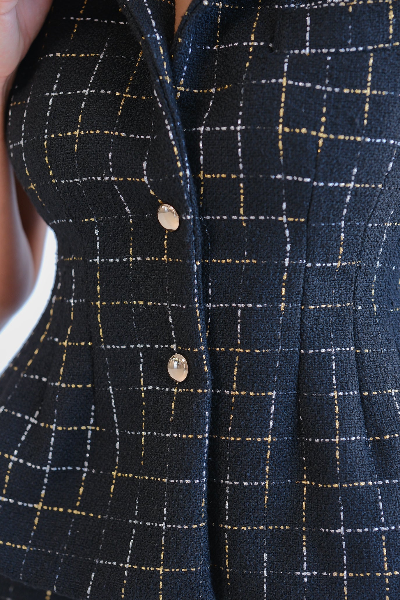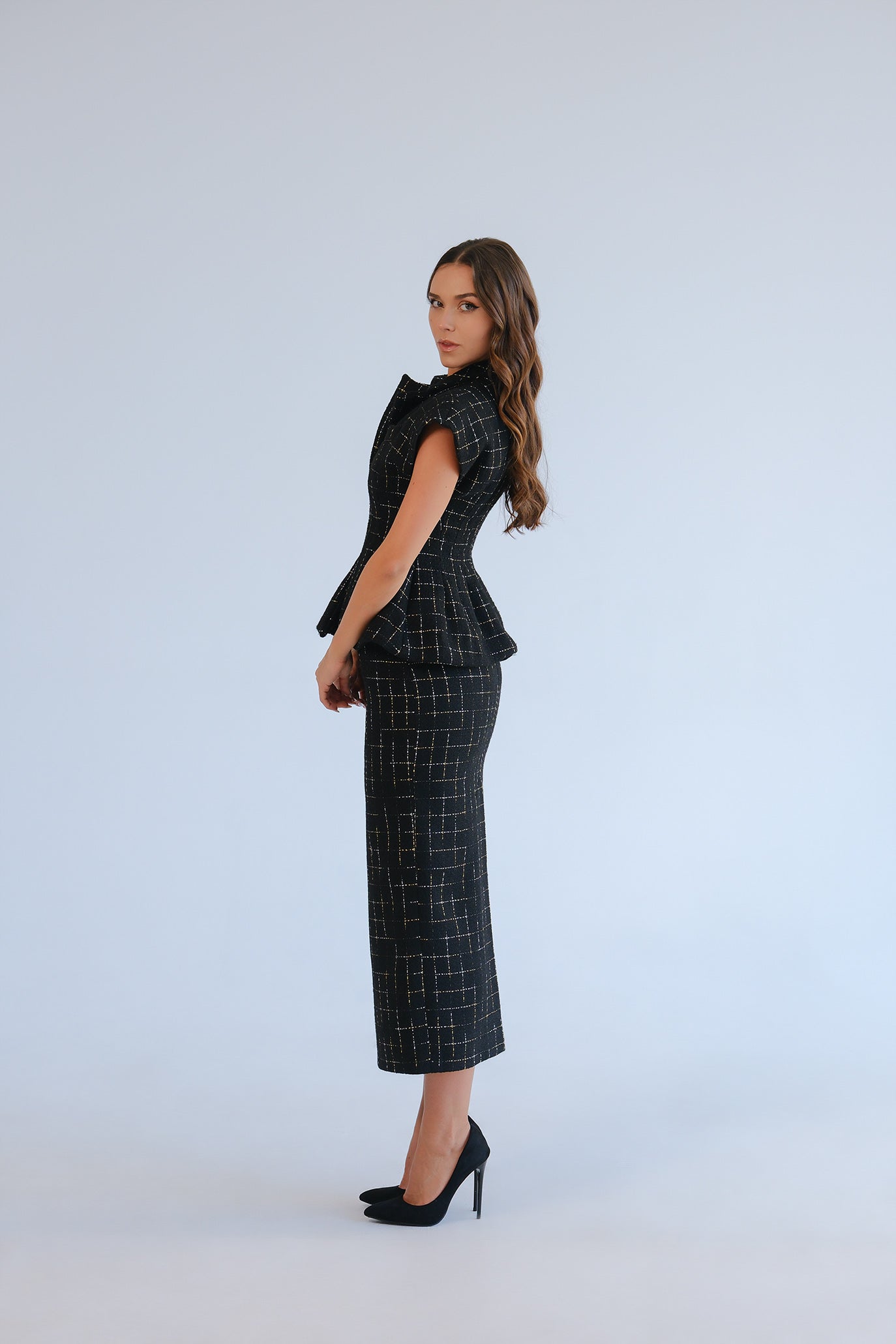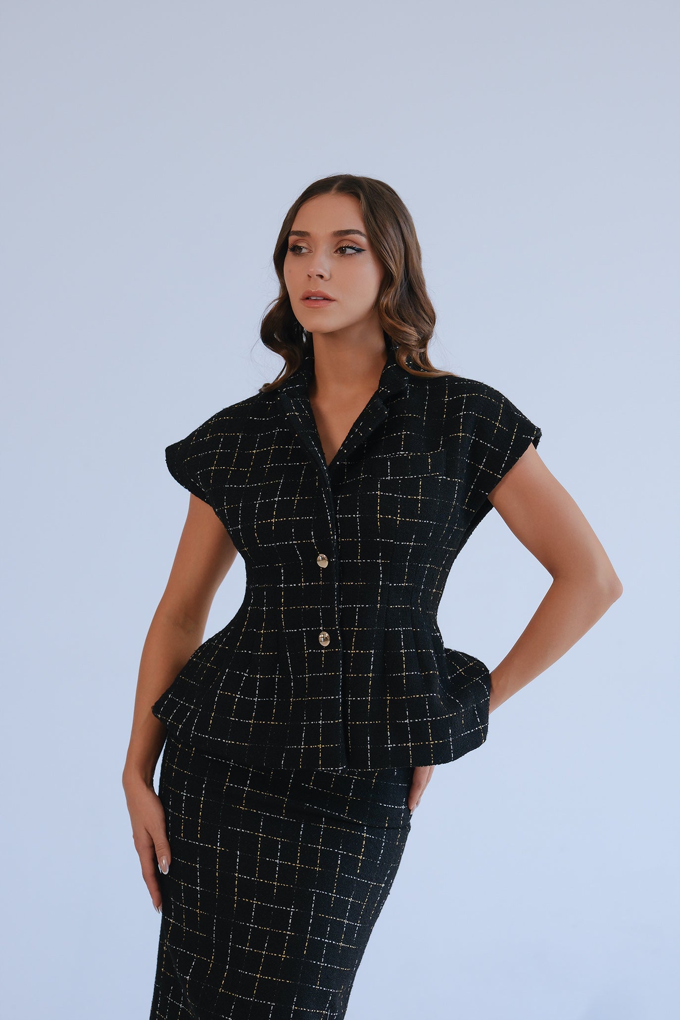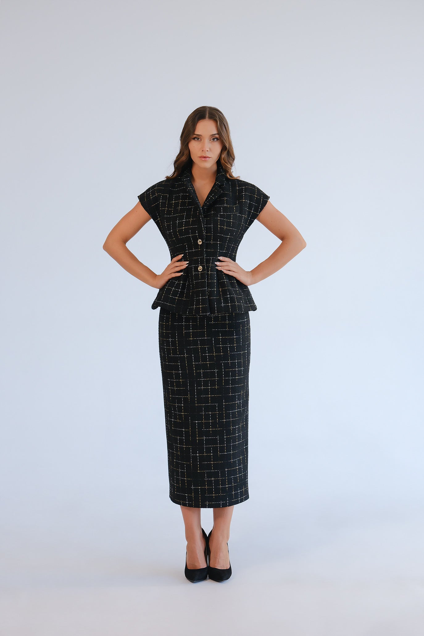Елегантен комплект от букле. Елегантно сако / елек без ръкави, изработено от висококачествен текстил с черно-бял каре дизайн и леко златисти нишки, придаващи изисканост и стил. Сакото е с класическа яка и силует, който подчертава талията и създава женствена линия. Закопчаването отпред с копчета допълва изискания вид, като същевременно предлага удобство и комфорт. Може да се носи както като самостоятелна дреха, така и върху друга такава. Полата е тип „молив“ с висока талия и миди дължина, която издължава фигурата. Акцентирани златисти копчета и прецизни декоративни шевове придават луксозно излъчване. Материята е стабилна и държи форма, с ниска еластичност – подходяща за официални поводи, офис и коктейл.