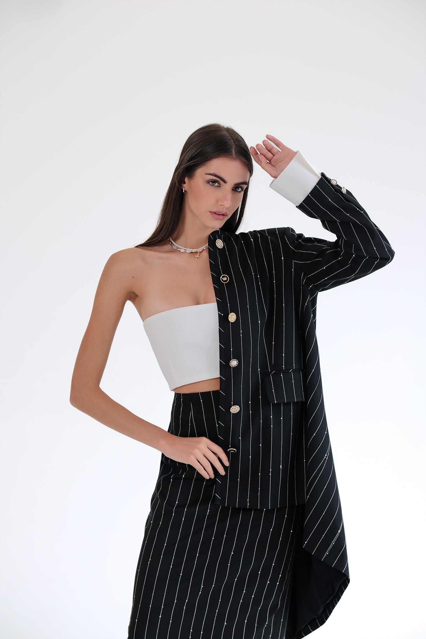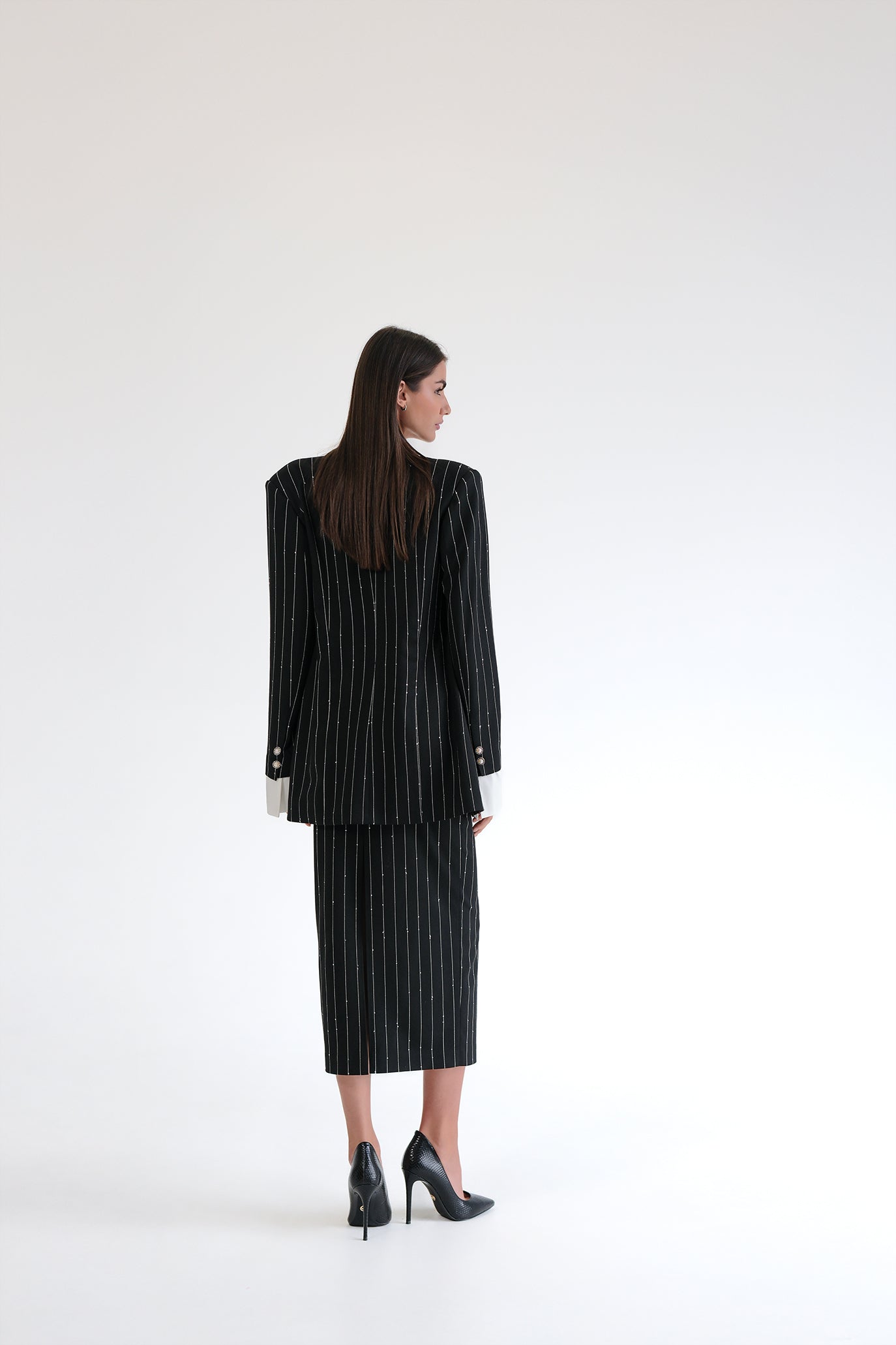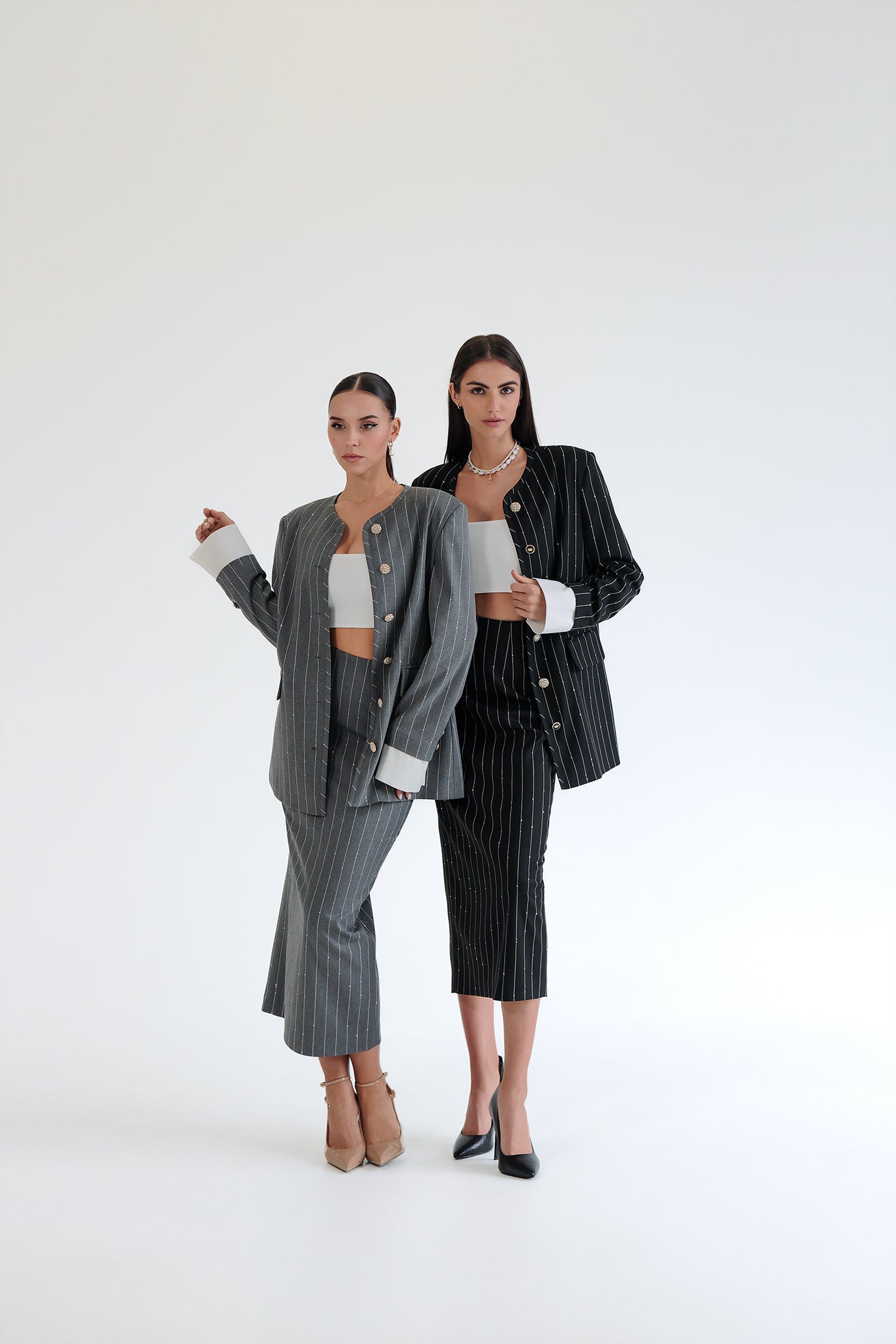 Костюм от две части, състоящ се от сако и пола молив. Сакото е с леко втален прав силует, без ревери и с контрастни маншети, които подчертават линията на ръкавите. Върху маншетите може да се персонализира с бродиране срещу допълнително заплащане. Елегантните метални копчета и мини пайетите, пришити в райетата, придават завършен луксозен акцент. Полата е с права линия и удобна дължина „миди“ – идеална както за официални поводи, така и за стилни дневни визии.