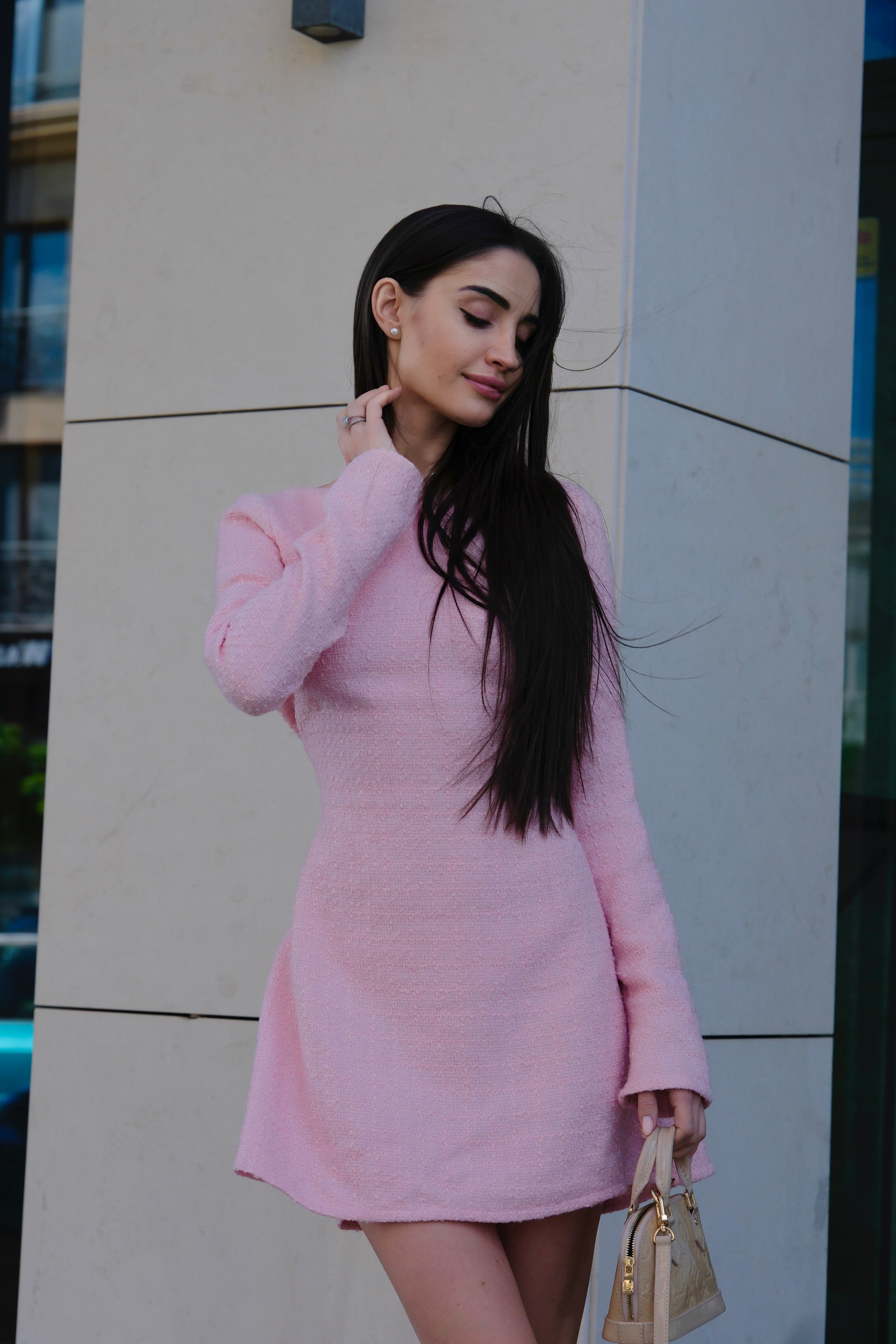 Рокля, която стопля есенните дни като прегръдка. Изработена от висококачествена материя, подобна на букле, която е изключително мека. Визията излъчва неподражаема класа с деколтето с паднало рамо и дълбокият гръб тип "водопад". Отзад се пристяга с връзки, което не само персонализира удобството, но и подчертава талията.