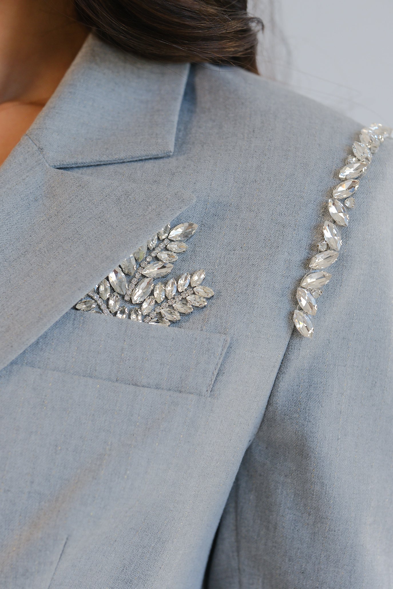 Сако за модерна, женствена версия. Късото сако е със скулптурирани реверни и метални копчета оформя раменете и подчертава талията. Материята е с плътност и еластичност за добро прилягане без ограничение в движенията. Има бляскав акцент на страничния джоб и раменете с ръчно пришити камъни, които са залепени върху основа и след това пришити към сакото.