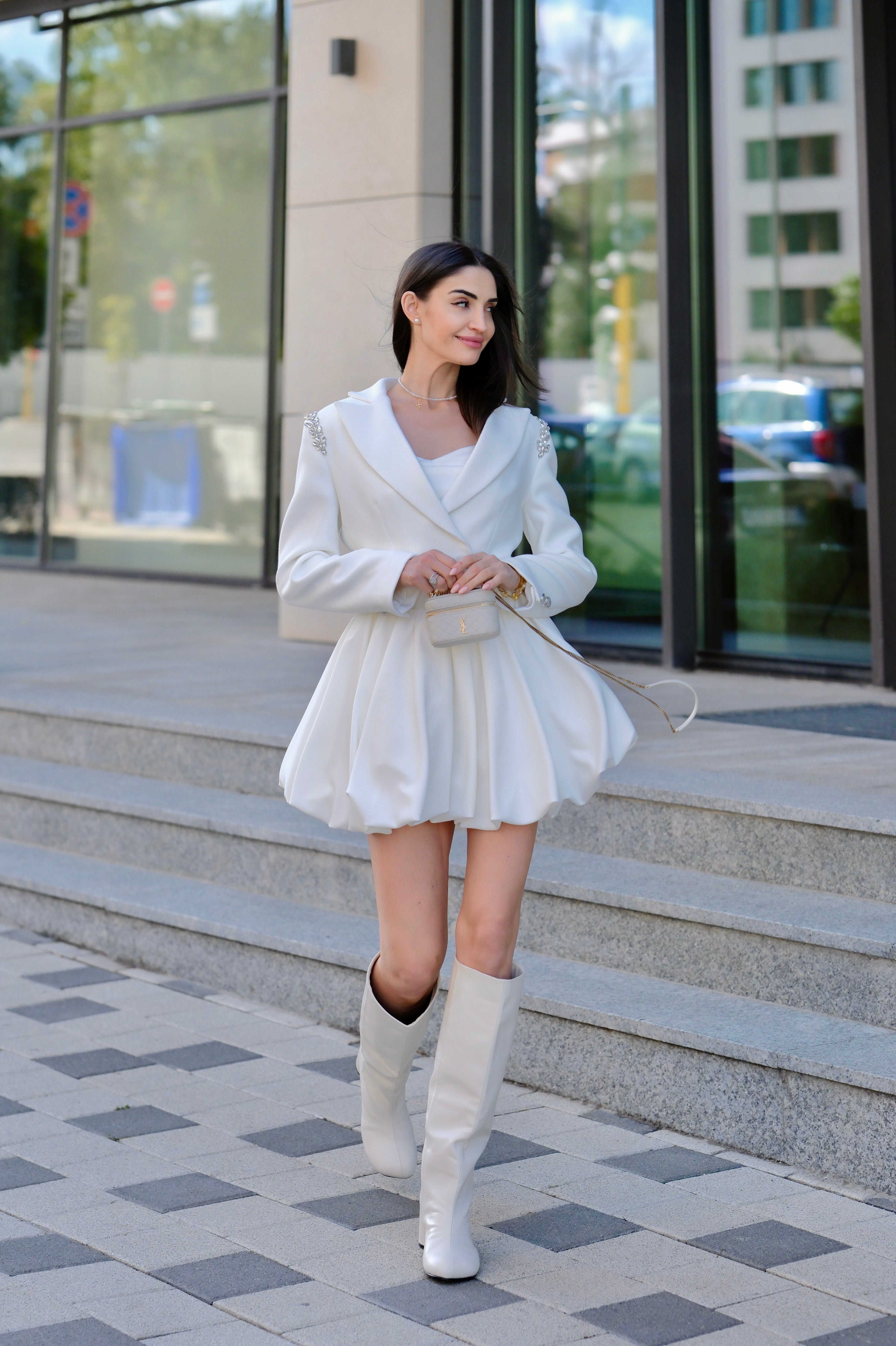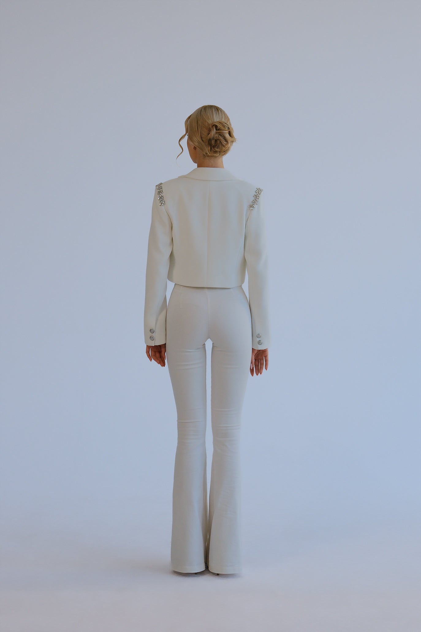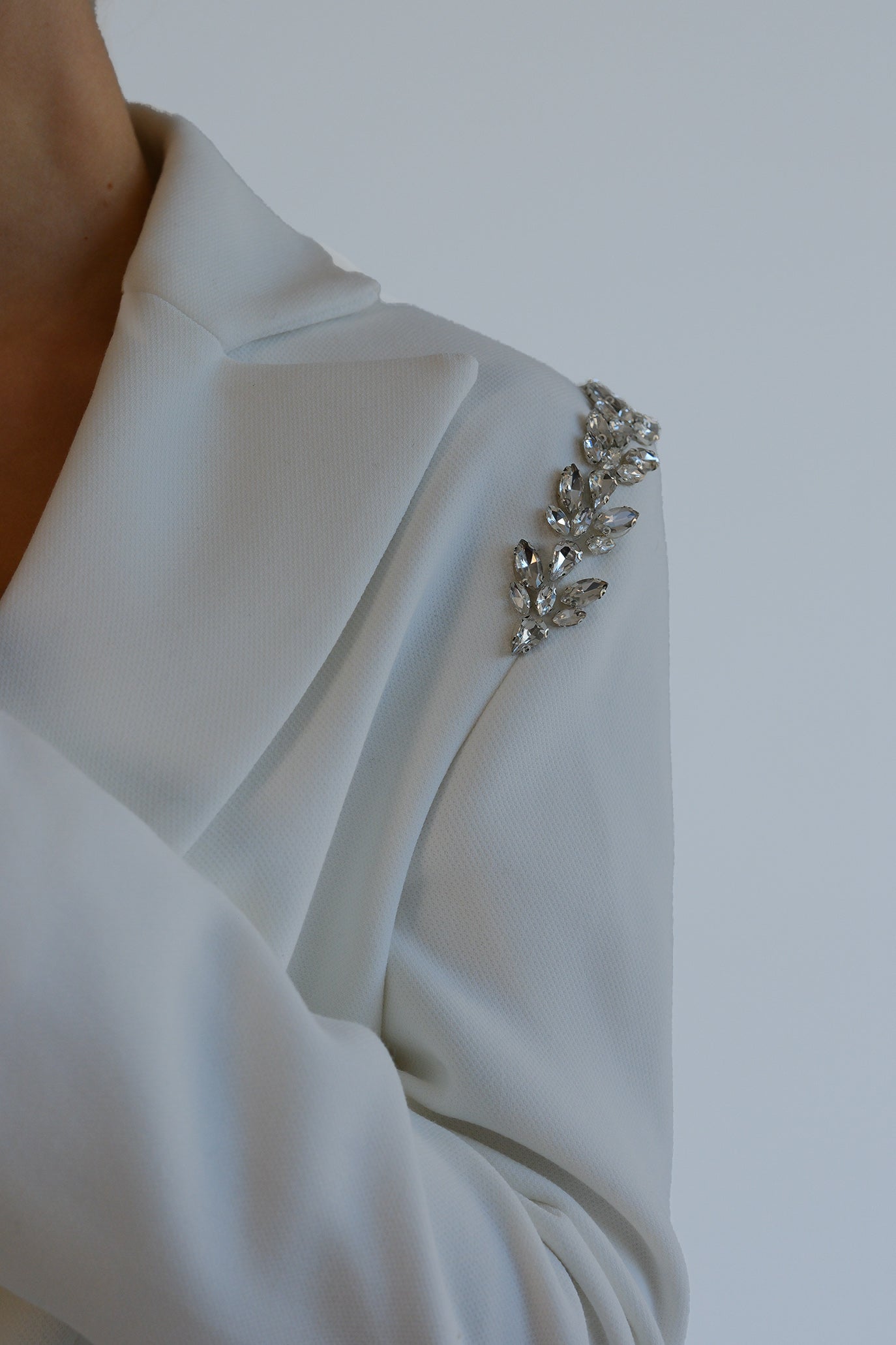 Сако за модерна, женствена версия. Късото сако е със скулптурирани реверни и метални копчета оформя раменете и подчертава талията. Материята е с плътност и еластичност за добро прилягане без ограничение в движенията. Има бляскав акцент на страничния джоб и раменете с ръчно пришити камъни, които са залепени върху основа и след това пришити към сакото.