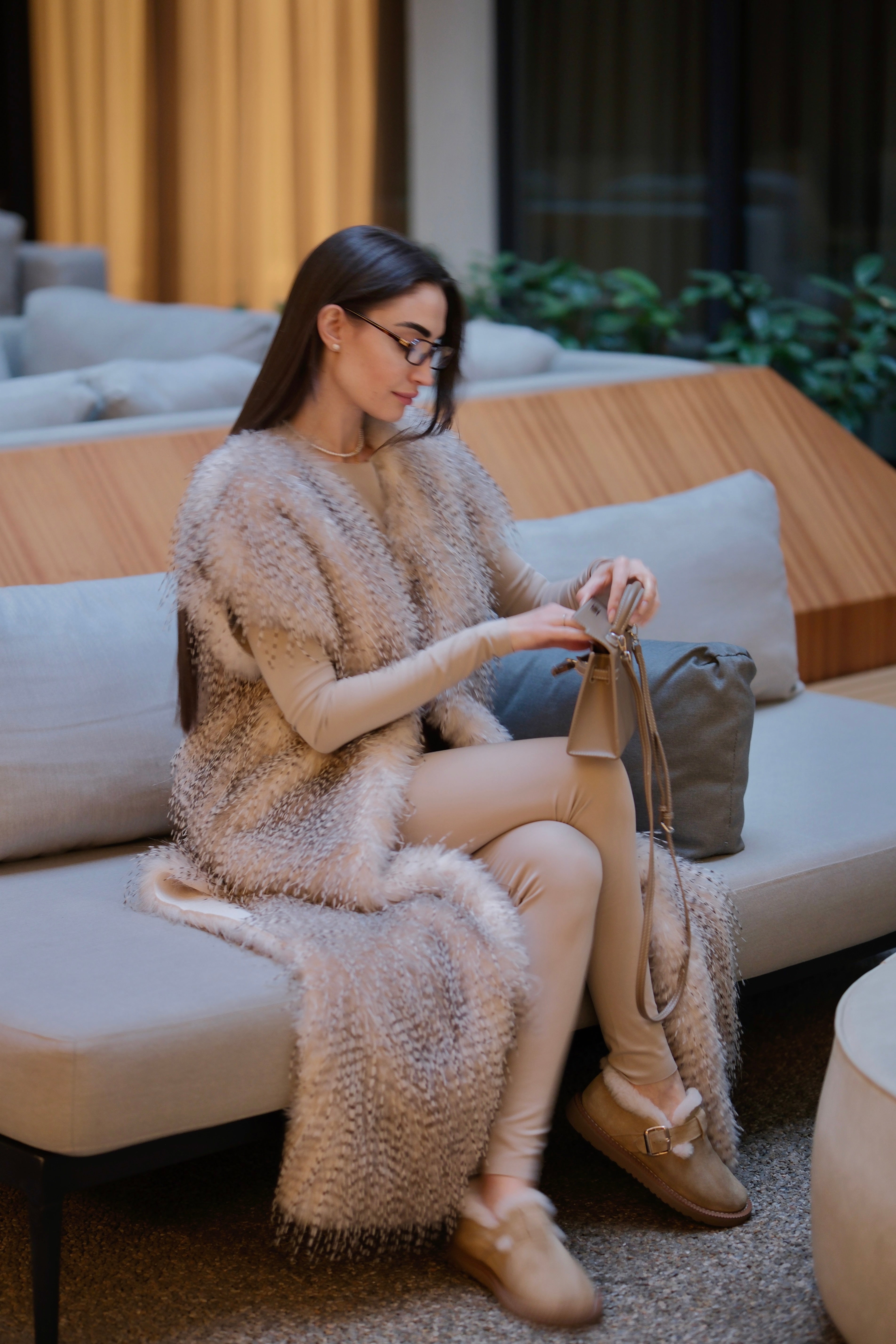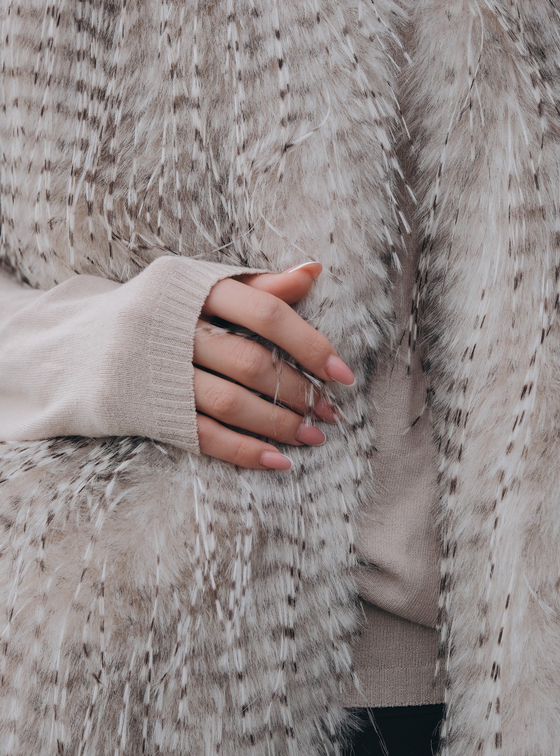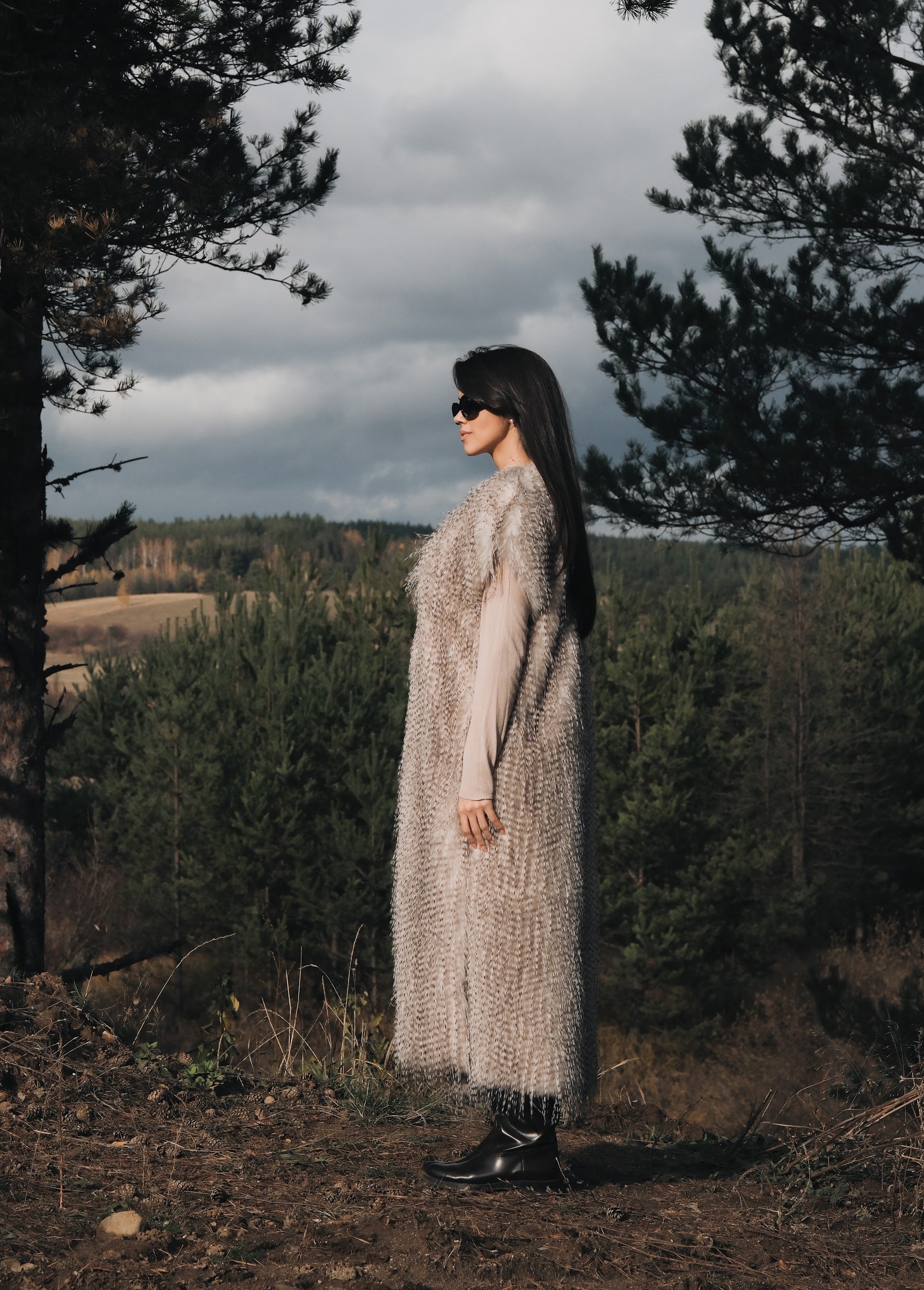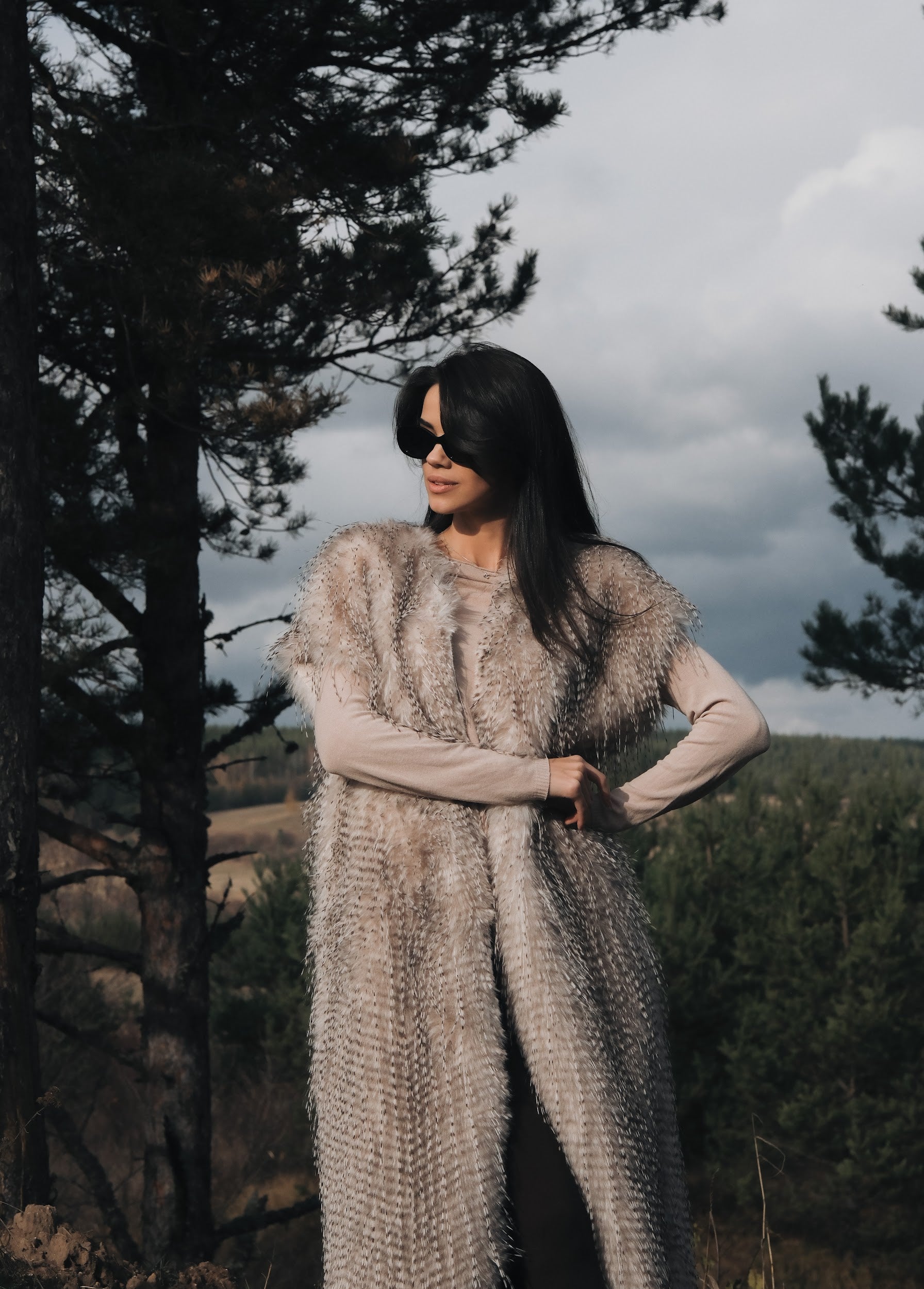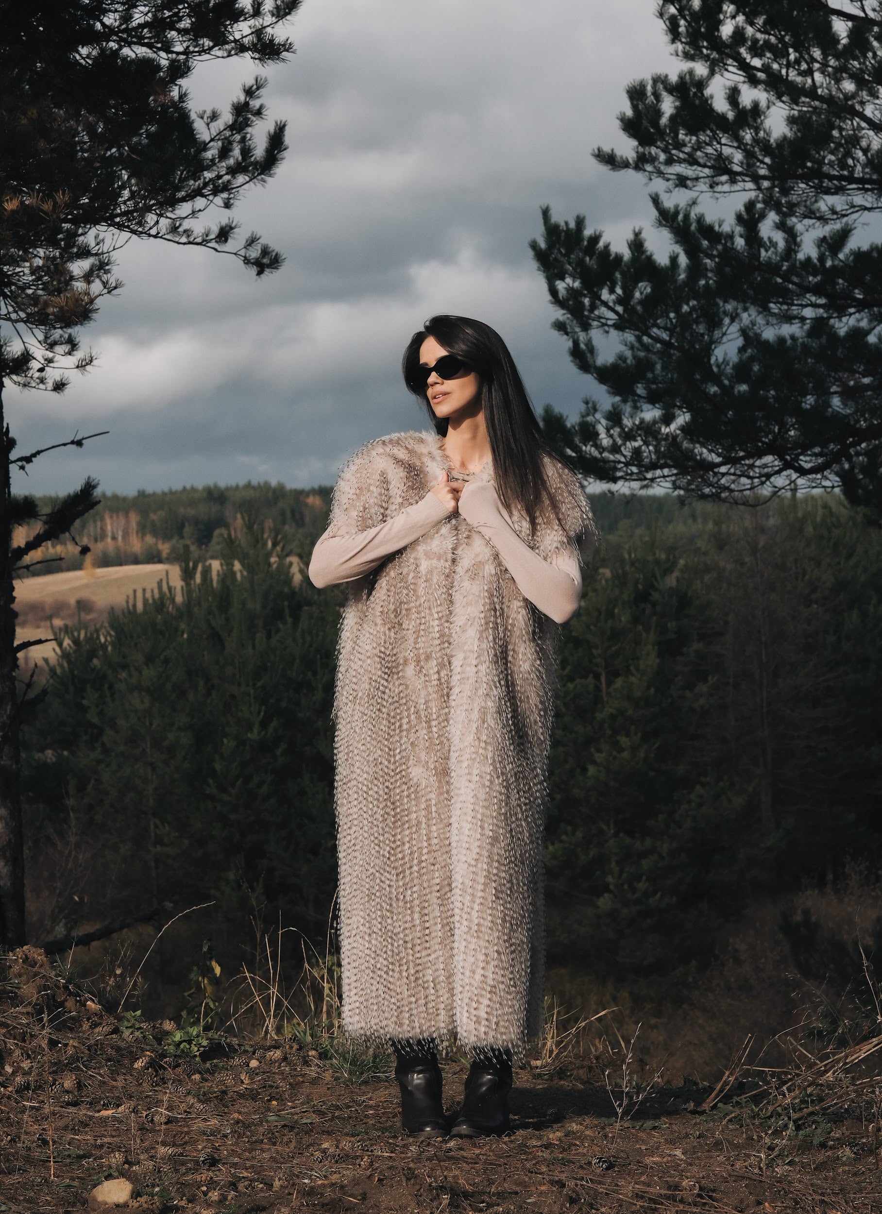 Ефектна дълга жилетка, изработена от специални ресни с ефект на бодливо свинче. Къс ръкав тип наметка, дължина до глезена и леко движение при всяка стъпка.  Идеален завършек върху рокли, костюми и гащеризони. Дължина на наметалото - 130см.