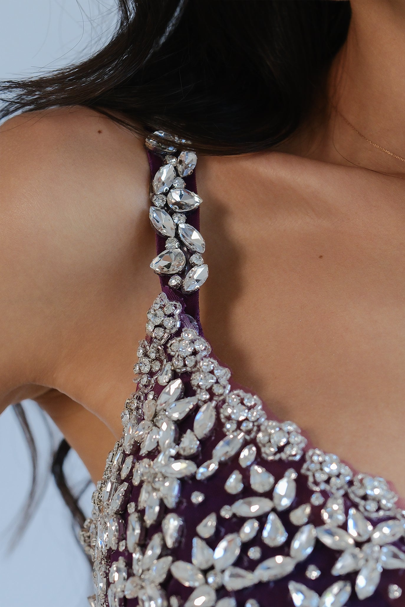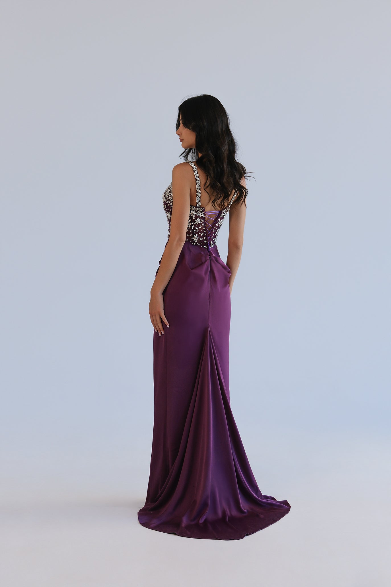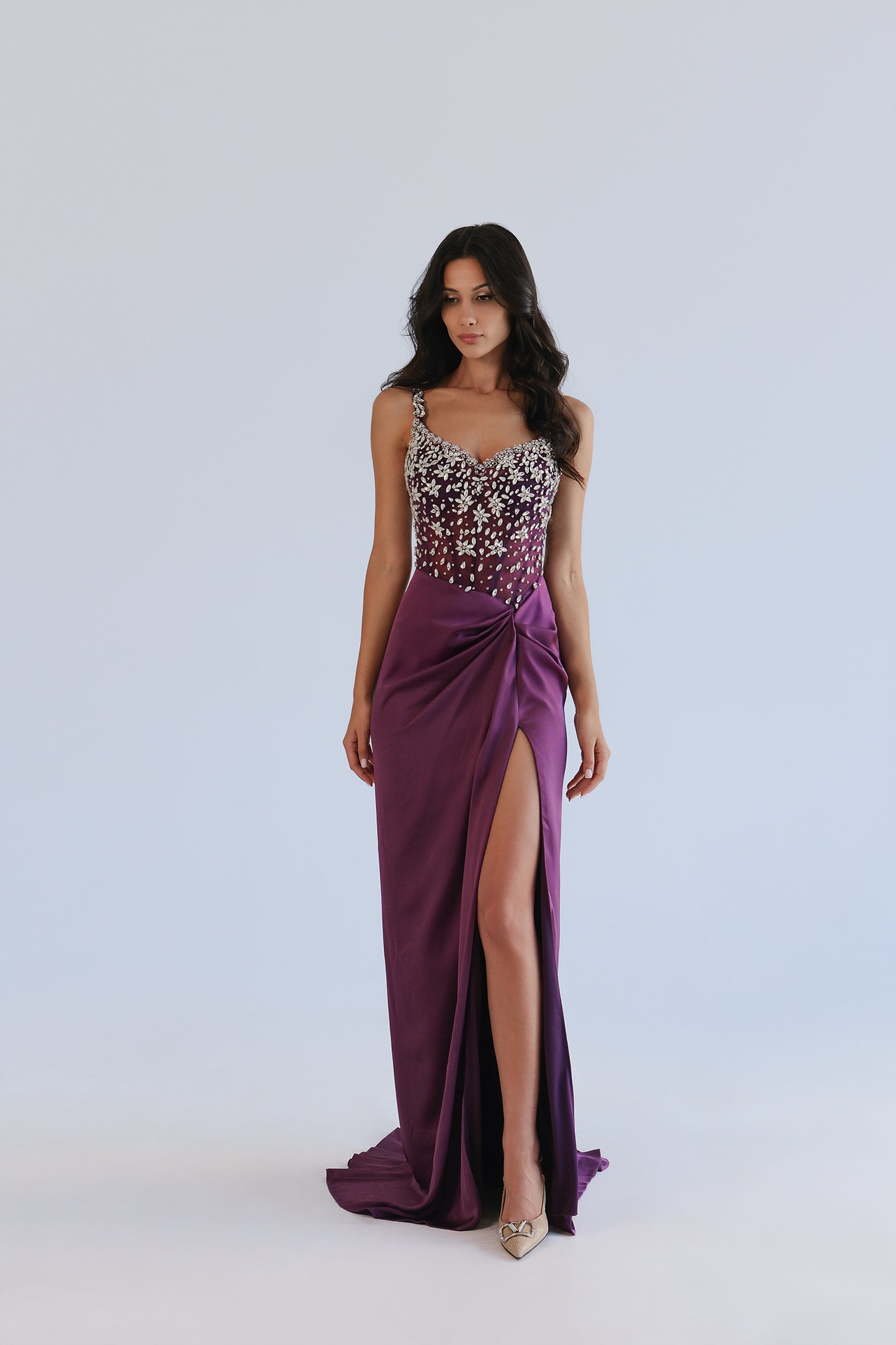Елегантна дълга вечерна рокля с изваяна линия и висока цепка. Горната част е корсетна – богато  декорирана с кристали и камъни във флорални мотиви, с искрящи презрамки и вградени чашки за сигурна поддръжка. С деколте, подчертаващо бюста. Полата е от фин сатен с красив драпаж по бедрото, прилепнала по тялото и завършваща с лек шлейф за ефектно падане. Продуктът пристига в персонализиран калъф.