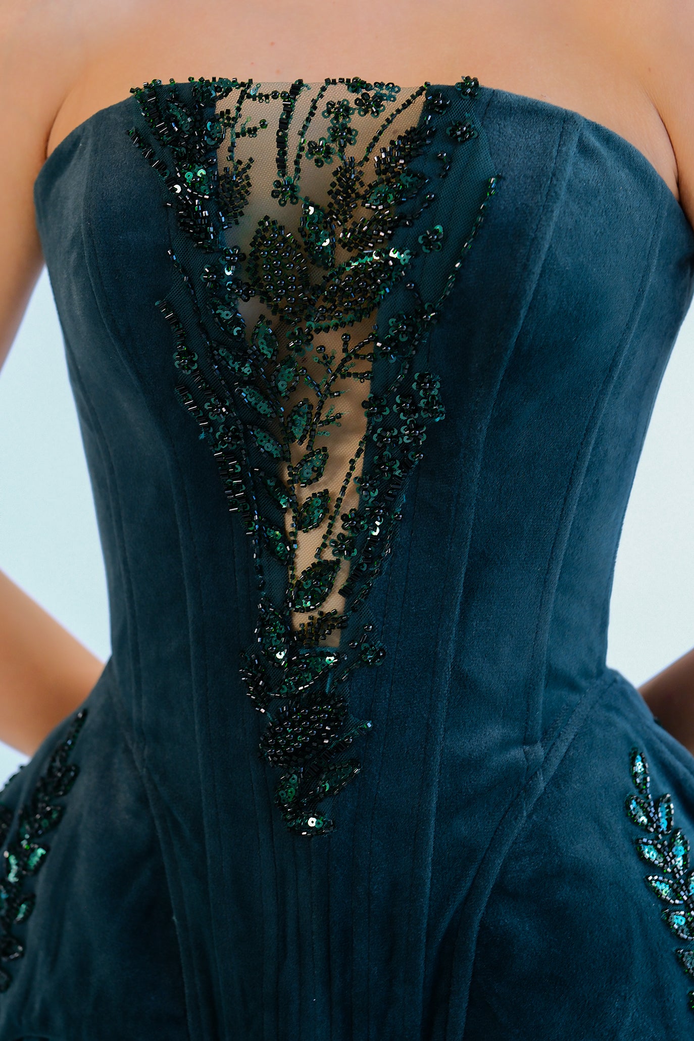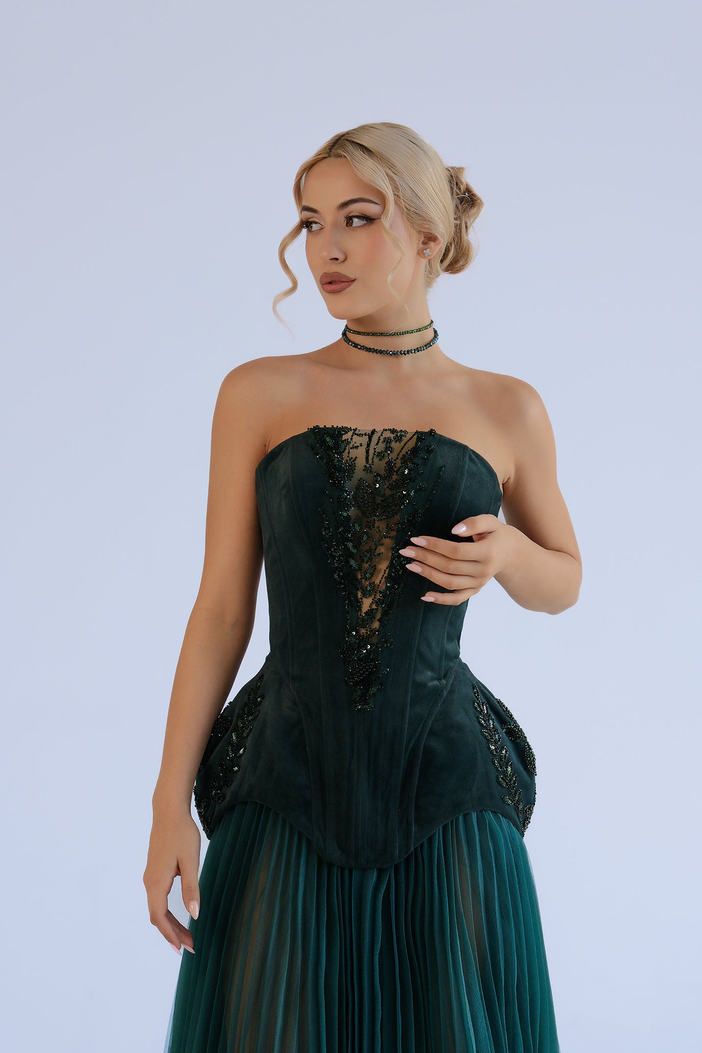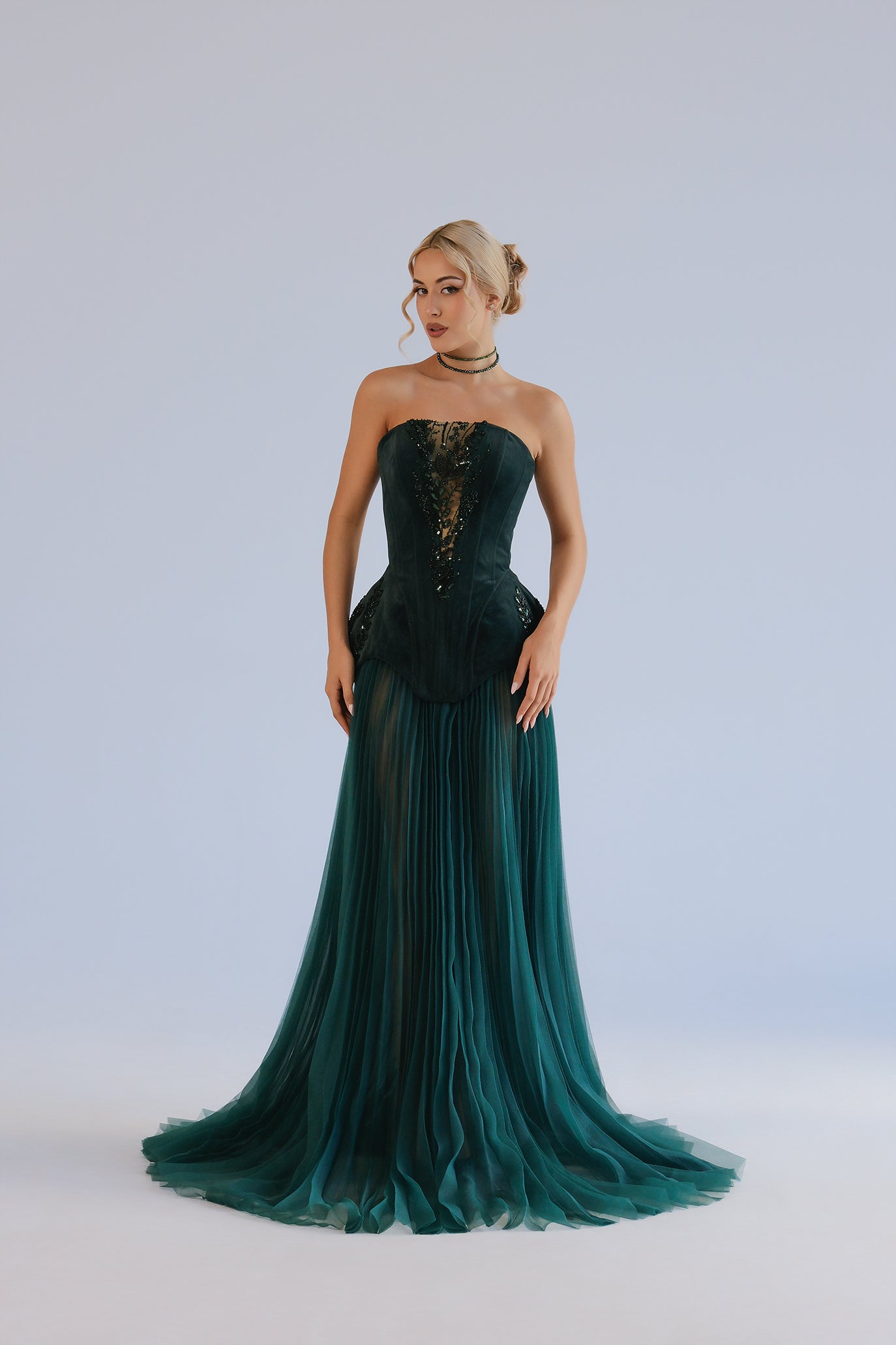 Впечатляваща вечерна рокля, изцяло ръчно изработена. Моделът е с дължина до пода и силует русалка, който елегантно издължава фигурата. Горната част е корсет със сърцевидно деколте, нестандартна издължена форма и връзки на гърба, които осигуряват перфектно прилягане към тялото. Оформя талията и придава стабилност. Върху ханша пада асиметричен пеплум с лек обем. Долната част е оформена в свободна пола от полупрозрачен плисиран тюл, създаващ ефект на движение.