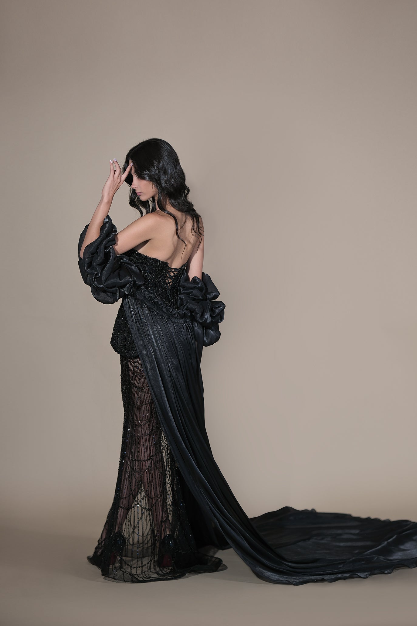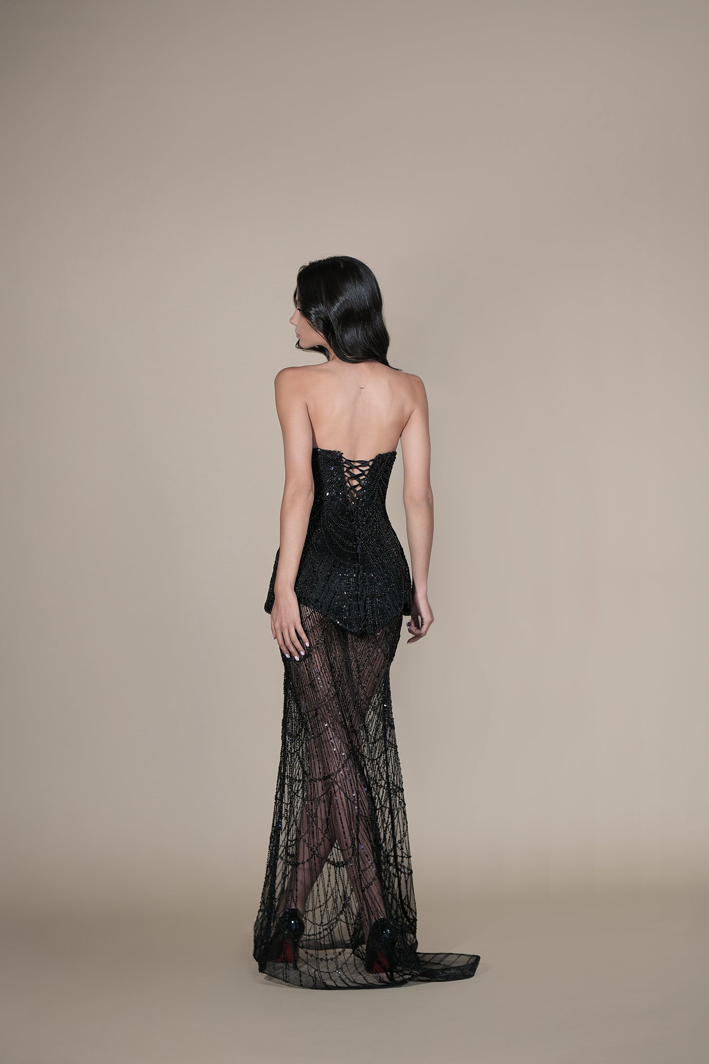 Впечатляваща вечерна рокля, изцяло ръчно изработена. Моделът е с дължина до пода и силует русалка, който елегантно издължава фигурата. Горната част е корсет със сърцевидно деколте, нестандартна издължена форма и връзки на гърба, които осигуряват перфектно прилягане към тялото. Оформя талията и придава стабилност. Върху ханша пада асиметричен пеплум с лек обем. Долната част е оформена в свободна пола от блестящ полупрозрачен плат, създаващ ефект на движение и блясък. Към роклята може да се добави шлейф с обемни ефектни ръкави.