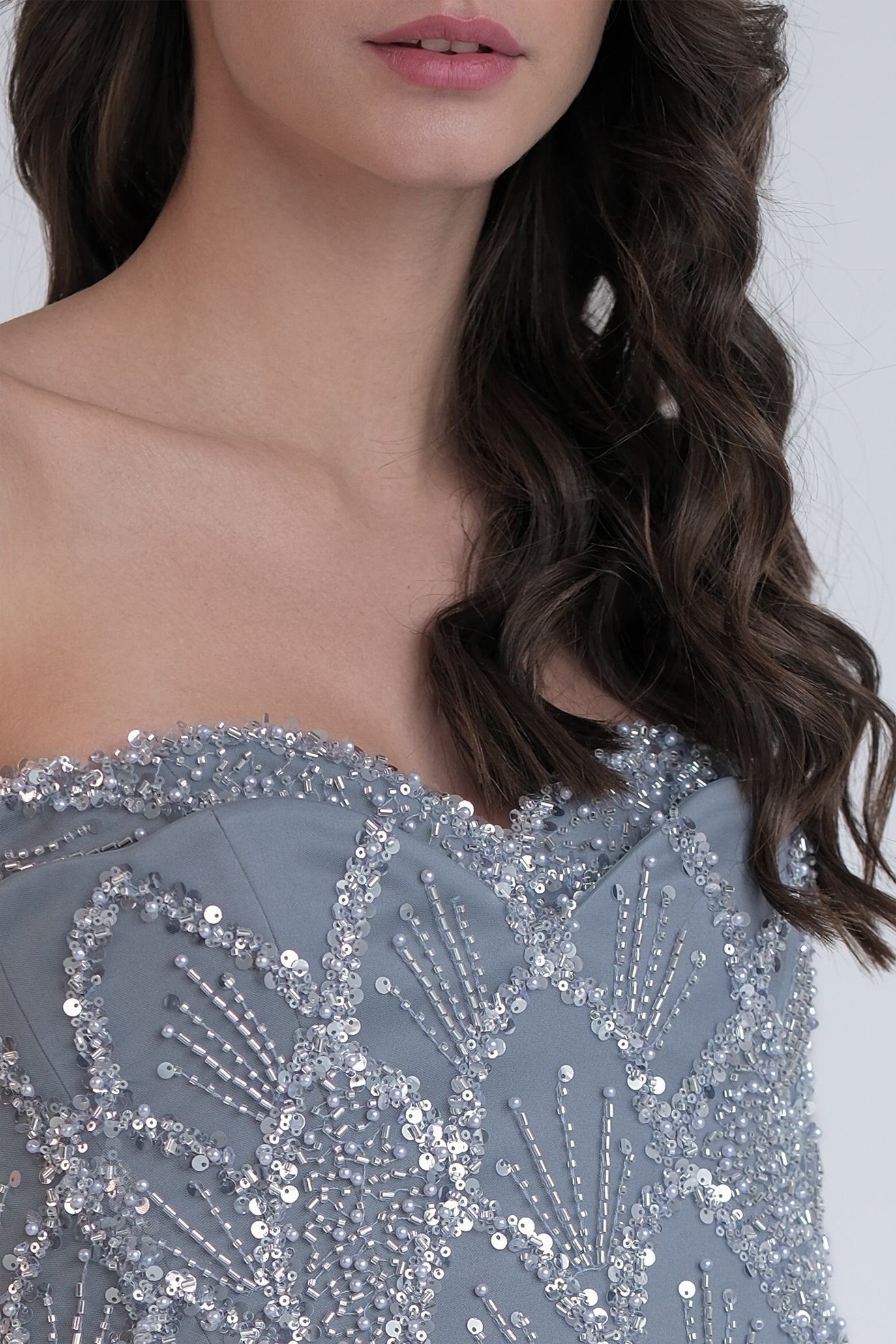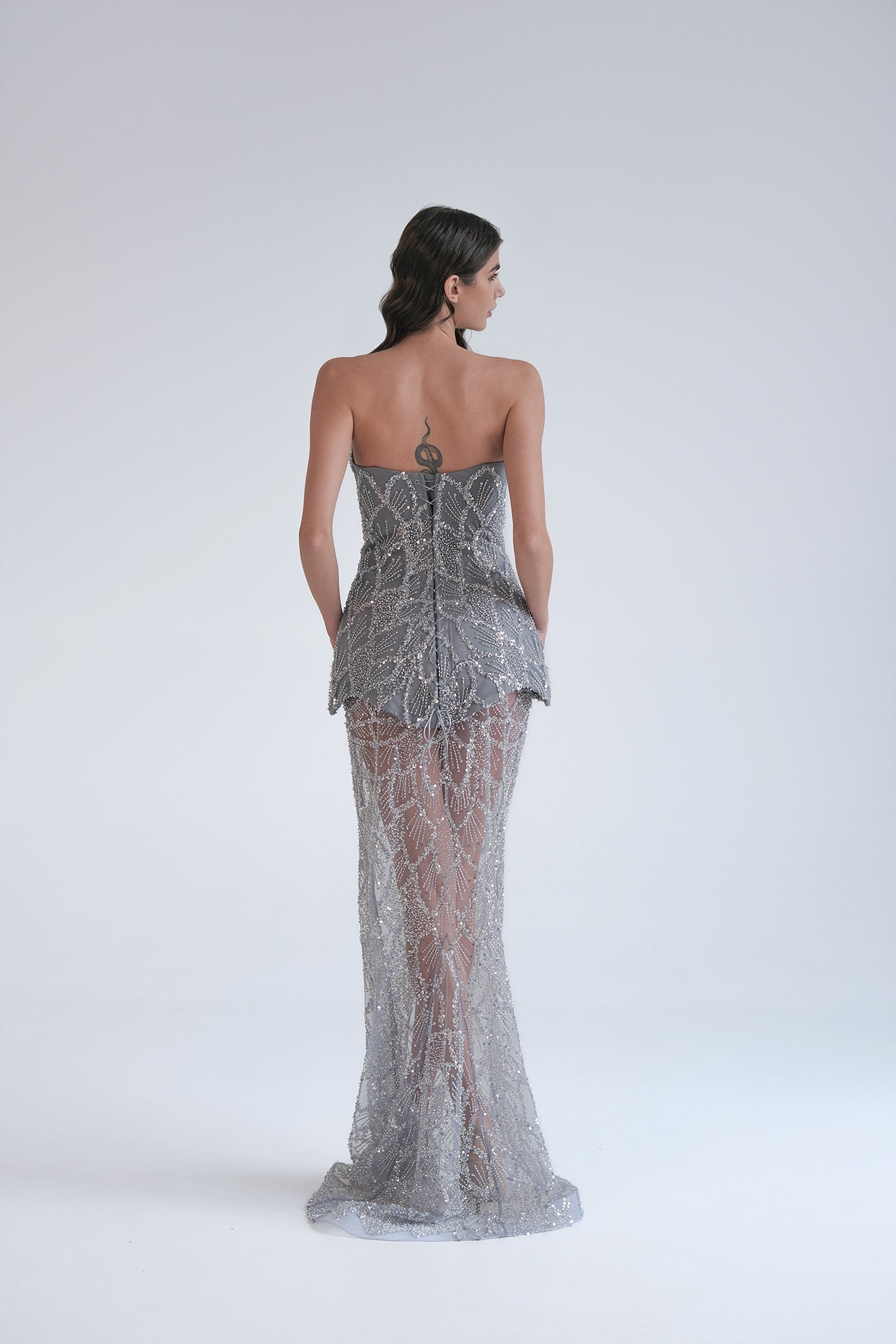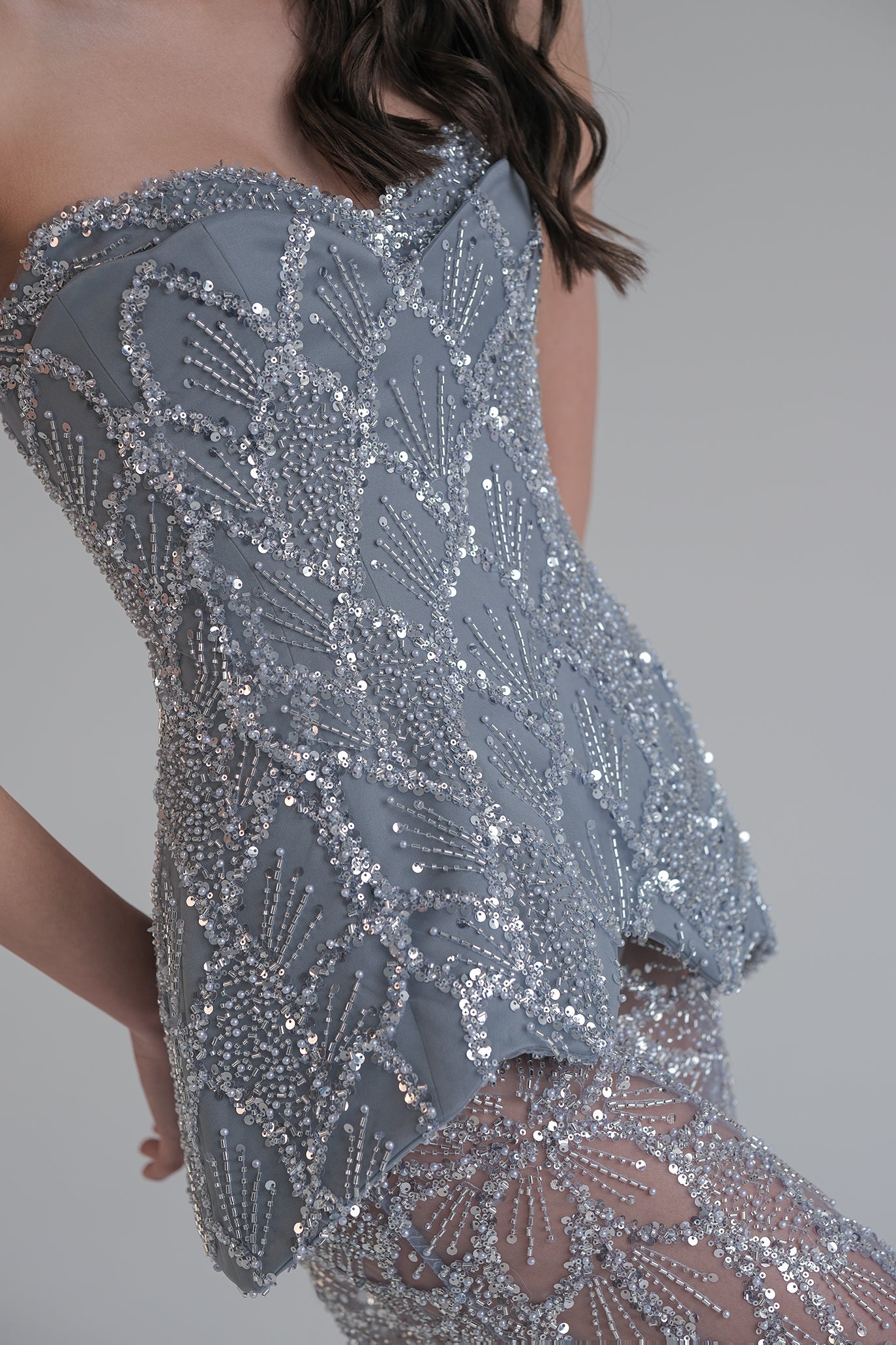 Впечатляваща вечерна рокля, изцяло ръчно изработена. Моделът е с дължина до пода и силует русалка, който елегантно издължава фигурата. Горната част е корсет със сърцевидно деколте, нестандартна издължена форма и връзки на гърба, които осигуряват перфектно прилягане към тялото. Оформя талията и придава стабилност. Върху ханша пада асиметричен пеплум с лек обем. Долната част е оформена в свободна пола от блестящ полупрозрачен плат, създаващ ефект на движение и блясък.