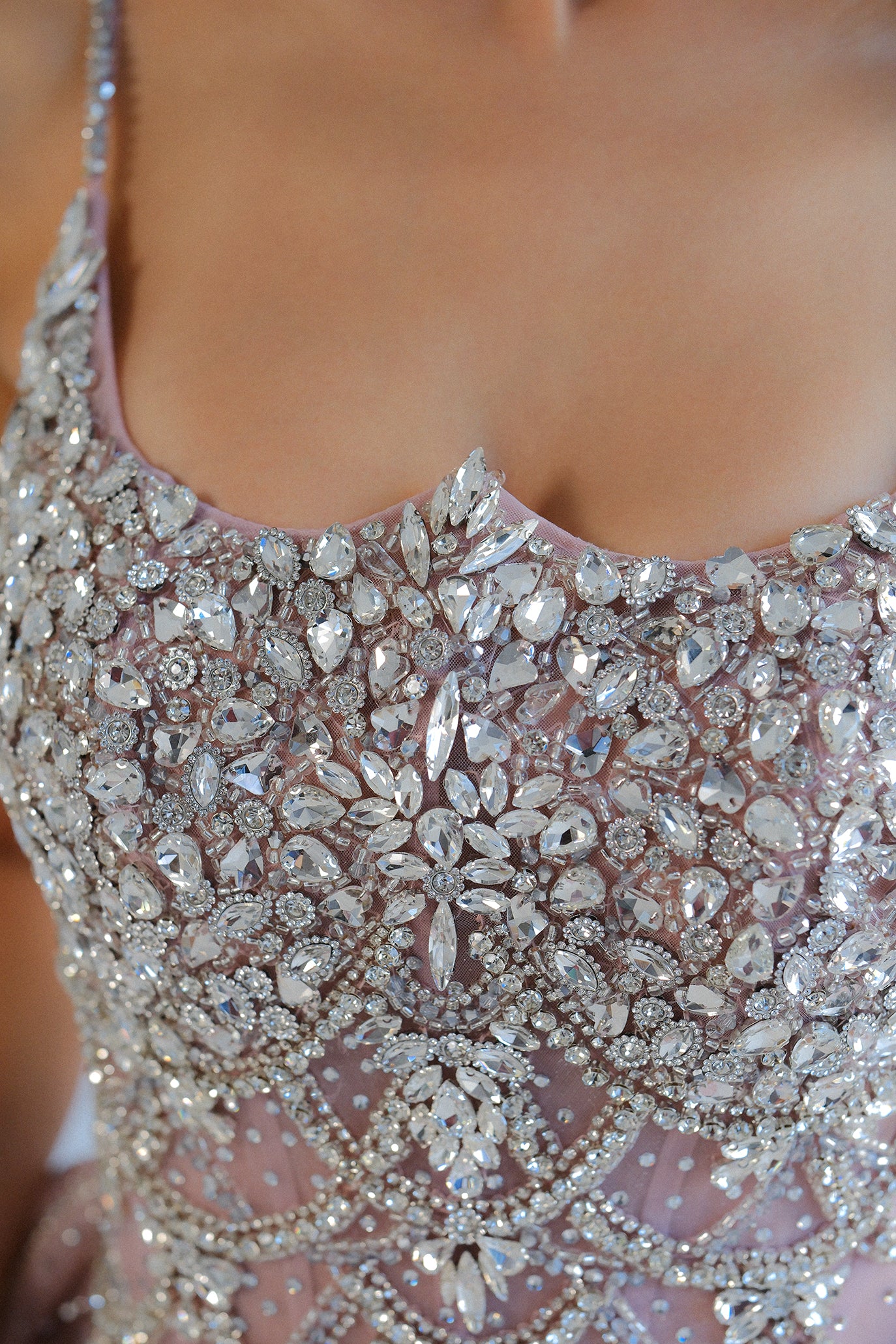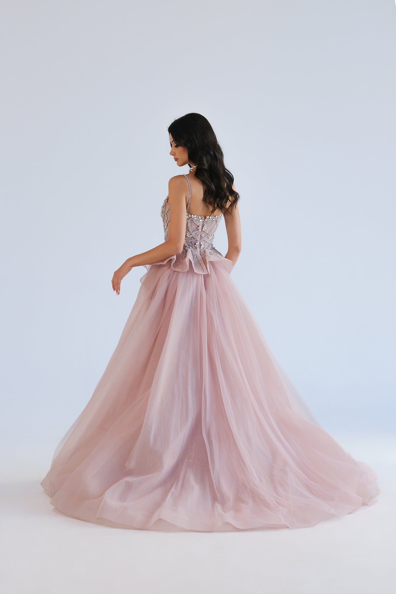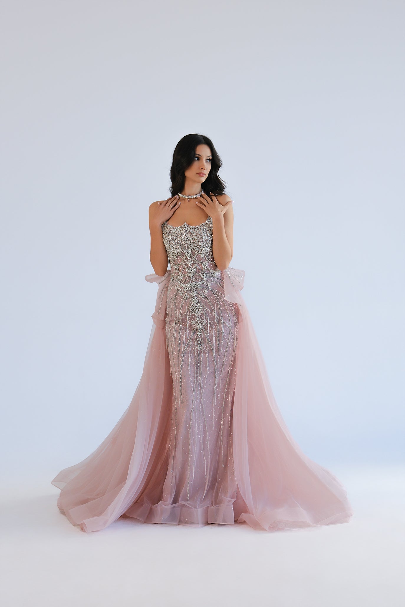 Ефектна дълга вечерна рокля на тънки презрамки и богато декорирана с кристали и камъни по цялата горна част и по силуета. Полупрозрачна корсетна конструкция оформя талията и осигурява стабилност, а прилепналата пола с висока цепка отпред издължава фигурата. Отстрани и отзад роклята е завършена с многослоен тюлен обем от шлейф. Вградени чашки и мека подплата за комфорт през цялата вечер. Продуктът пристига в персонализиран калъф.