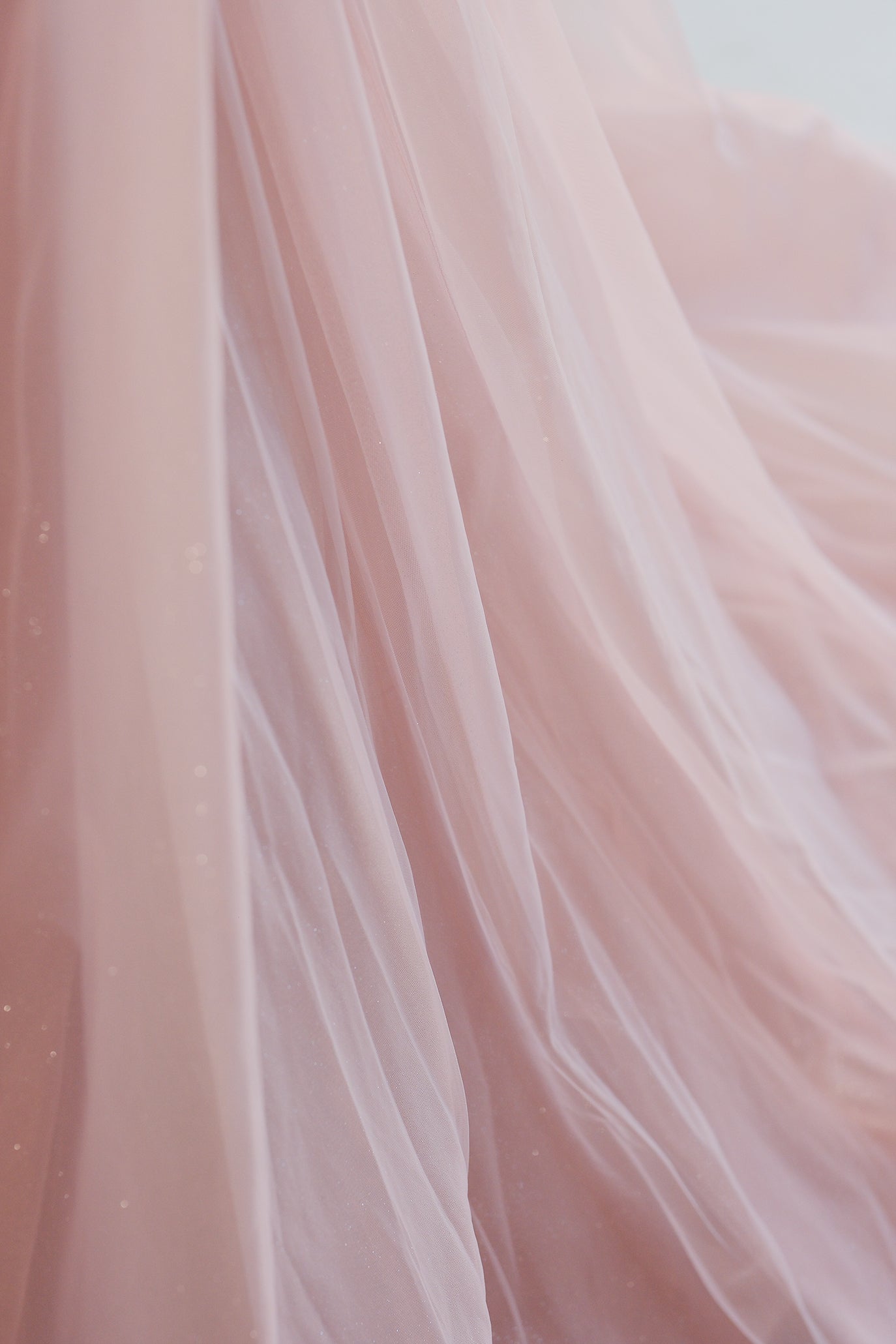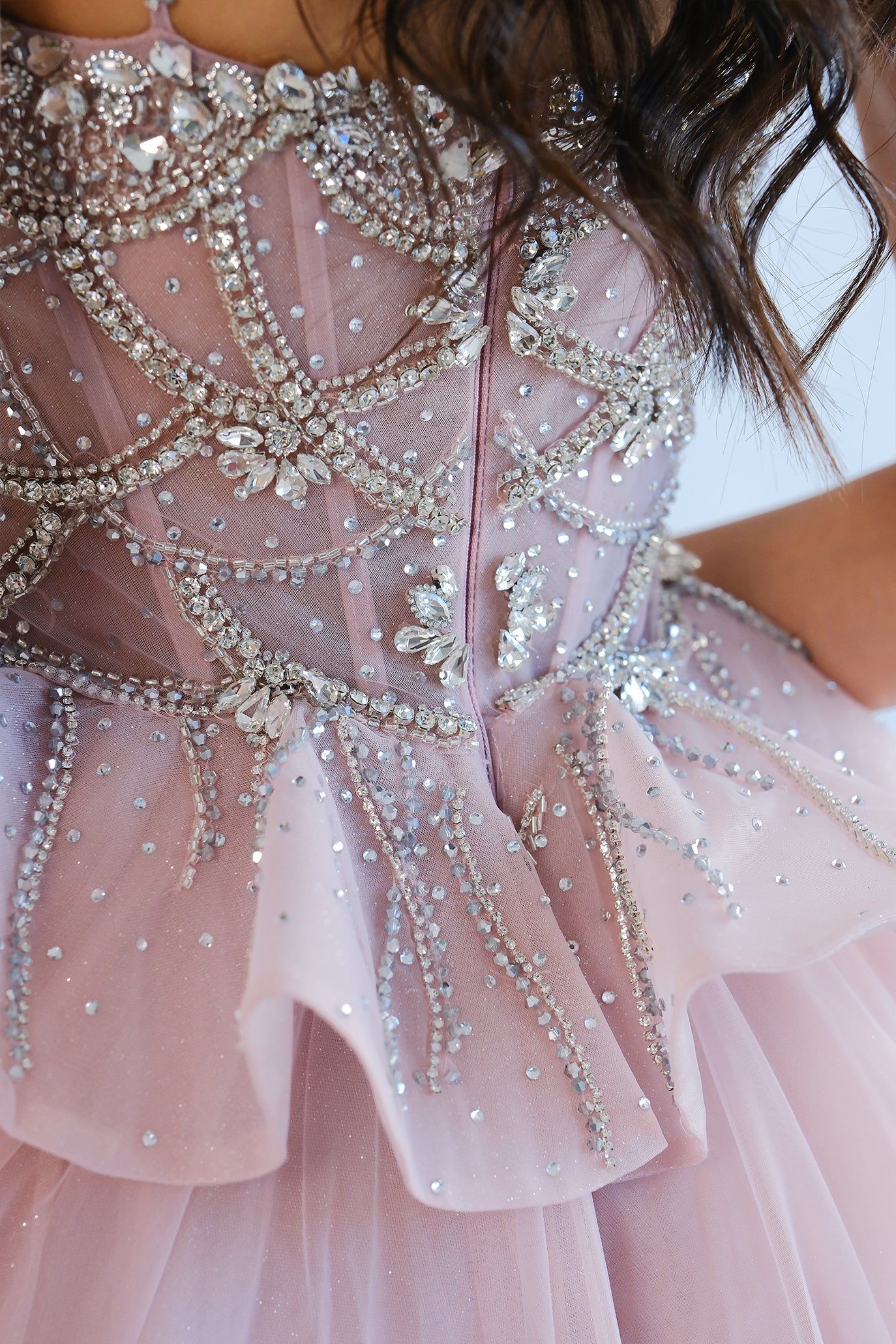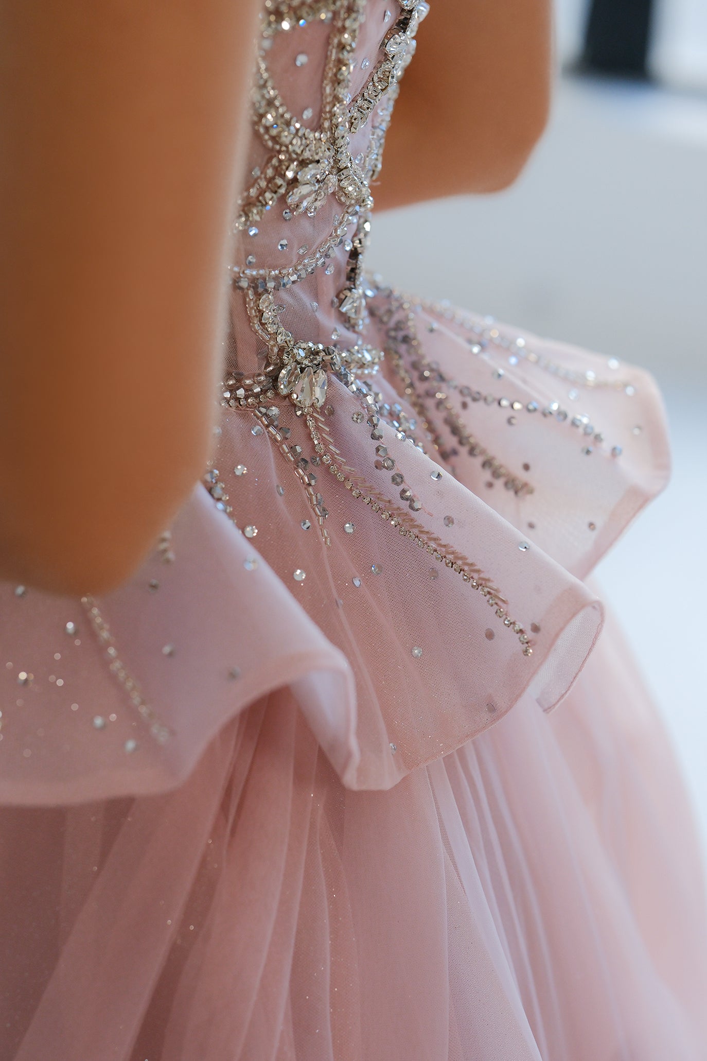 Ефектна дълга вечерна рокля на тънки презрамки и богато декорирана с кристали и камъни по цялата горна част и по силуета. Полупрозрачна корсетна конструкция оформя талията и осигурява стабилност, а прилепналата пола с висока цепка отпред издължава фигурата. Отстрани и отзад роклята е завършена с многослоен тюлен обем от шлейф. Вградени чашки и мека подплата за комфорт през цялата вечер. Продуктът пристига в персонализиран калъф.