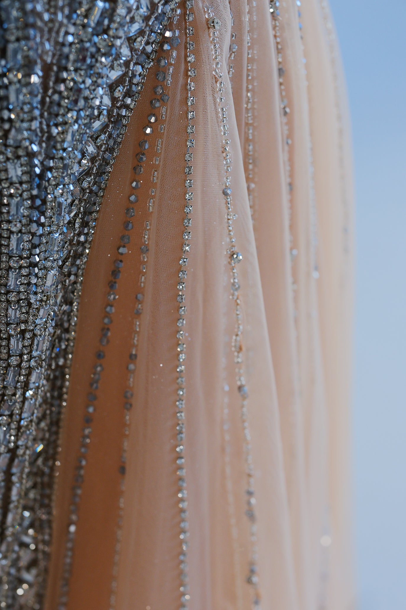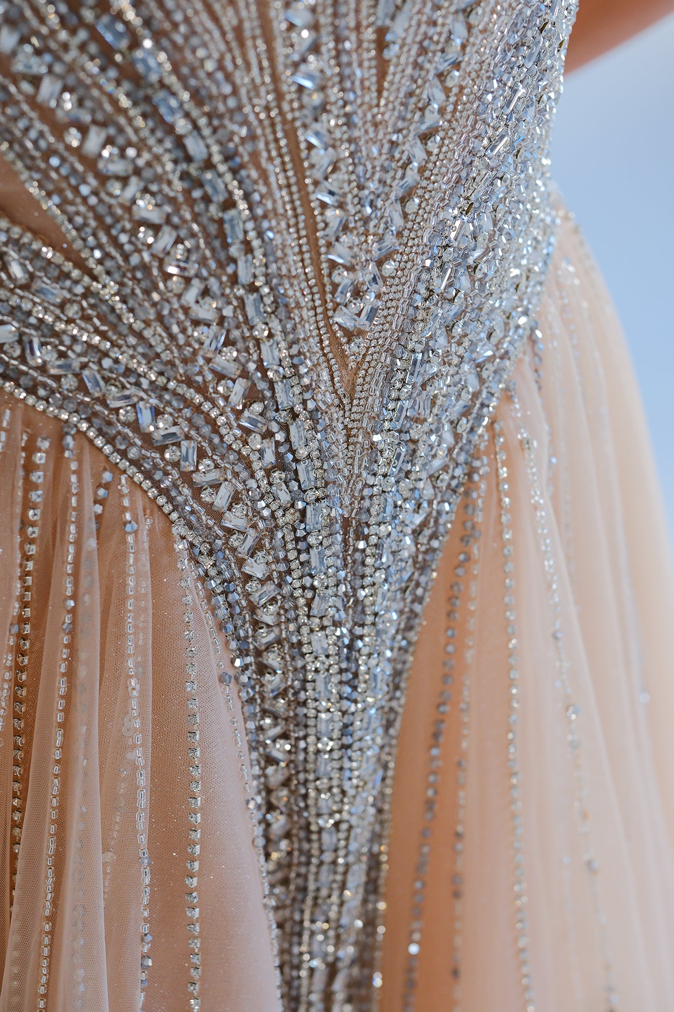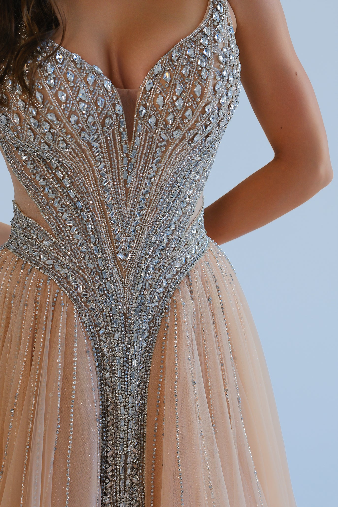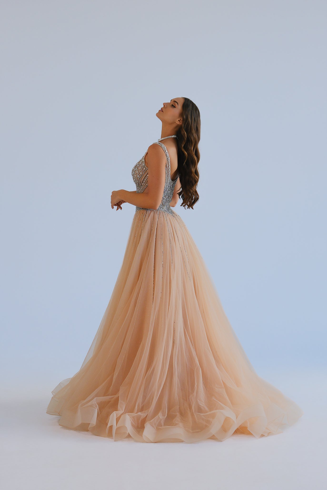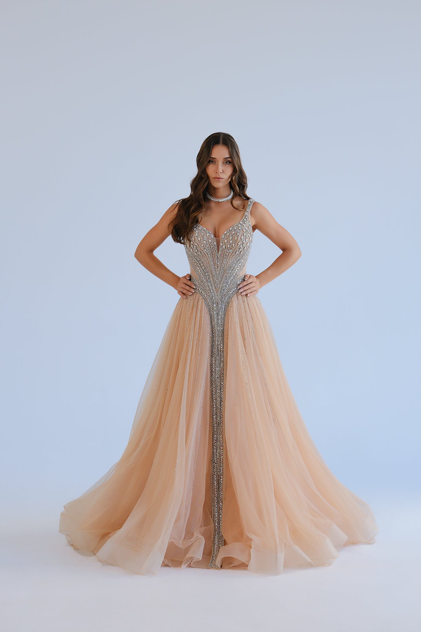 Луксозна бална рокля с силует „А“, изработена от многопластов ефирен тюл. Горната част е корсетна с банели и вградени чашки за стабилност, а широките презрамки са богато декорирани. Предната част е изцяло украсена с кристали и камъни, оформящи издължаващ оптически ефект и подчертаващи талията. Полата пада обемно и меко, с дълъг, плавен шлейф за впечатляващо излъчване от всяка страна. Полупрозрачни елементи придават фин, модерен акцент, като същевременно роклята остава комфортна за носене.