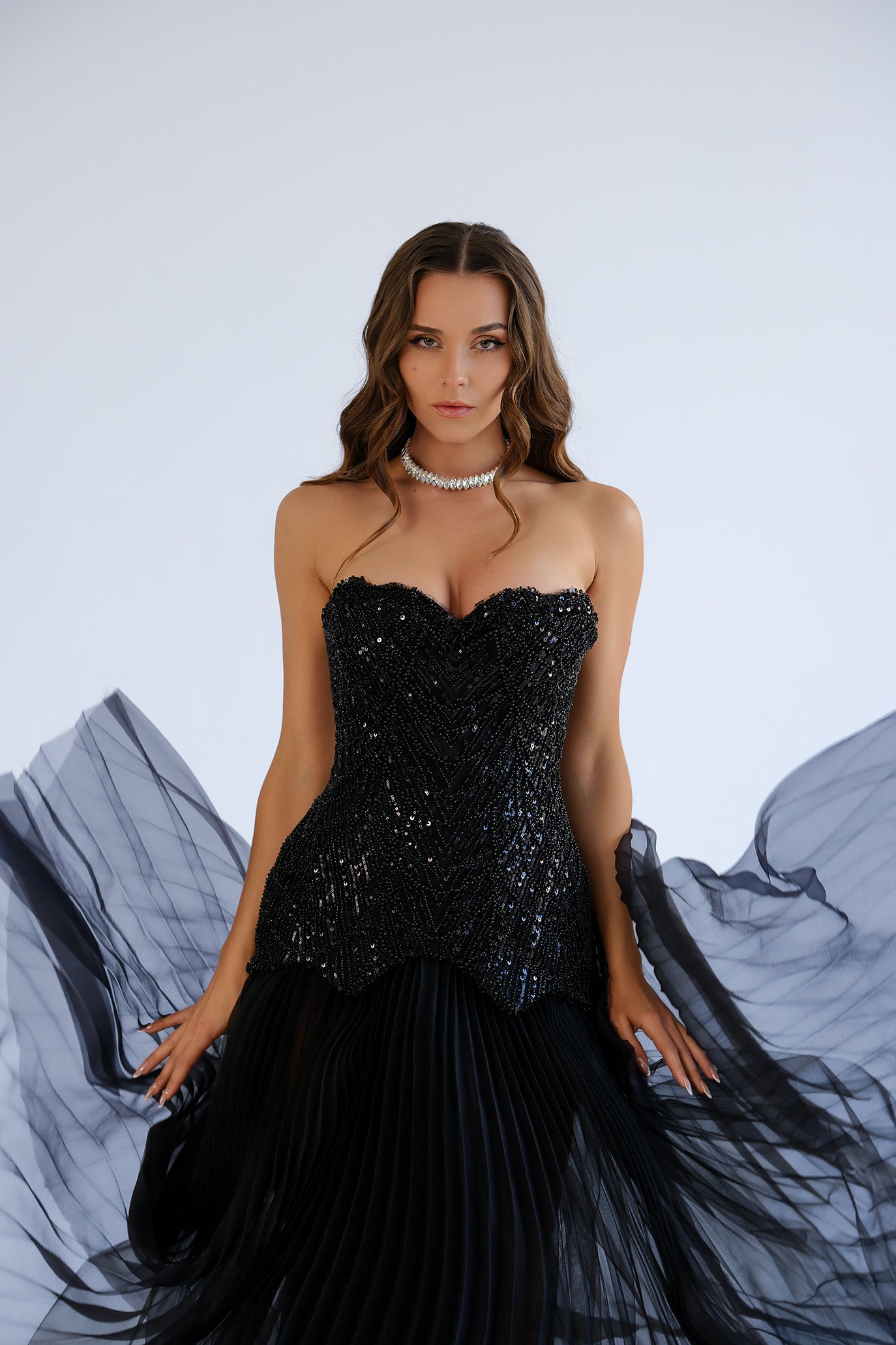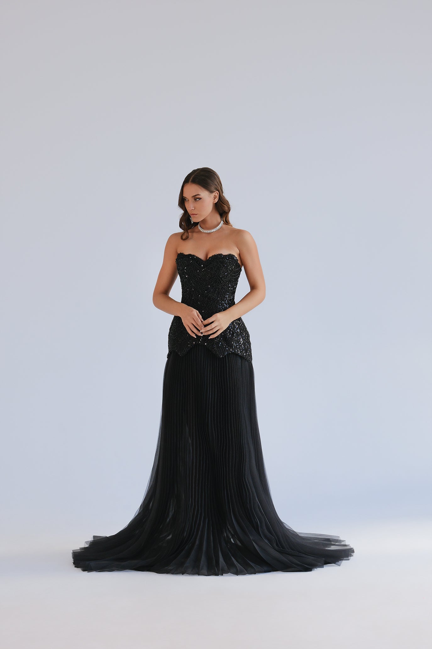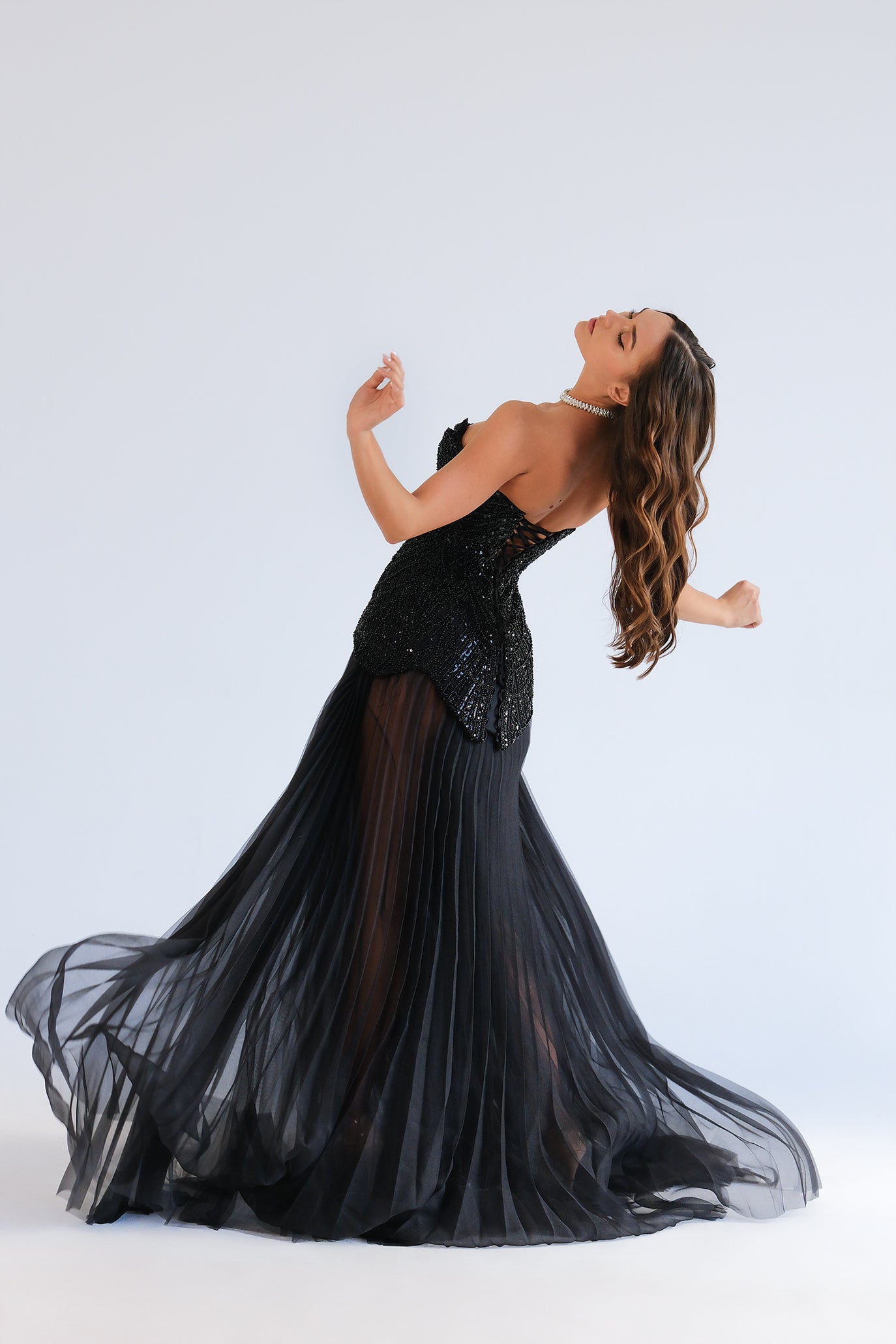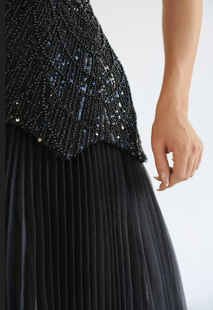 Ефектна дълга вечерна рокля с горна част тип корсет и сърцевидно деколте, украсена с гъста декорация от черни пайети и мъниста. Корсетната конструкция подчертава талията и се регулира удобно с връзване на гърба. Полата пада свободно от ханша и е изработена от фина, плисирана материя, която създава красиво движение и лек шлейф. Вградени чашки и мека подплата осигуряват стабилност и комфорт през цялата вечер.