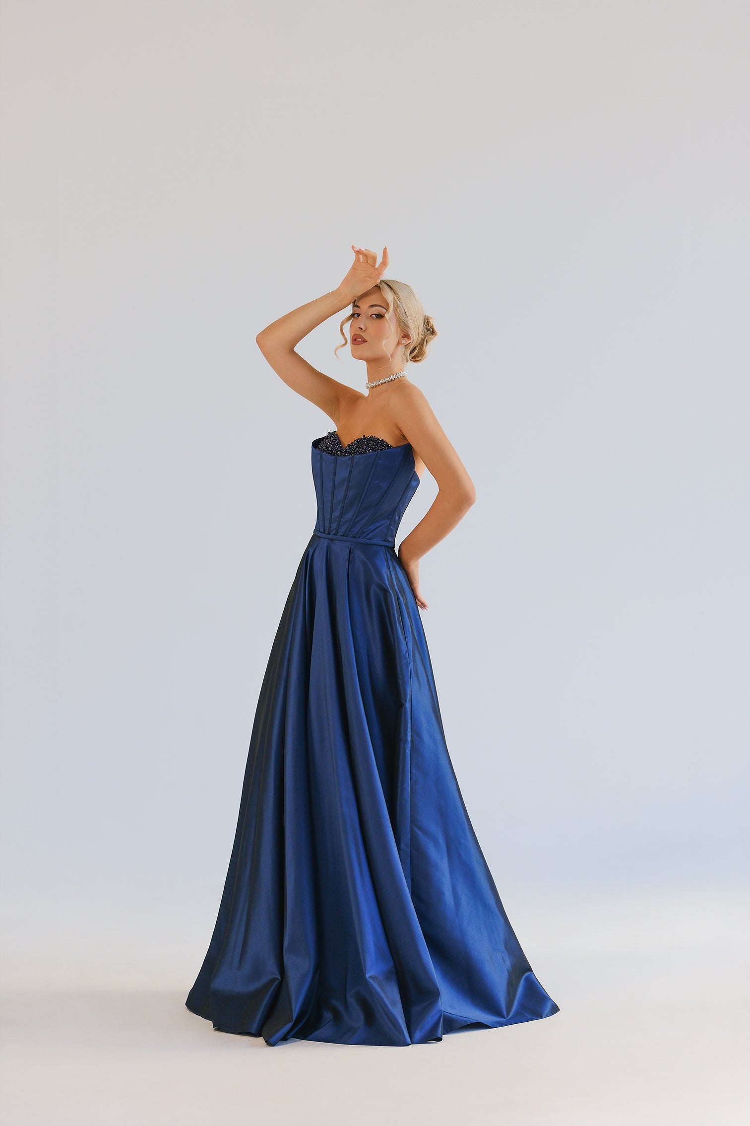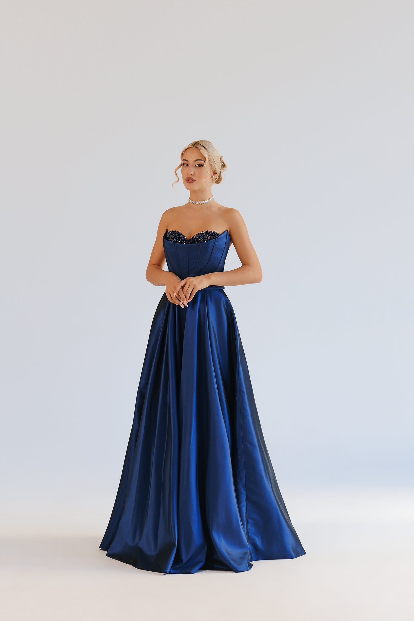 Елегантна дълга бална рокля без презрамки със сърцевидно деколте. Горната част е корсетна с фини банели за перфектна стойка и е богато декорирана с мъниста и кристали по чашките за изискан блясък. Талията е подчертана, а полата пада в обемна А-линия и деликатен шлейф за впечатляваща силуетна линия. Продуктът пристига в персонализиран калъф.