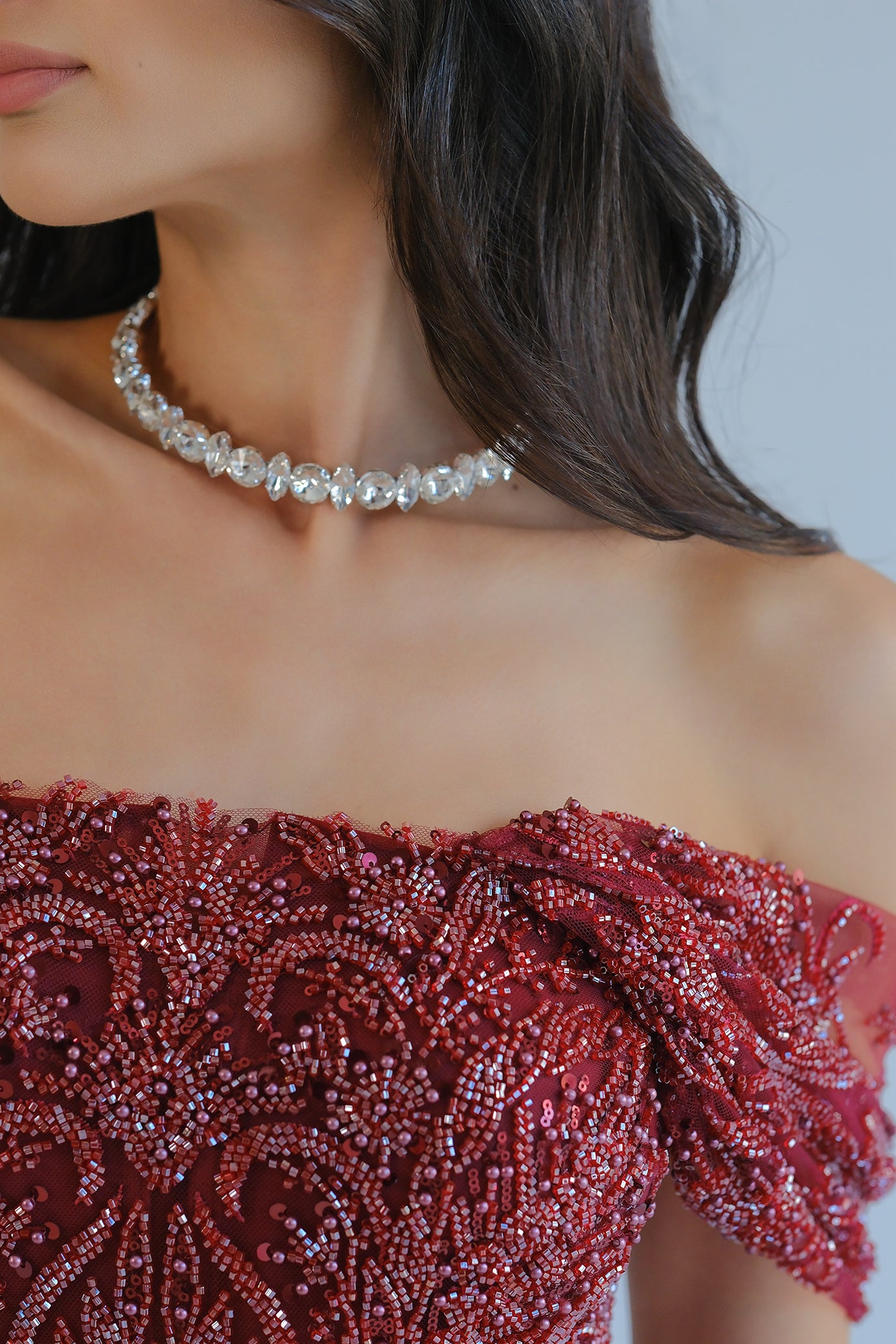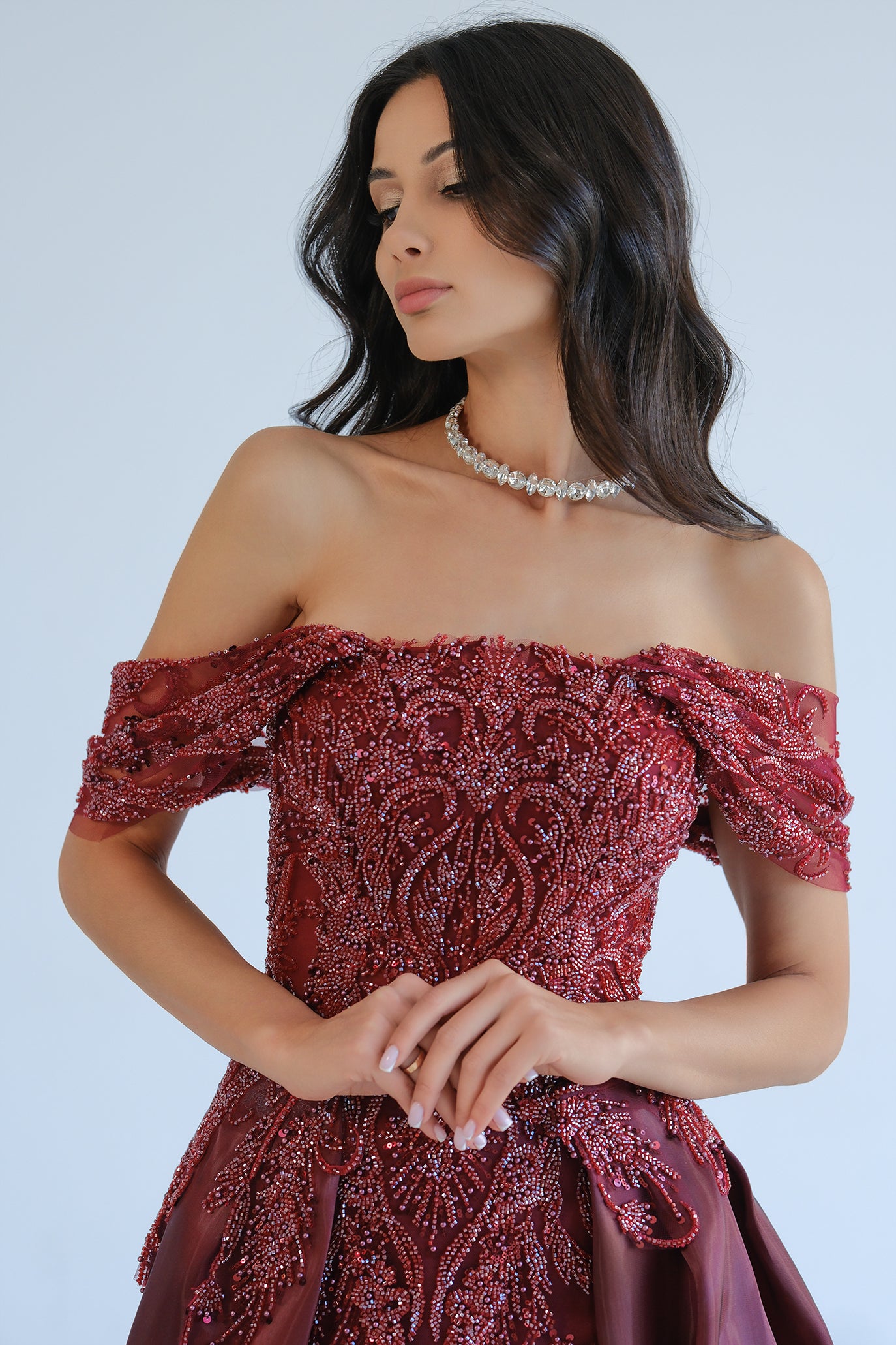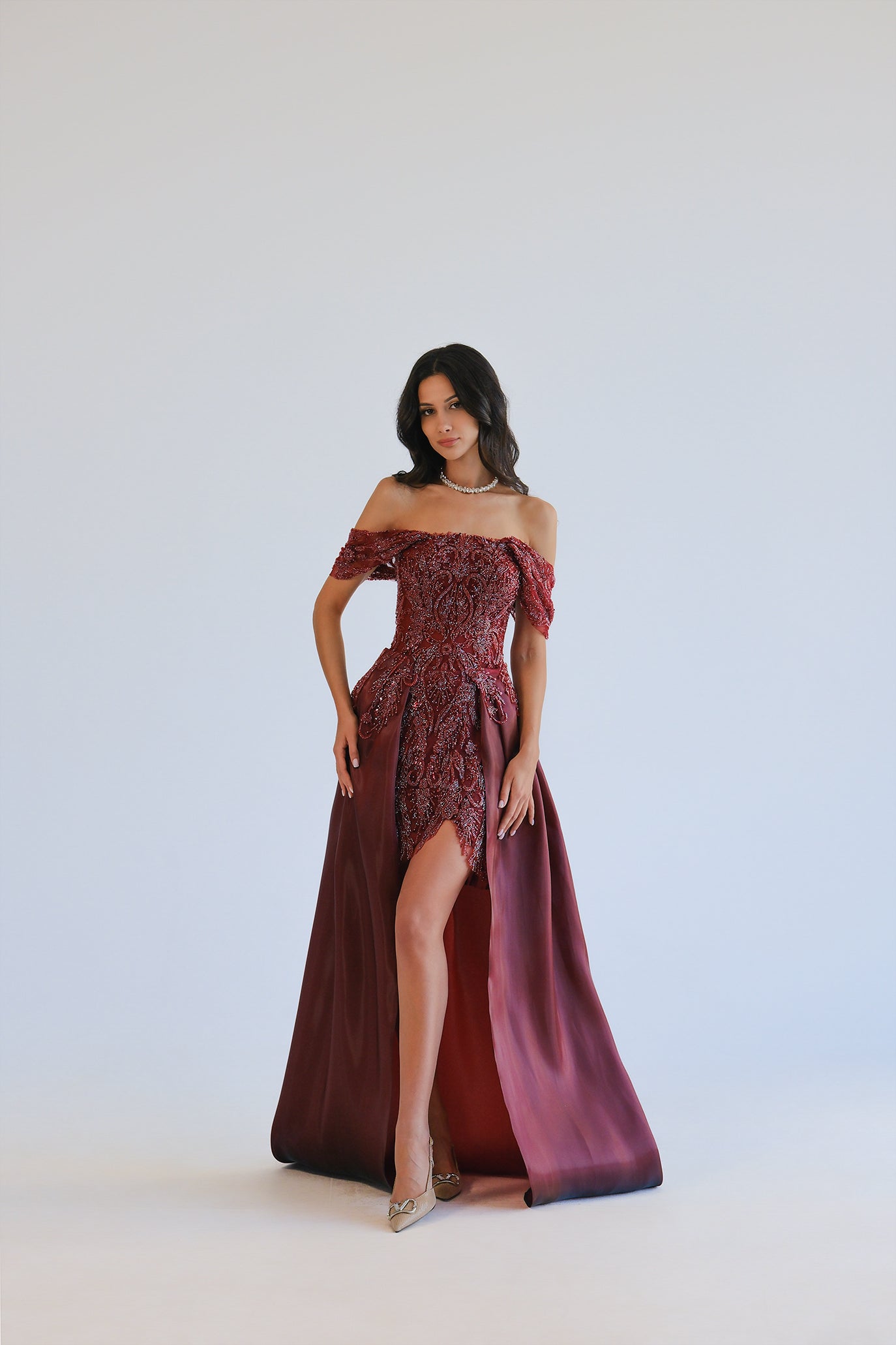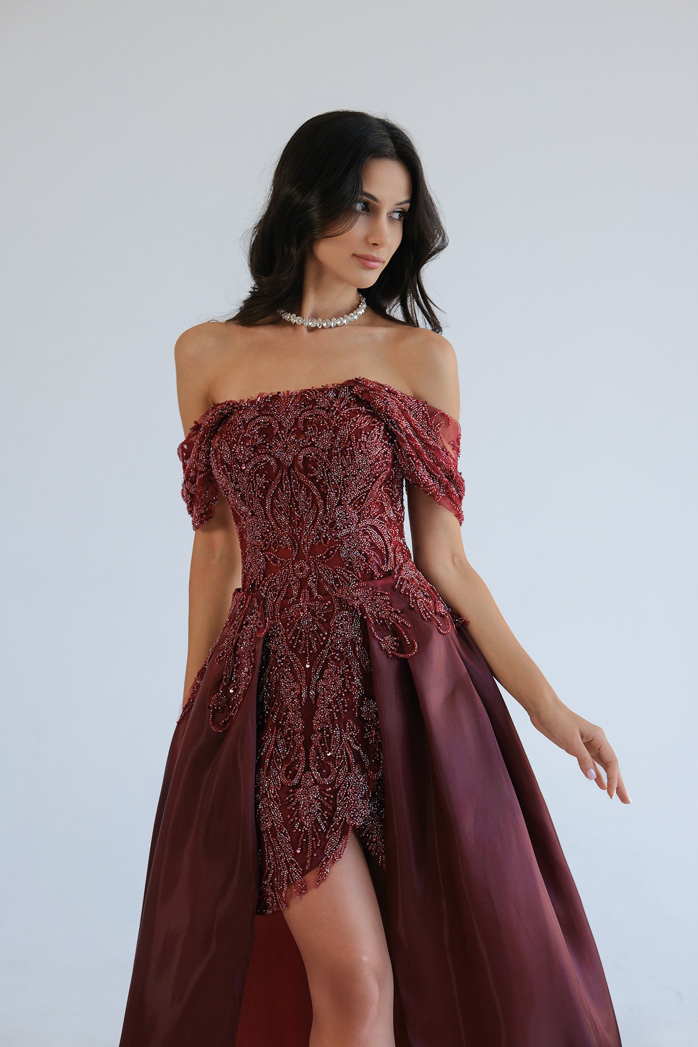 Луксозна вечерна рокля със свалящ се шлейф. Горната част е off-shoulder с нежно паднали ръкави и богато украсени мъниста и пайети, които оформят орнаментален релеф и силен блясък. Вградено бюстие с чашки подчертава деколтето и осигурява стабилност. Основата е къса „мини“ рокля с асиметричен завършек и висока цепка отпред, а дългият обемен шлейф от феерична материя добавя вечерна елегантност и може да се сваля за по-лек и удобен силует. Лека подплата за комфорт и свобода на движение.