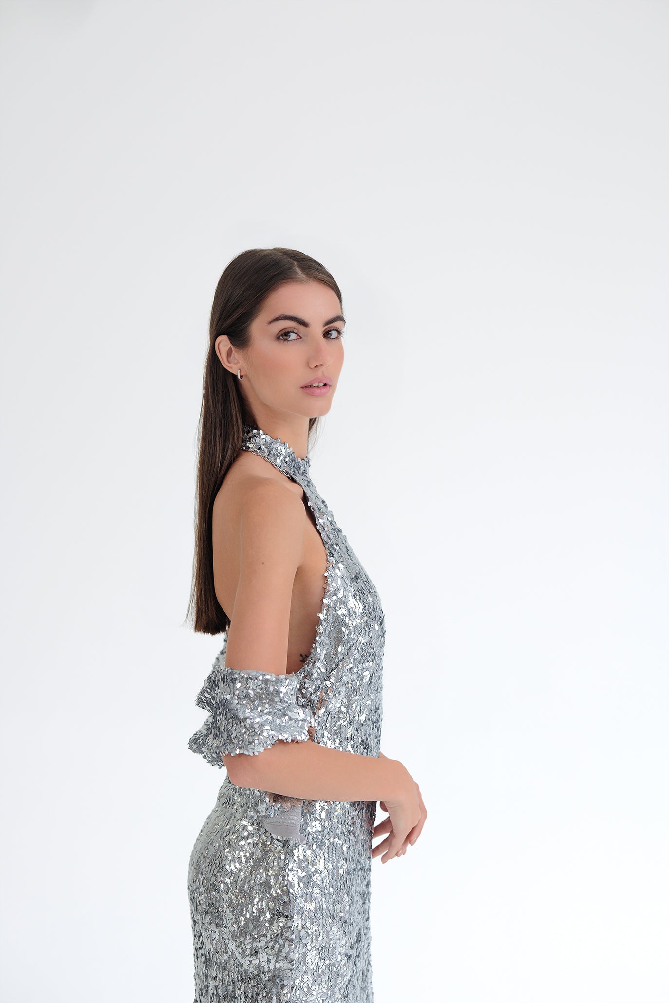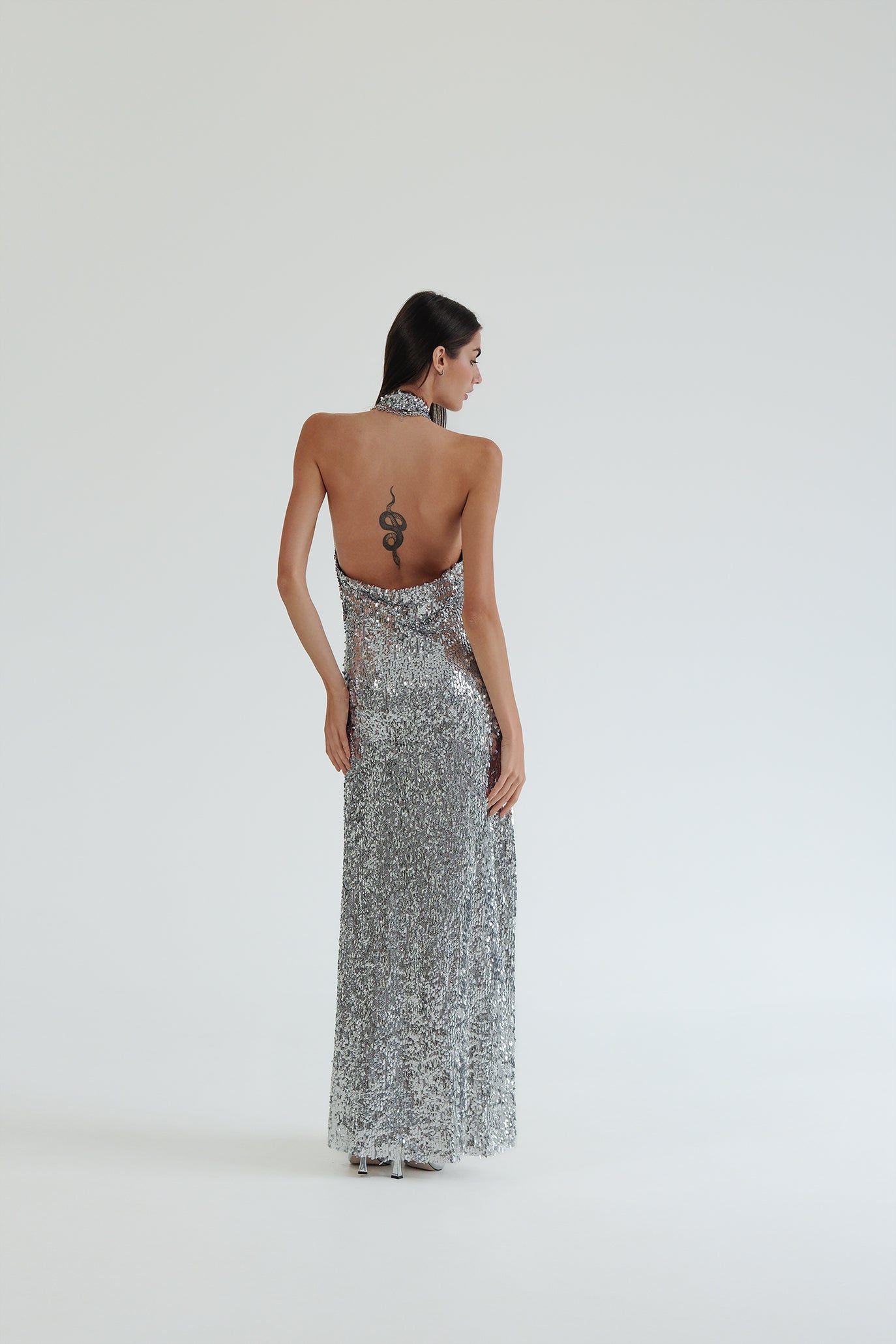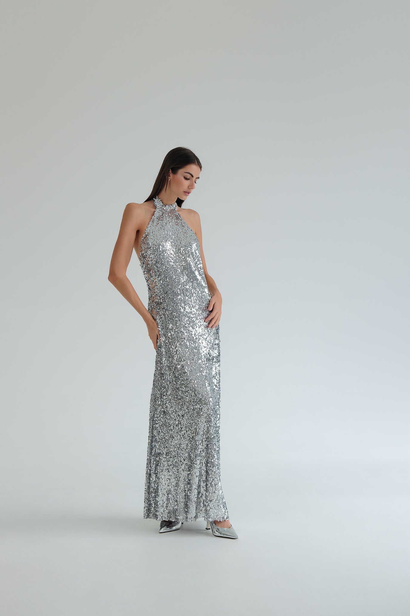 Дълга рокля, изработена от висококачествен еластичен специален плат с безброй пайети, който следва извивките на тялото и придава блясък. Кройката е с халтер деколте и гол гръб с извивка. Има мека подплата и силует тип русалка за пълен комфорт през цялата вечер. Може да се добави тип шал от същата материя с пайети срещу допълнително заплащане.