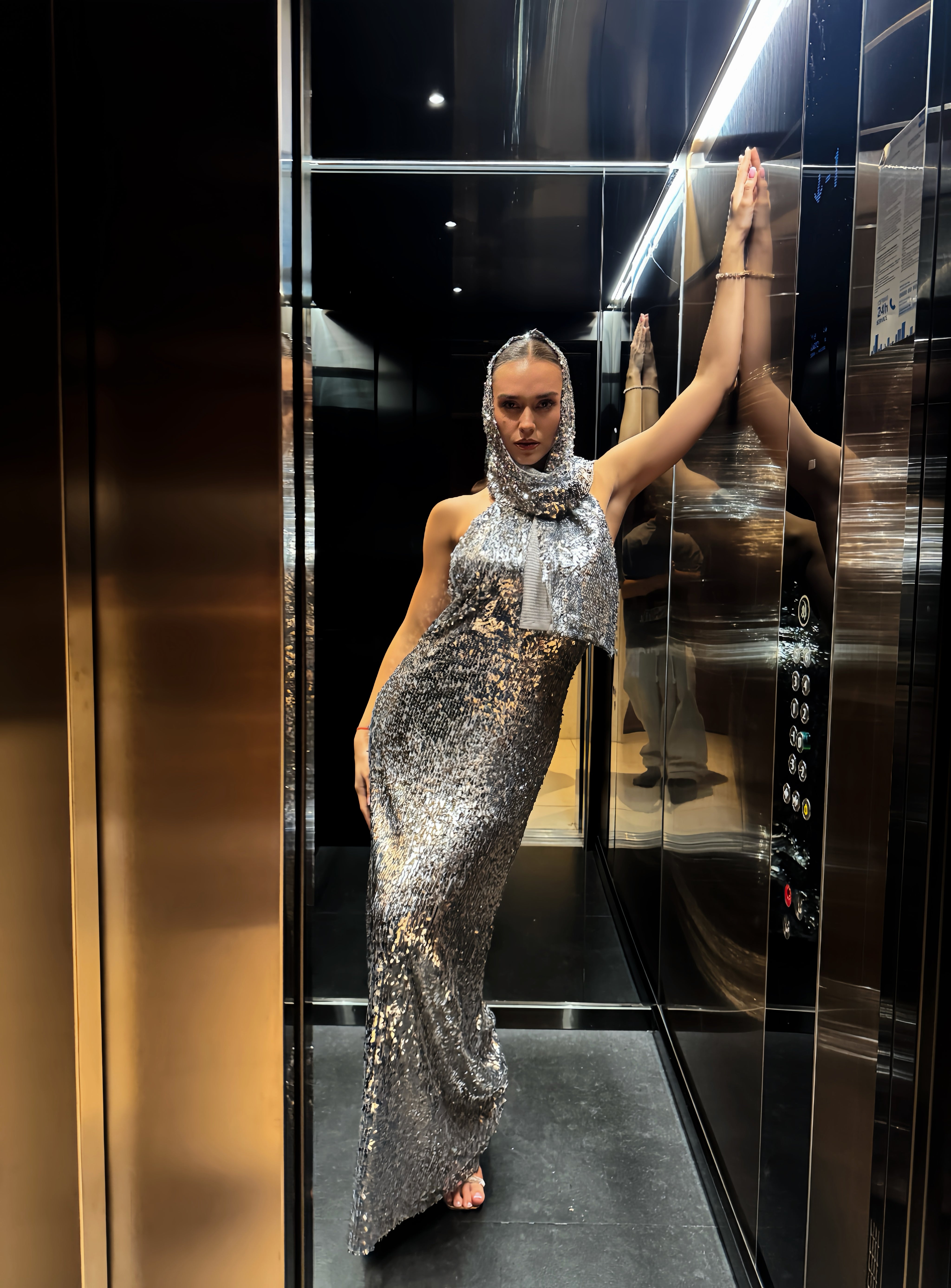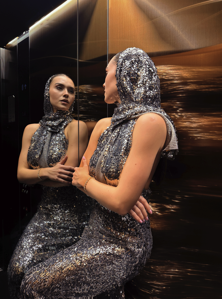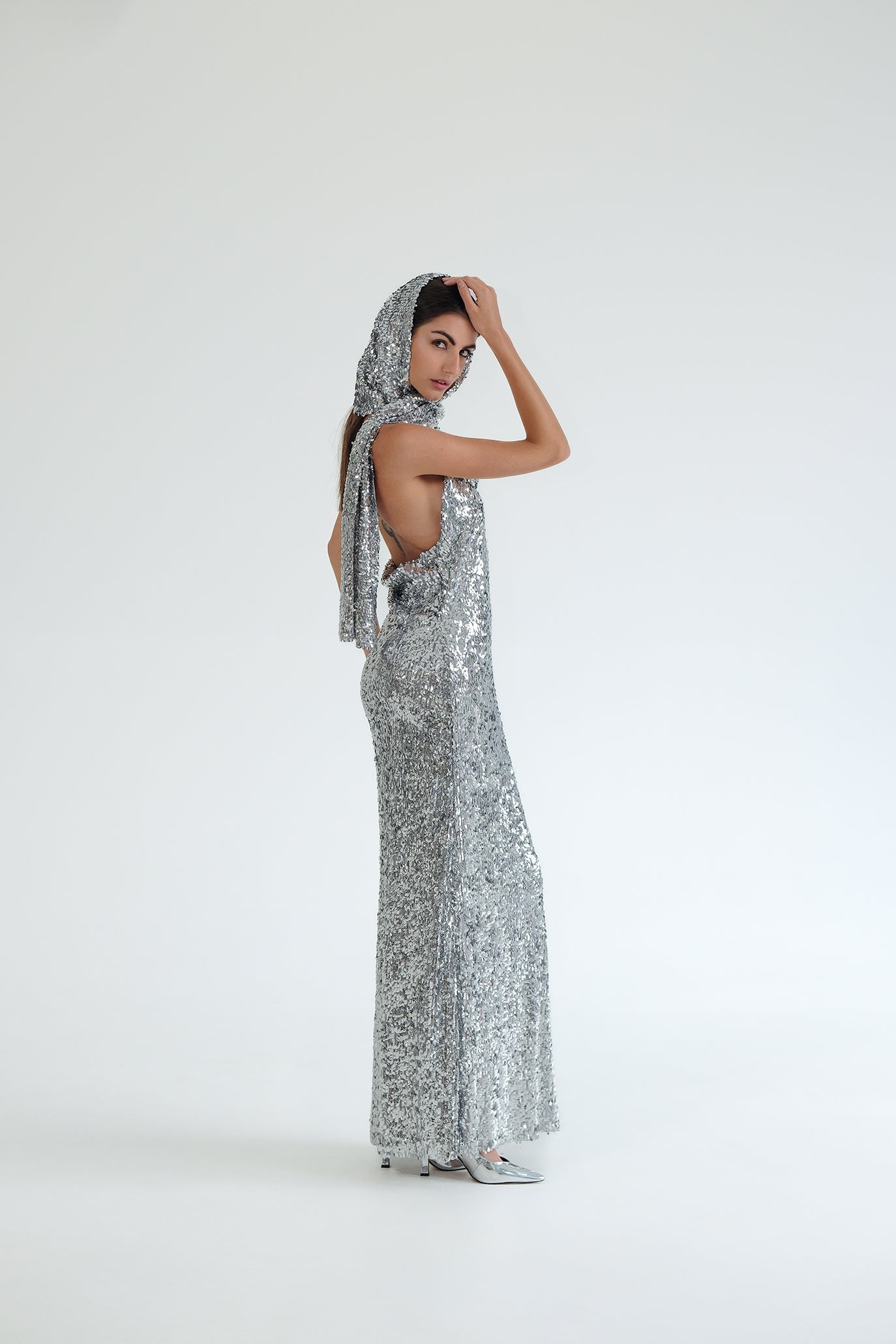 Дълга рокля, изработена от висококачествен еластичен специален плат с безброй пайети, който следва извивките на тялото и придава блясък. Кройката е с халтер деколте и гол гръб с извивка. Има мека подплата и силует тип русалка за пълен комфорт през цялата вечер. Може да се добави тип шал от същата материя с пайети срещу допълнително заплащане.