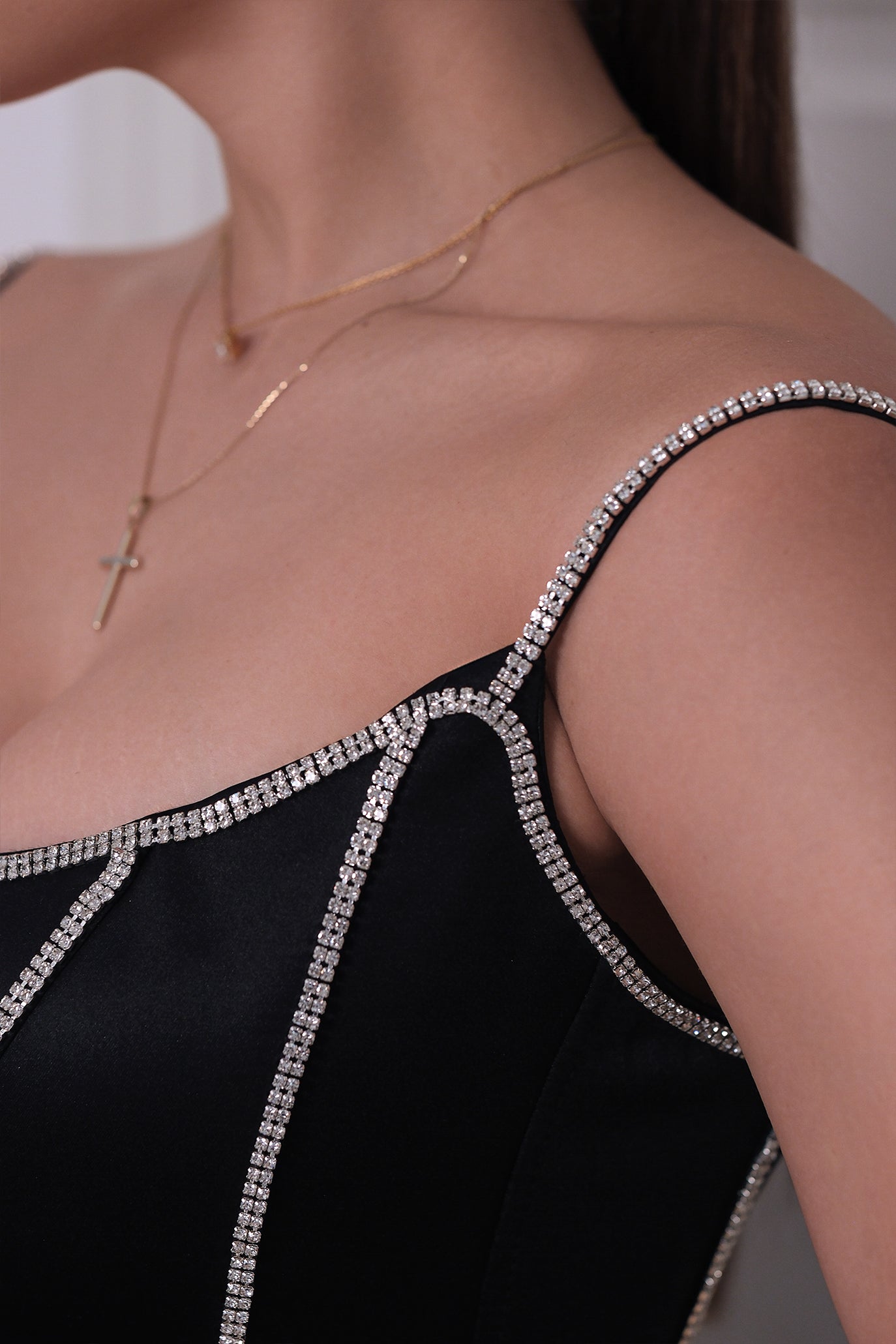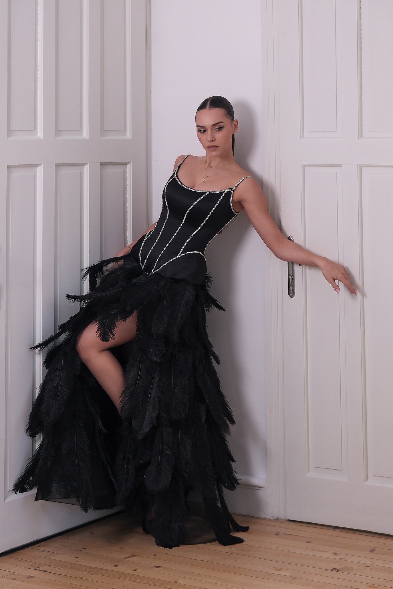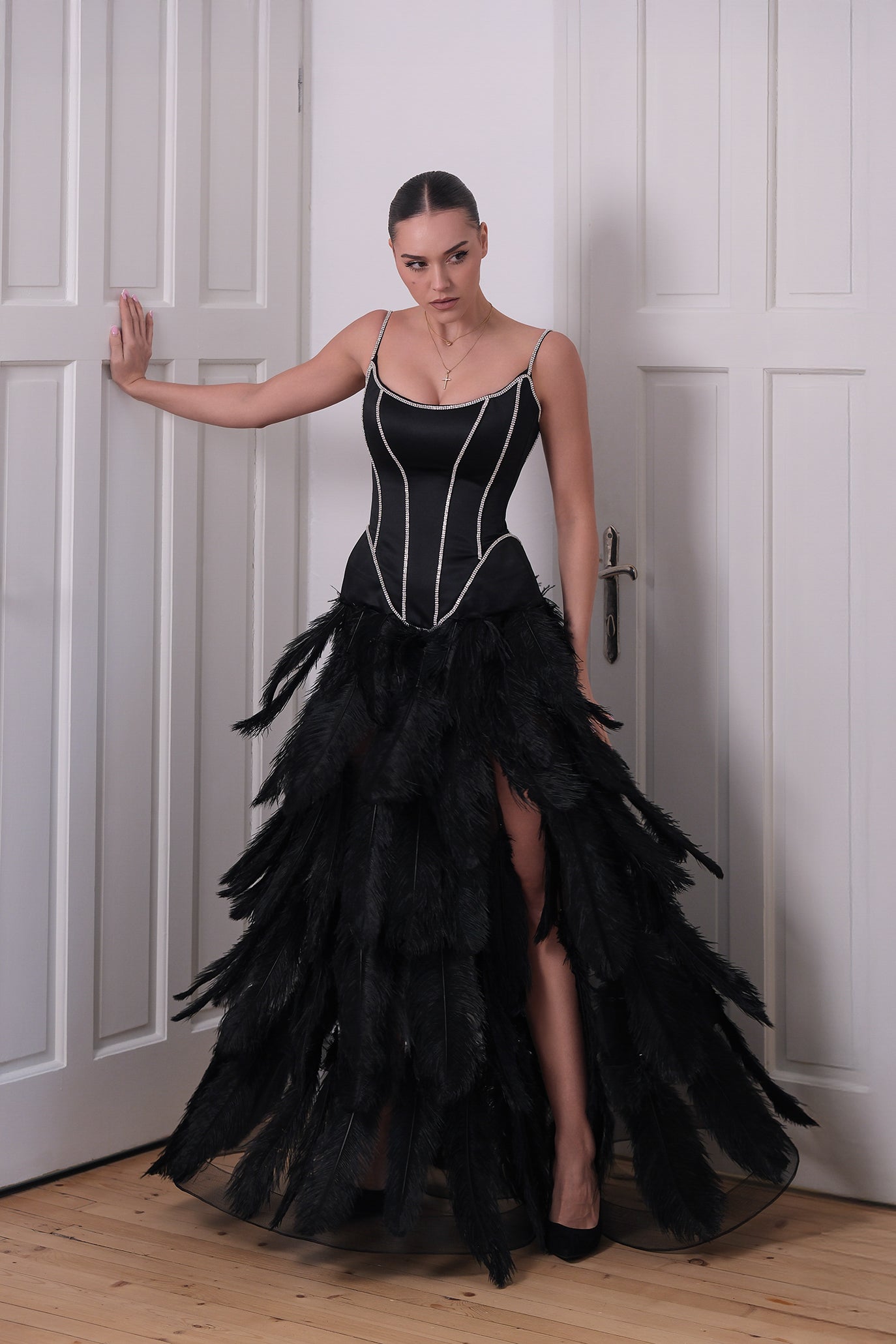 Дълга елегантна вечерна рокля. Горната част на роклята е с бюстие, оформено с корсетно завръзване за перфектна поддръжка и удобство, докато долната част се отличава с разкошни пера, които придават динамичност и усещане за лукс. Завършена с фини детайли и изящни бродерии, роклята акцентира на естествената фигура, създавайки зашеметяващ силует.