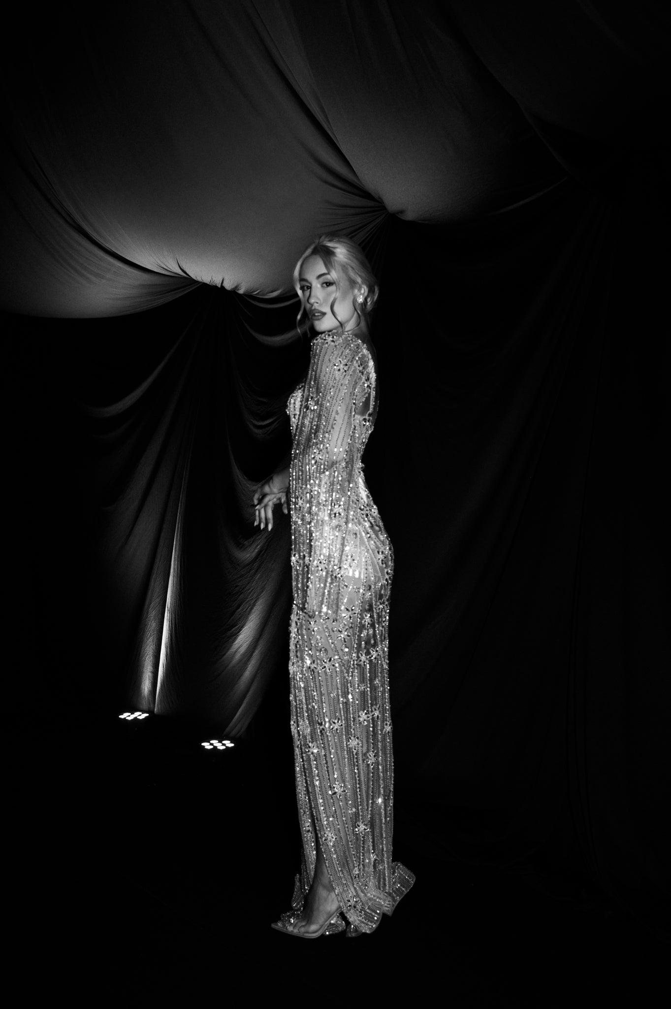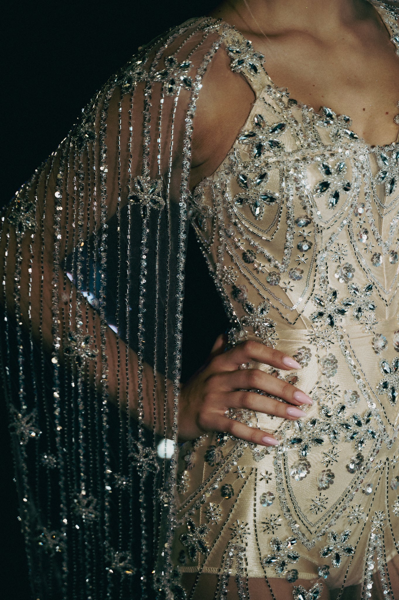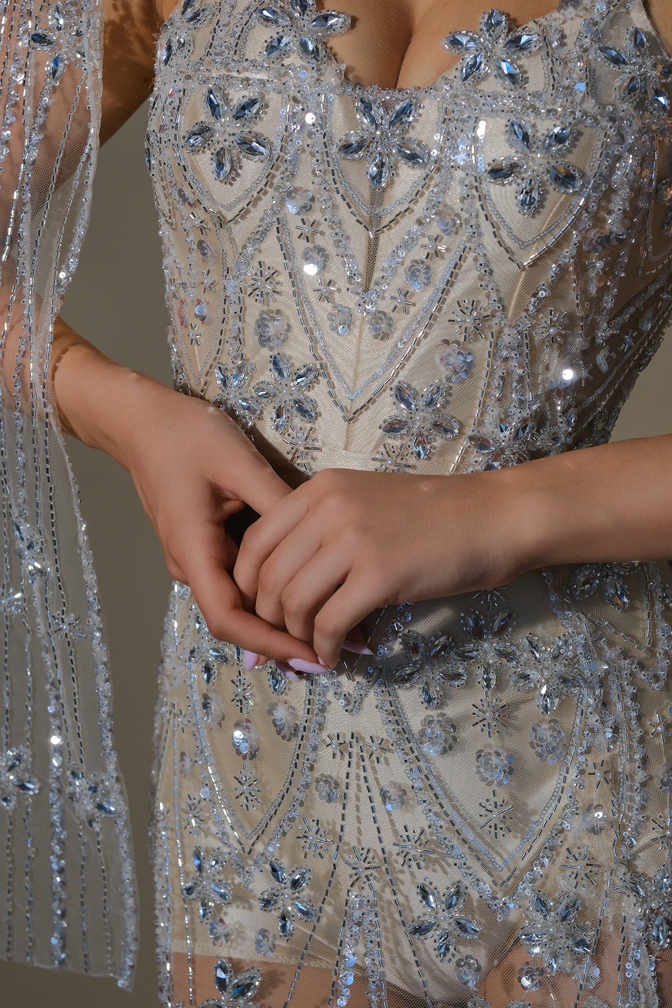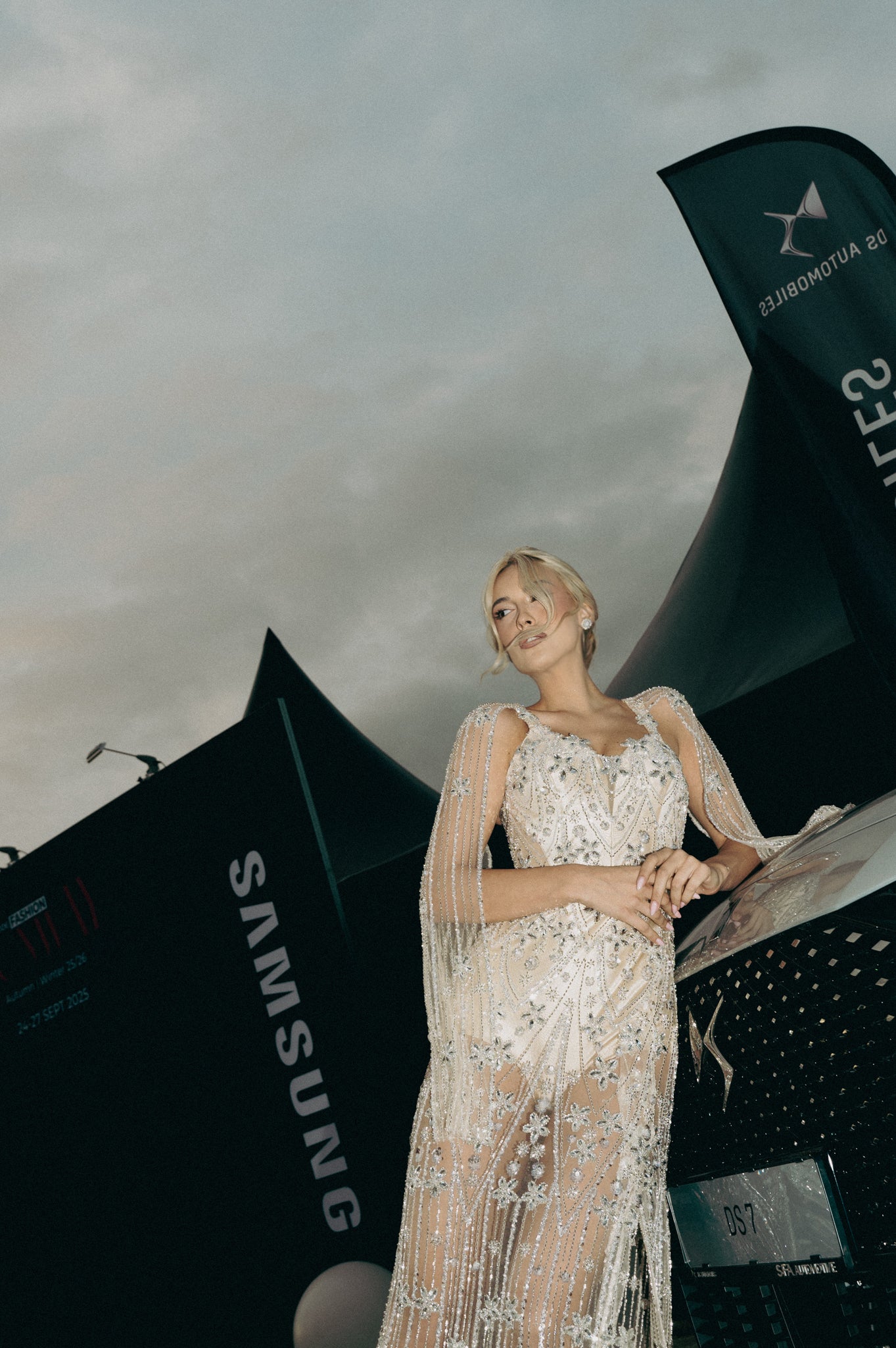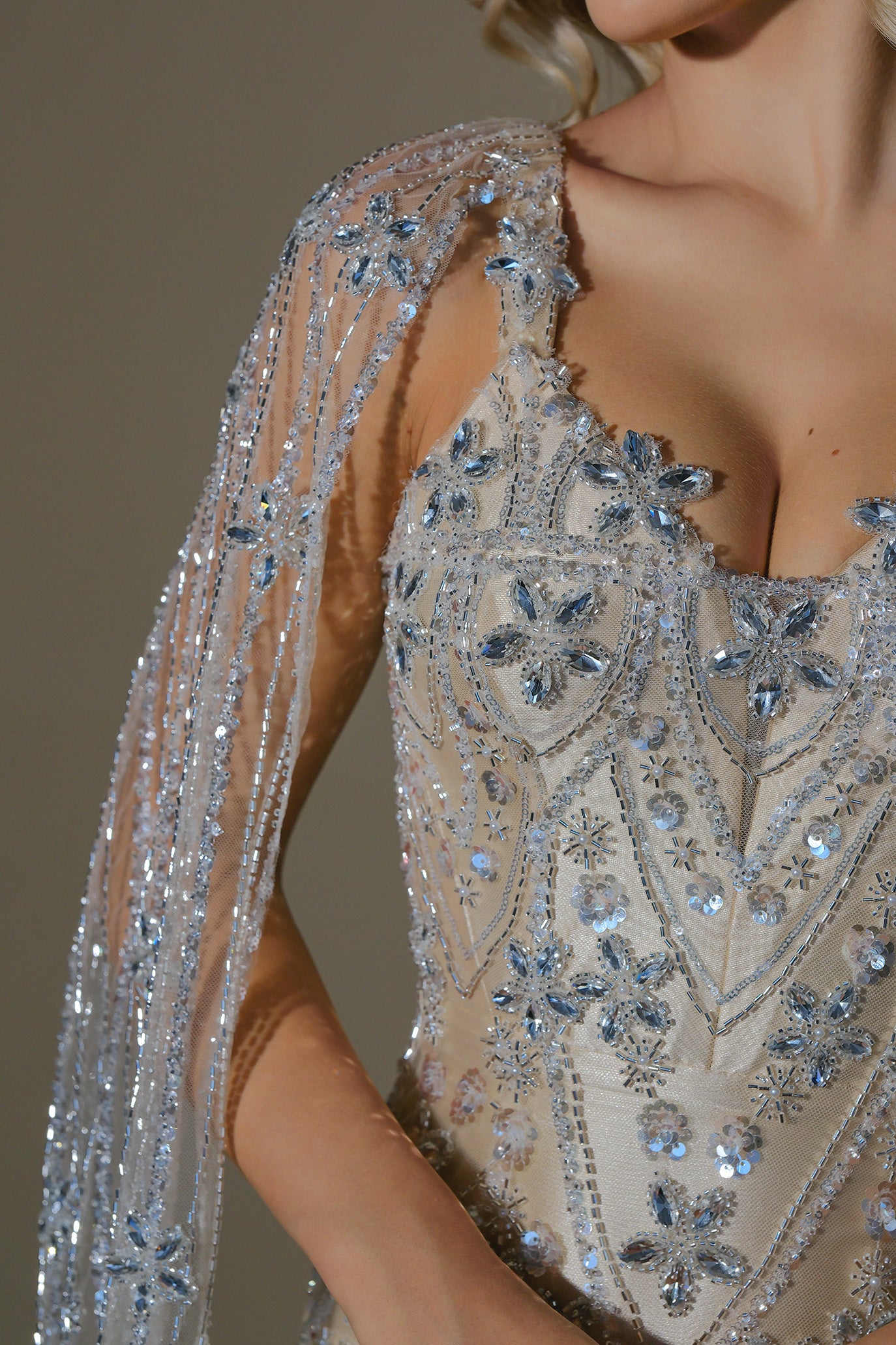 Висша вечерна елегантност с блясък на червен килим. Роклята е изцяло покрита с кристали, пайети и перли върху фин тюл, подредени във флорални и геометрични мотиви. Корсетната горна част с банели и оформени чашки поддържа и оформя бюста и талията, а падналото рамо прелива в несравними, движещи се ръкави, които при всяка стъпка създават неповторим ефект. Прозрачният ефект на горната пола върху нюд подплатата и високата цепка издължават силуета.