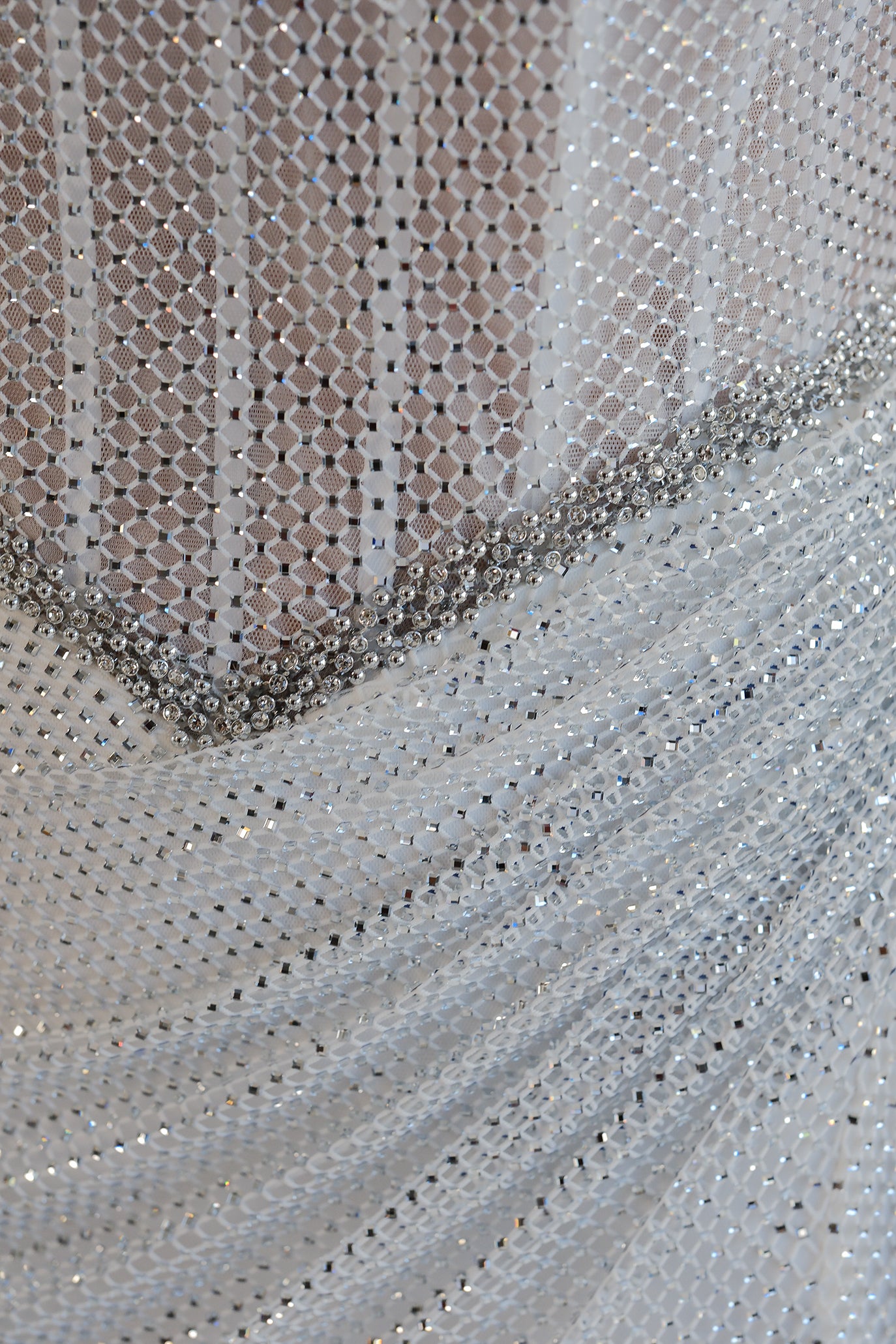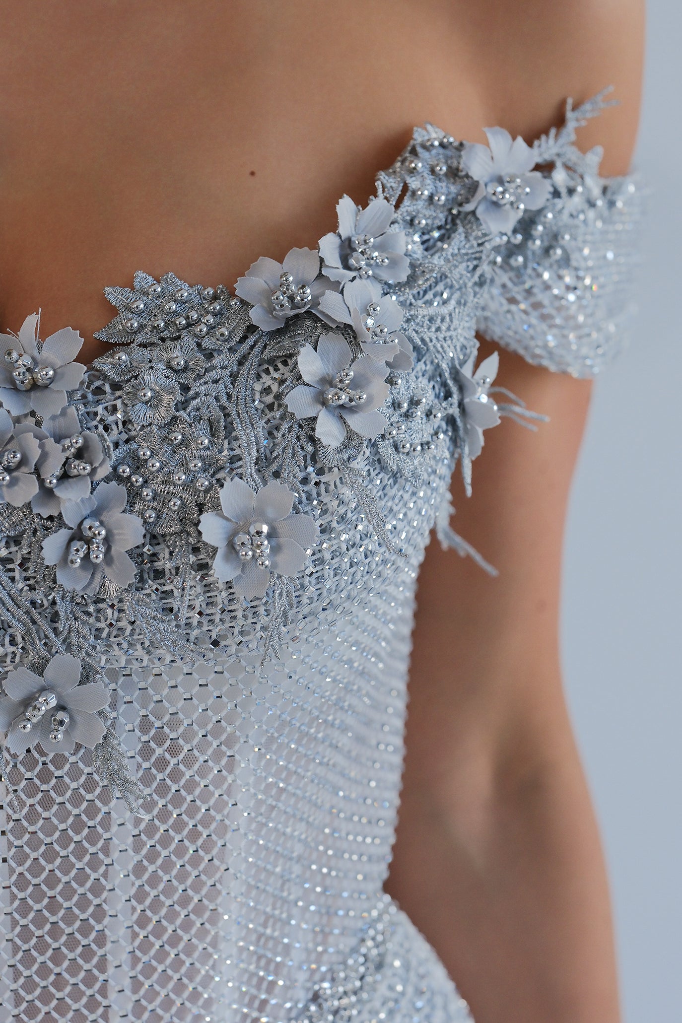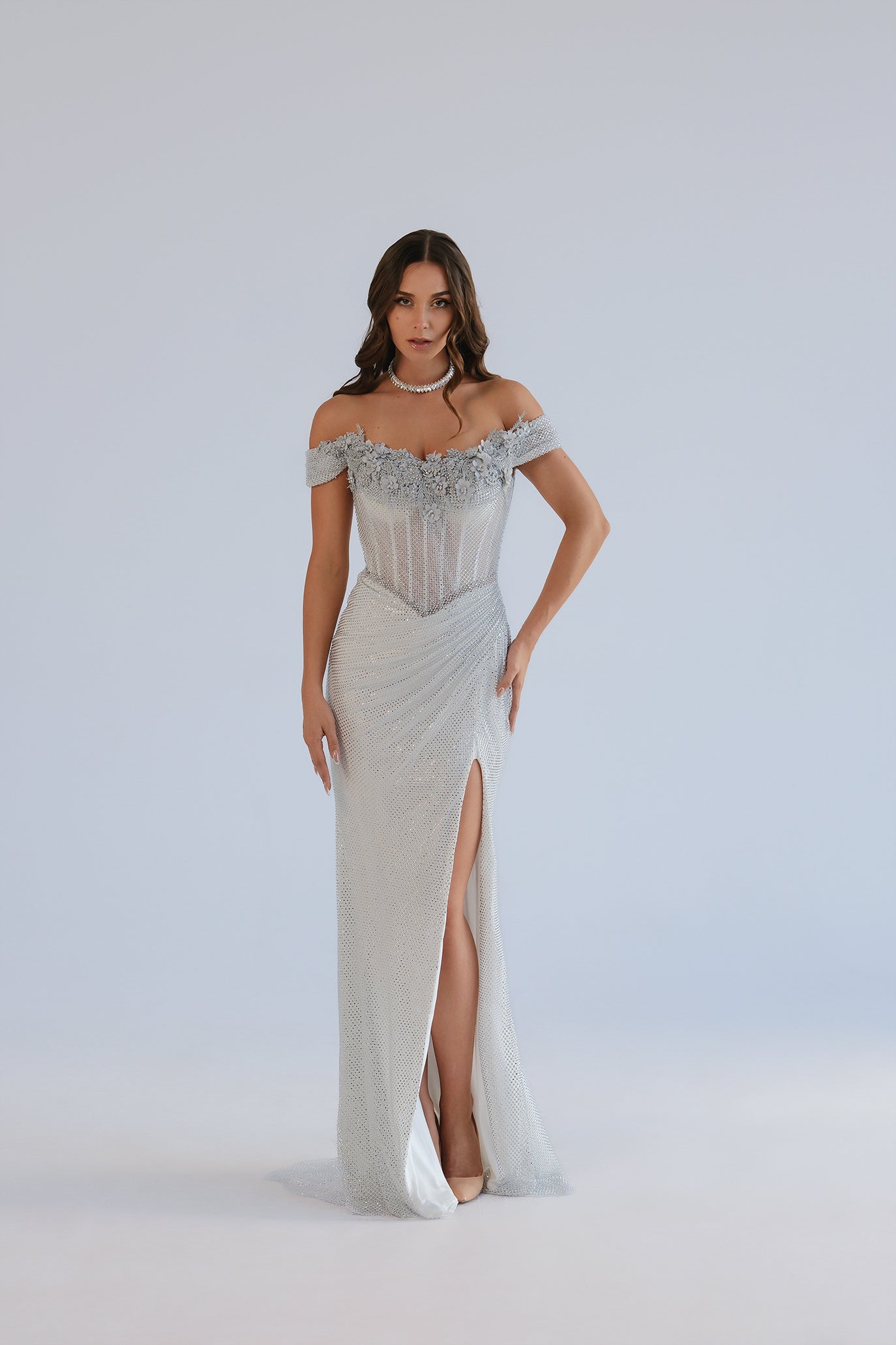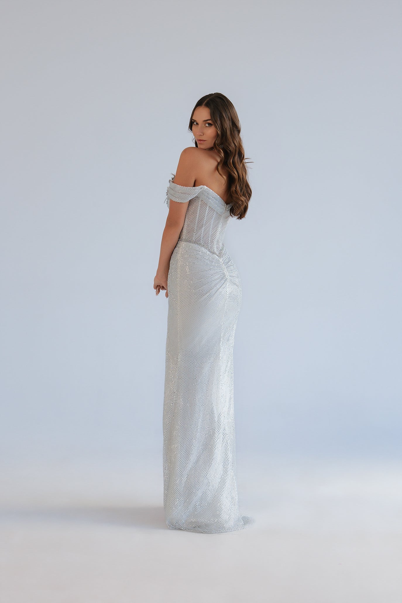 Елегантна дълга вечерна рокля с off-shoulder деколте и изящно декориран корсет. Горната част е полупрозрачна с фини банели и ръчно нашити кристали в златна гама, които преливат като бижу около бюста и раменете. Полата е по тялото с ефектно драпиране на бедрото, висока цепка отпред и лек шлейф за удължен силует. Моделът е изработен от златист плат с микропайети, който дава интензивен блясък и комфорт при движение. Вградени чашки и тънка подплата за стабилност и удобство. Продуктът пристига в персонализиран калъф.