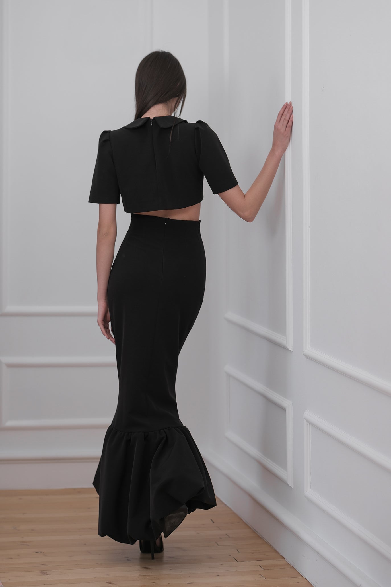 Пола, създадена да подчертае силуета с изчистена кройка и изразена женственост. Полата е с висока талия и изчистена линия в горната част, която преминава в ефирен разкроен подгъв за движение и лекота. Закопчава се с цип отзад.