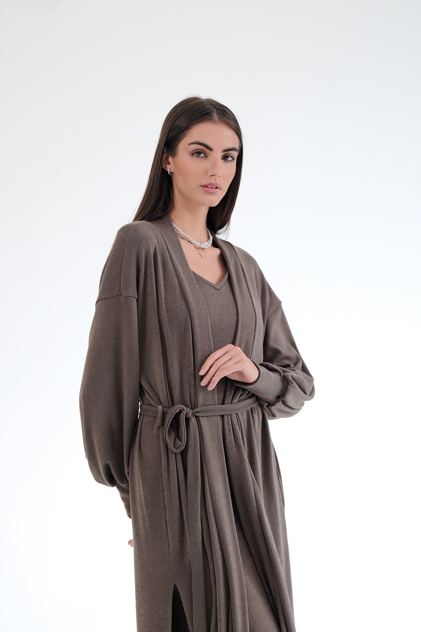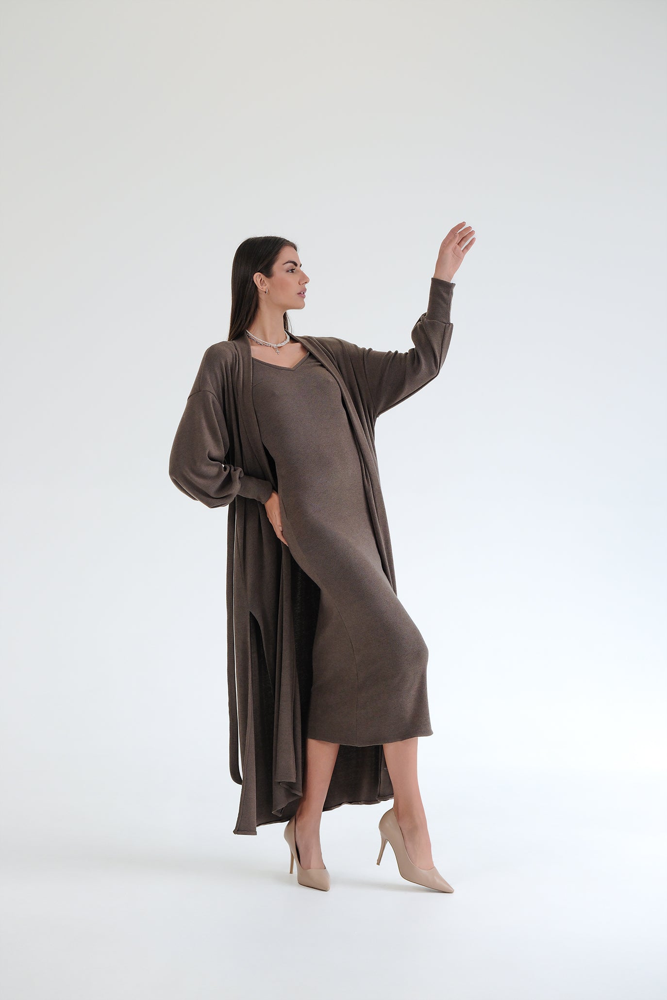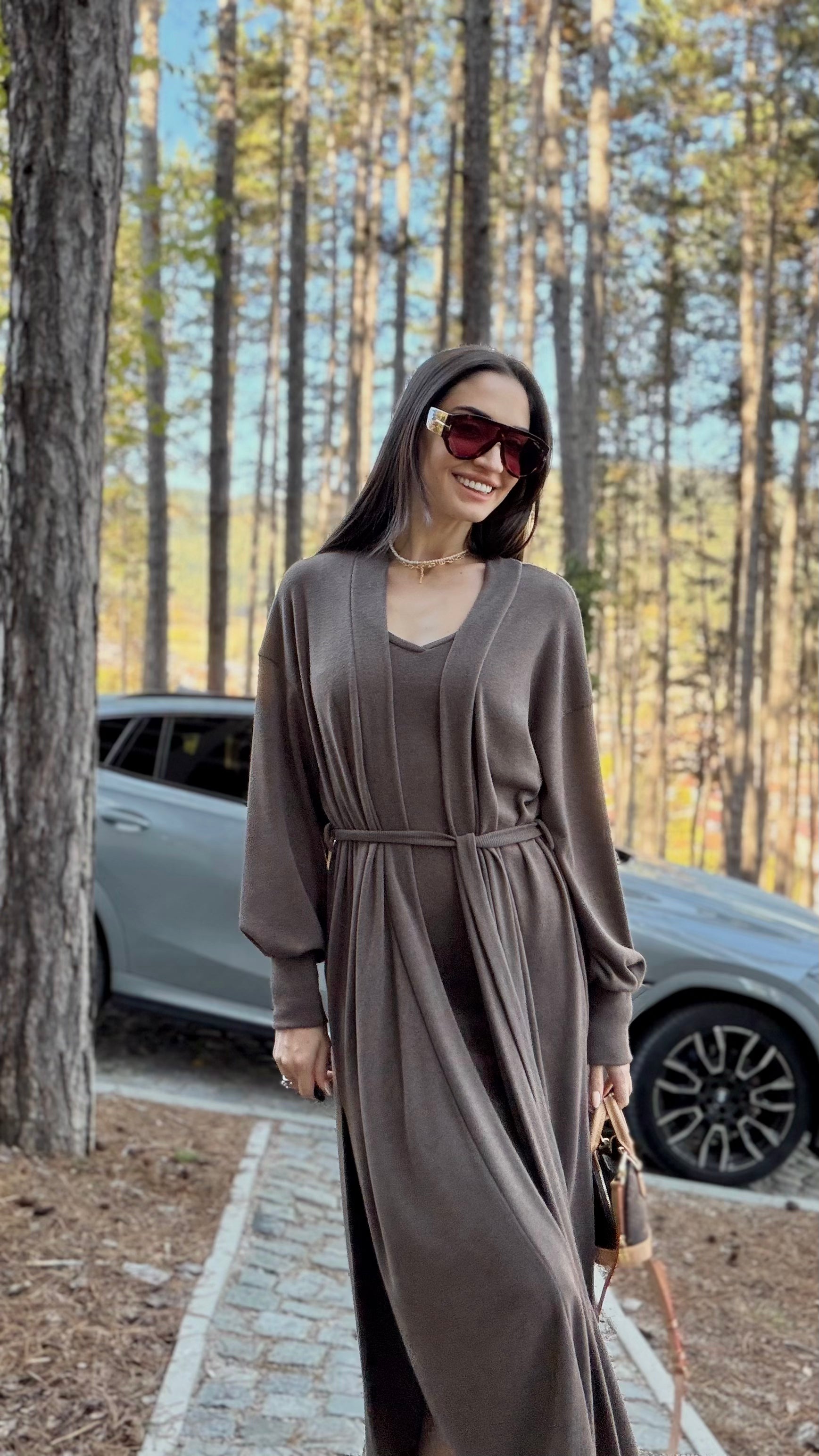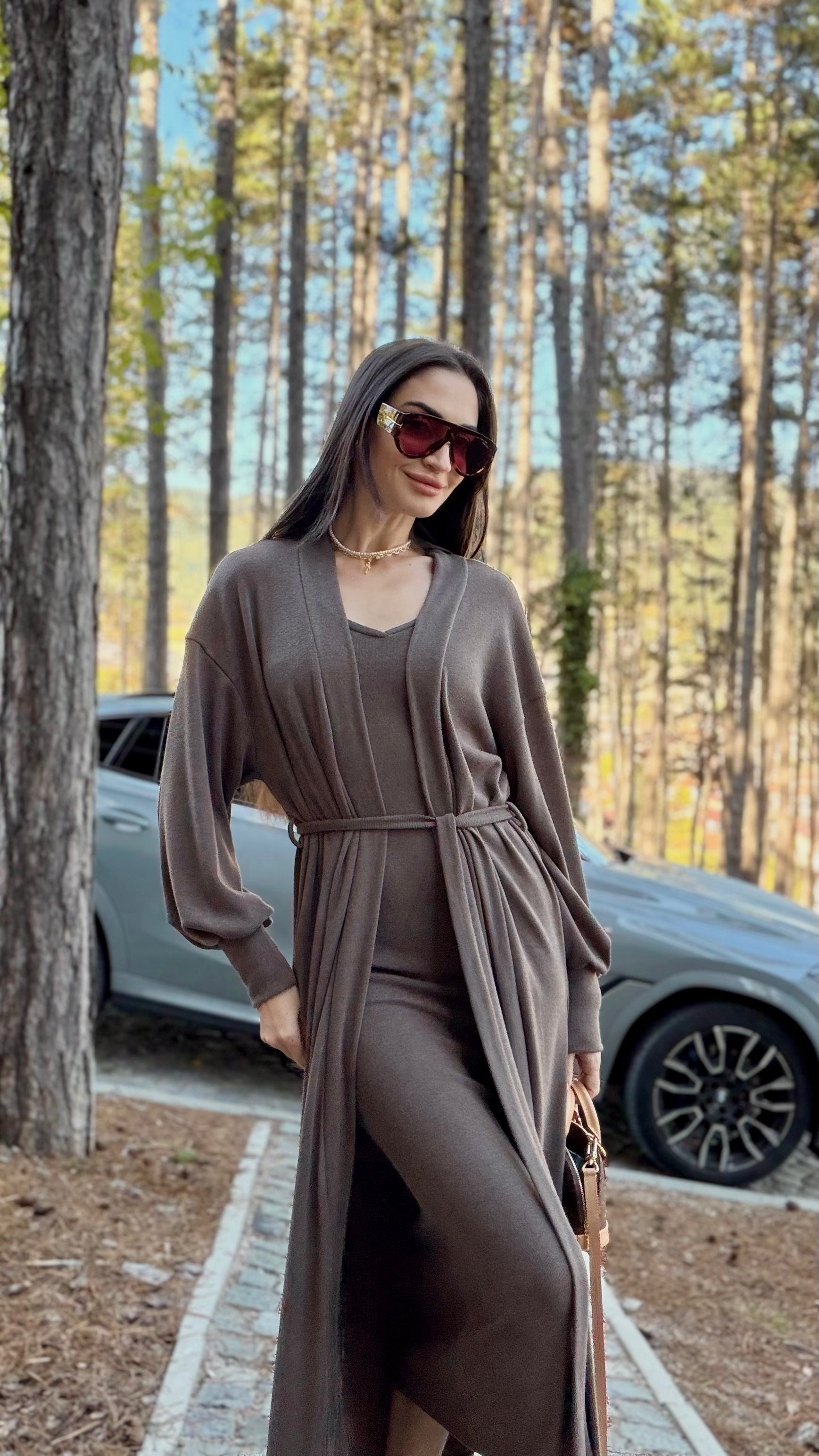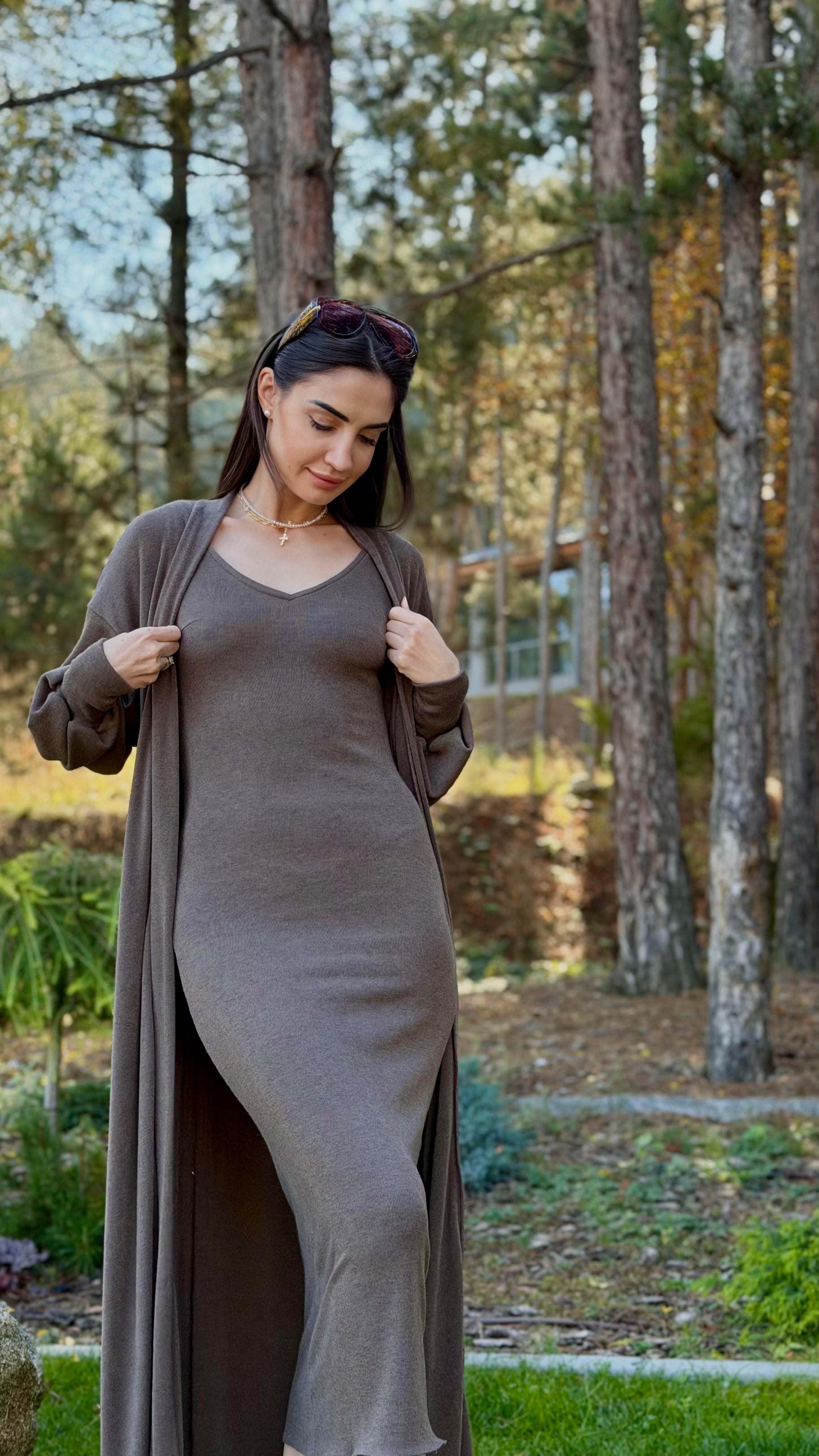 Елегантен сет от двe части – прилягаща миди рокля и дълга жилетка в същия цвят. Роклята е изработена от много мека, еластична трикотажна материя, която прегръща силуета и осигурява комфорт през целия ден. Чистата линия е подчертана от V-образно деколте и дължина под коляното – универсална основа както за ежедневието, така и за по-официални поводи. Жилетката е със свободна, падаща кройка, дълги обемни ръкави и колан от същата материя, който позволява да се носи както отворена, така и пристегната в талията. Универсален размер – стои красиво на различни височини и фигури и лесно се наслоява върху рокли, топове и панталони.