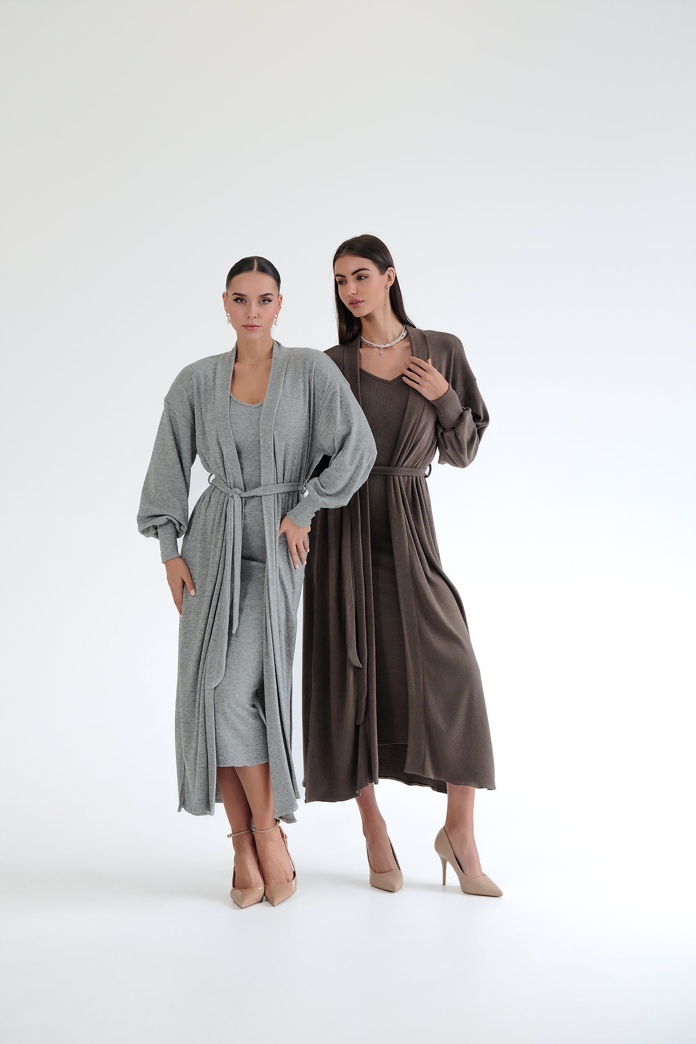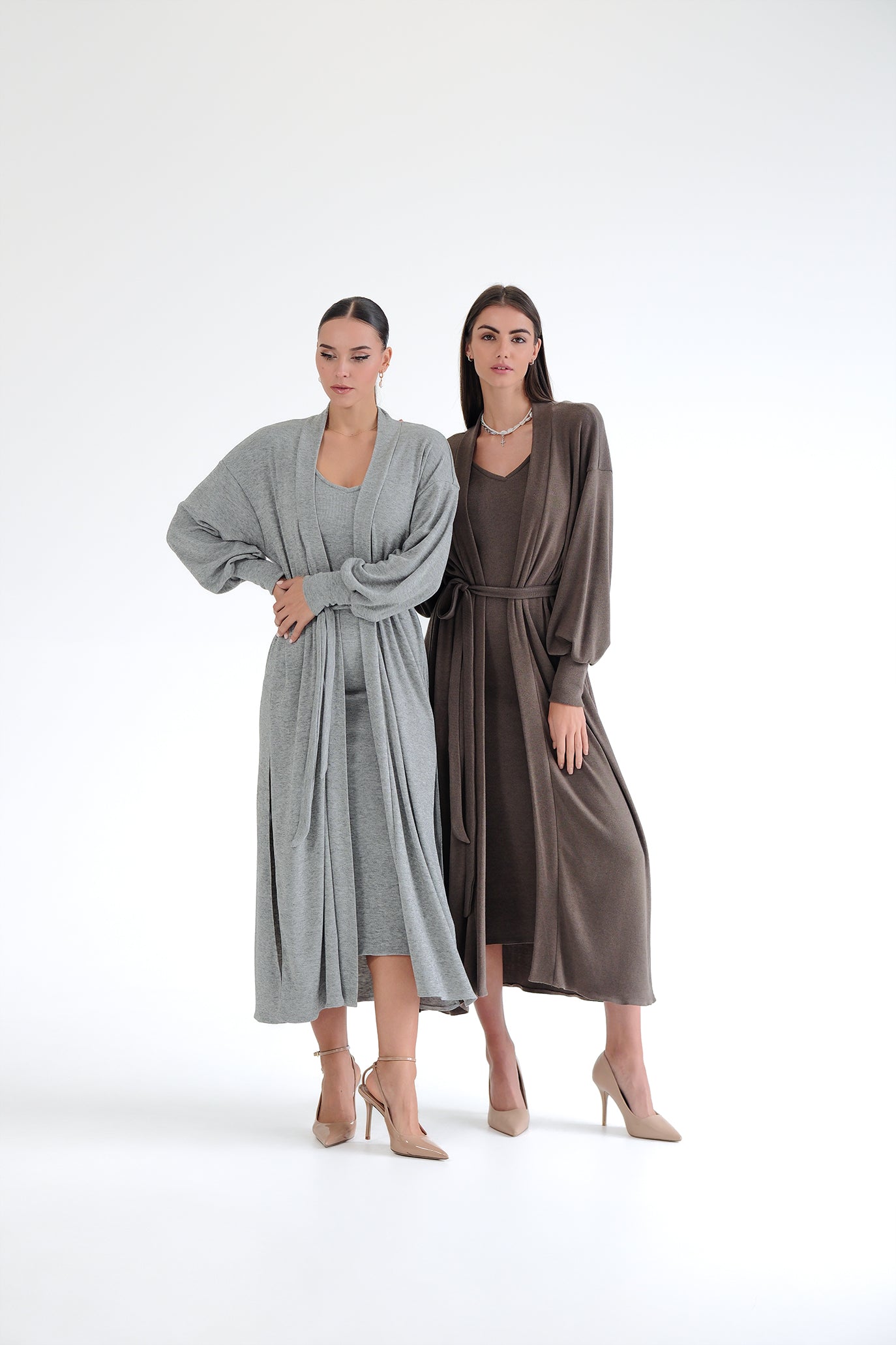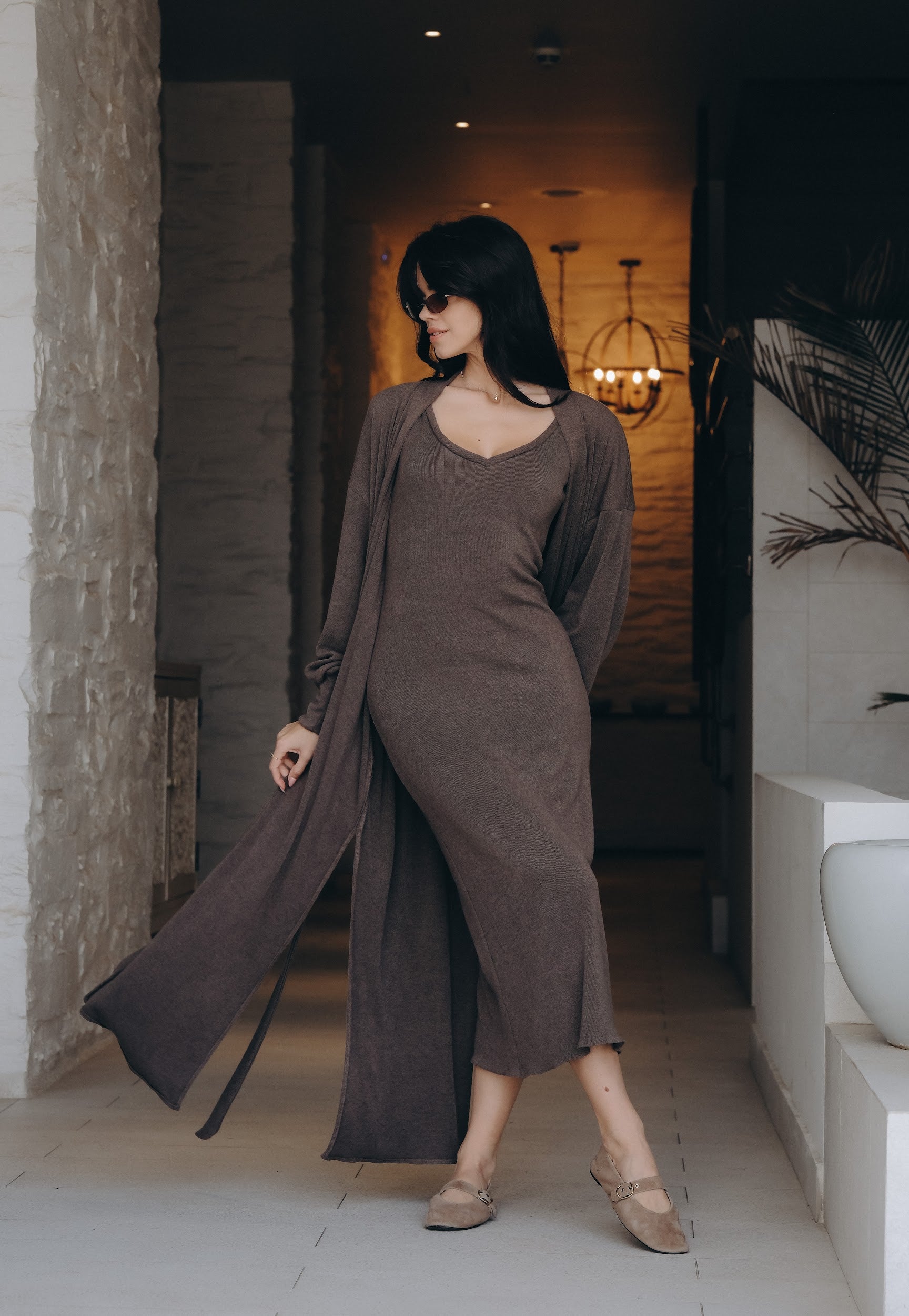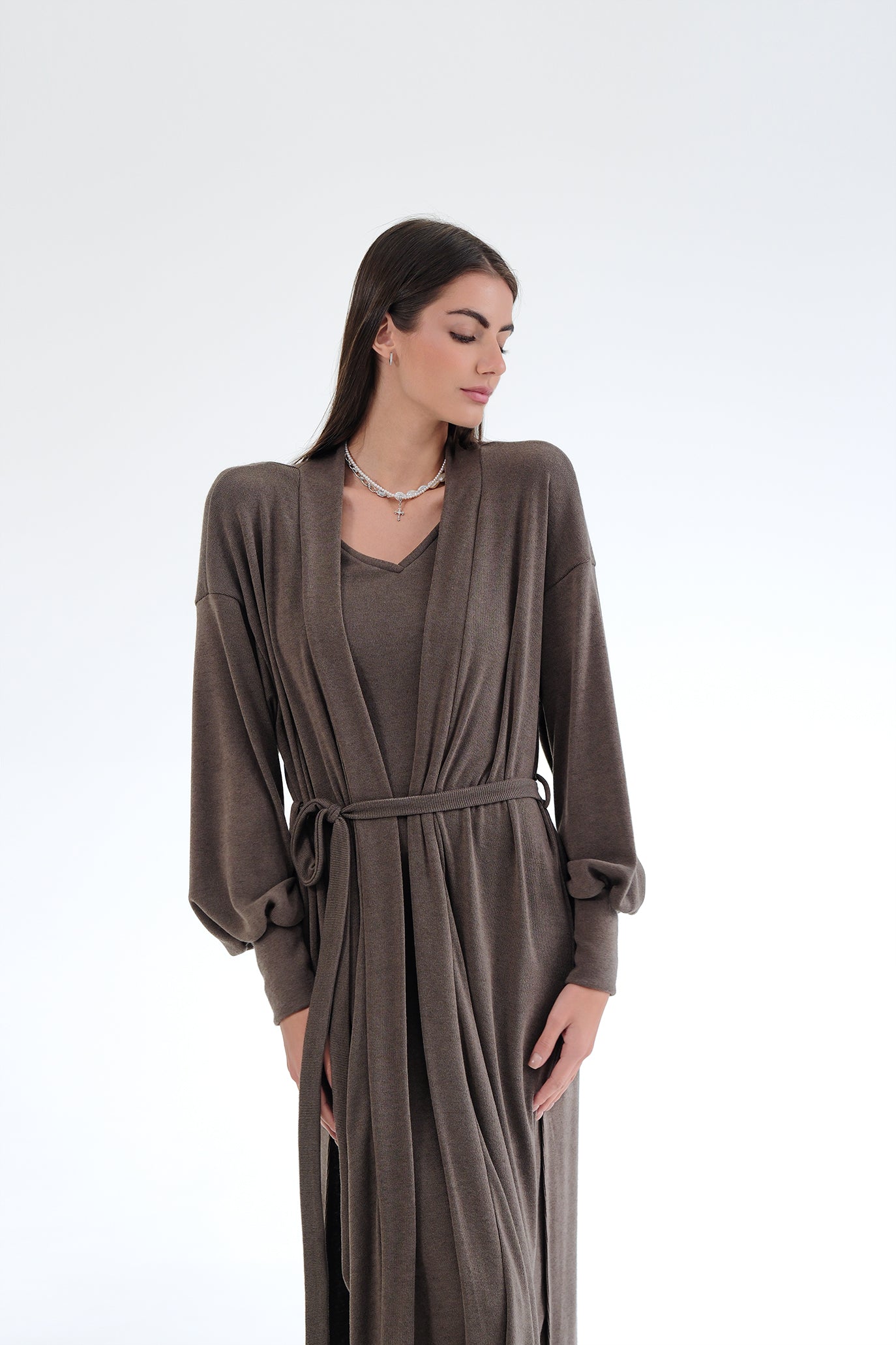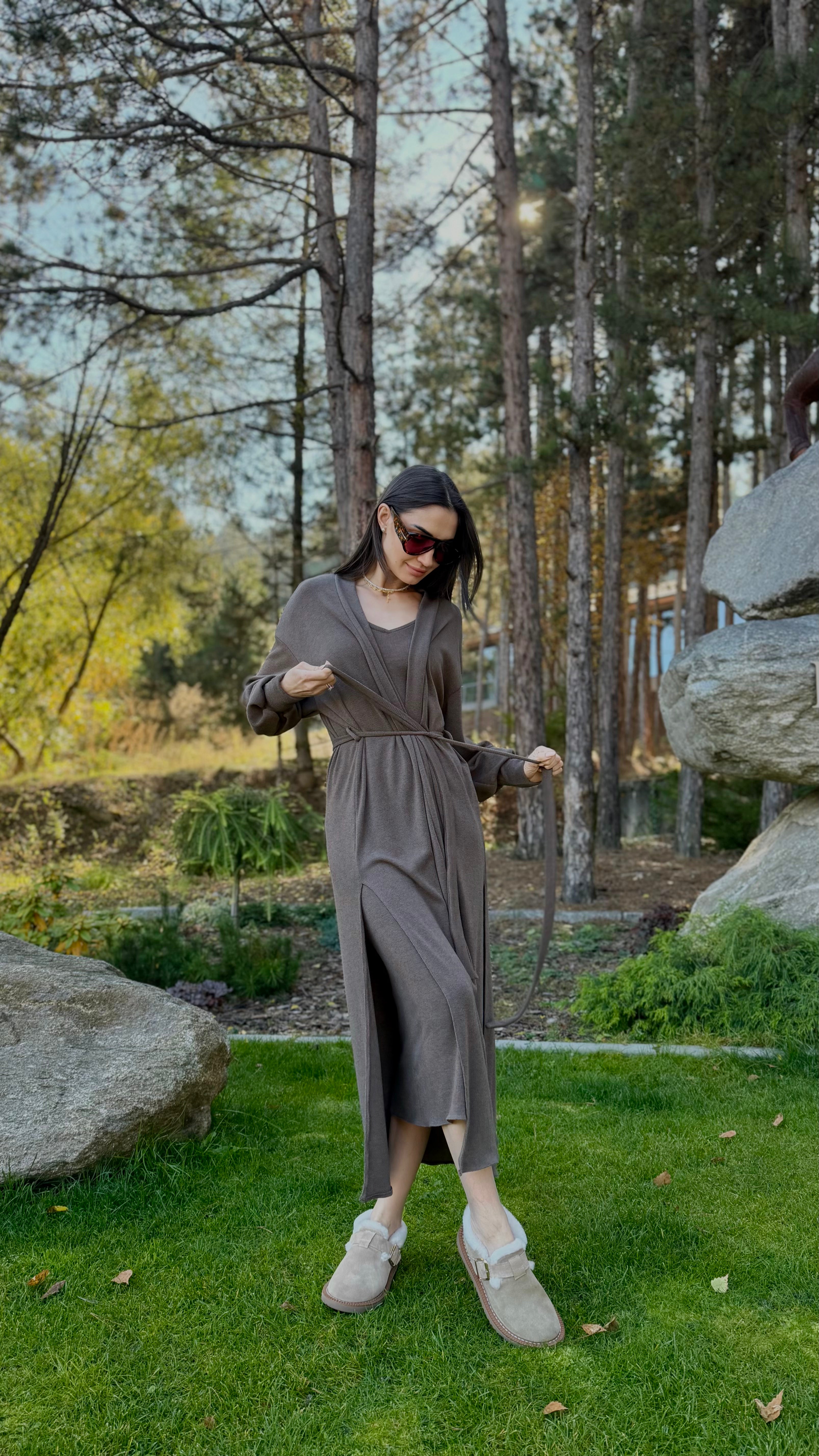 Елегантен сет от двe части – прилягаща миди рокля и дълга жилетка в същия цвят. Роклята е изработена от много мека, еластична трикотажна материя, която прегръща силуета и осигурява комфорт през целия ден. Чистата линия е подчертана от V-образно деколте и дължина под коляното – универсална основа както за ежедневието, така и за по-официални поводи. Жилетката е със свободна, падаща кройка, дълги обемни ръкави и колан от същата материя, който позволява да се носи както отворена, така и пристегната в талията. Универсален размер – стои красиво на различни височини и фигури и лесно се наслоява върху рокли, топове и панталони.