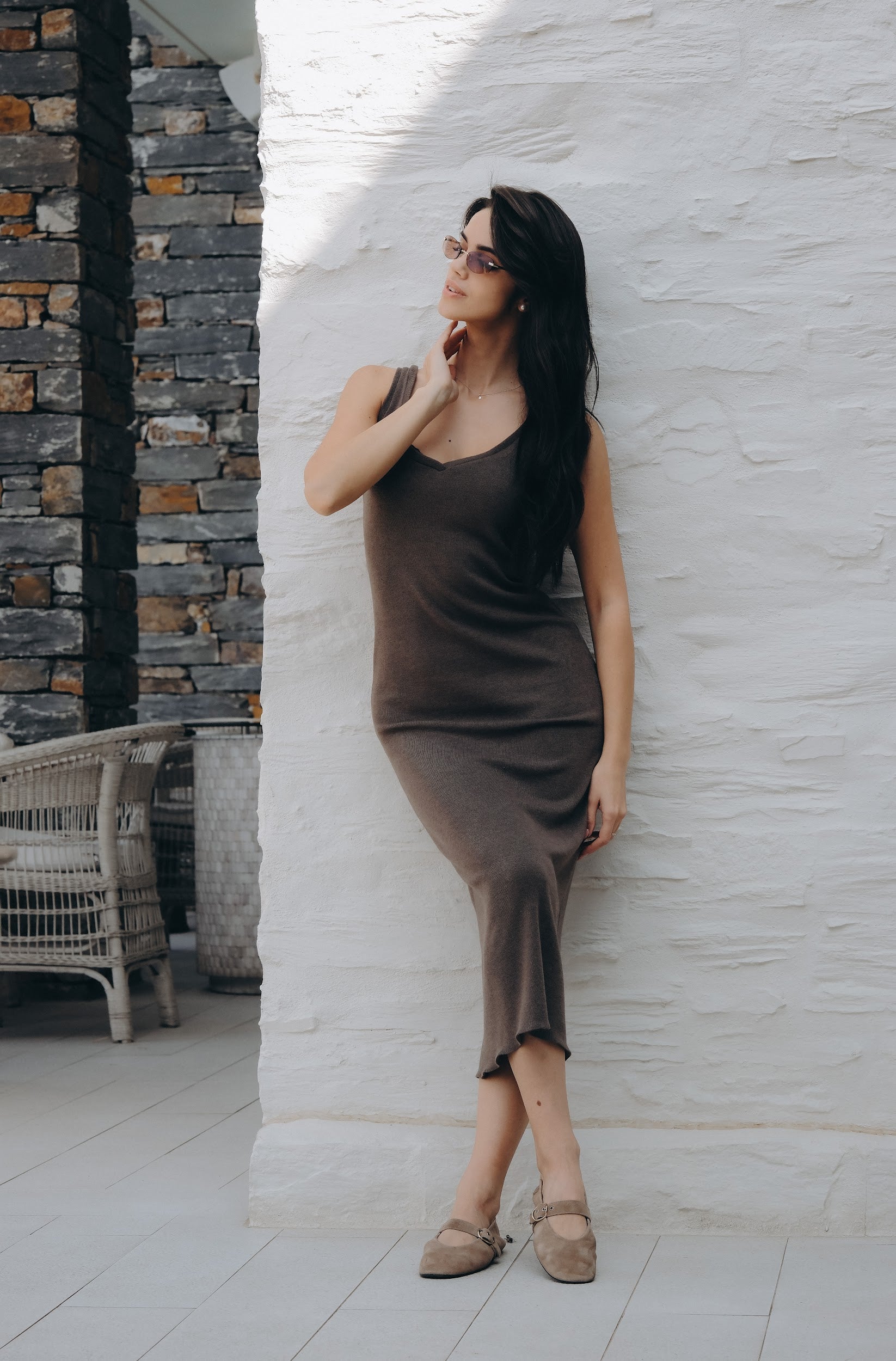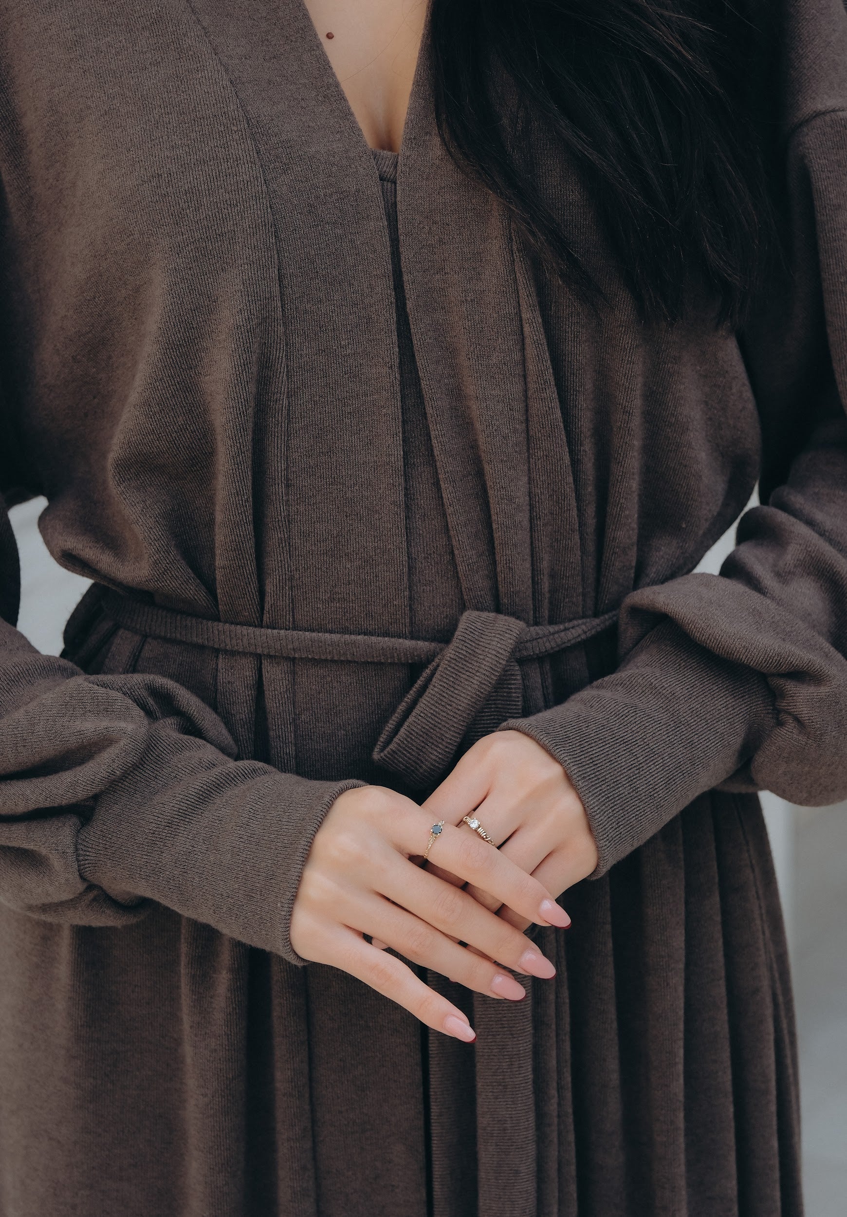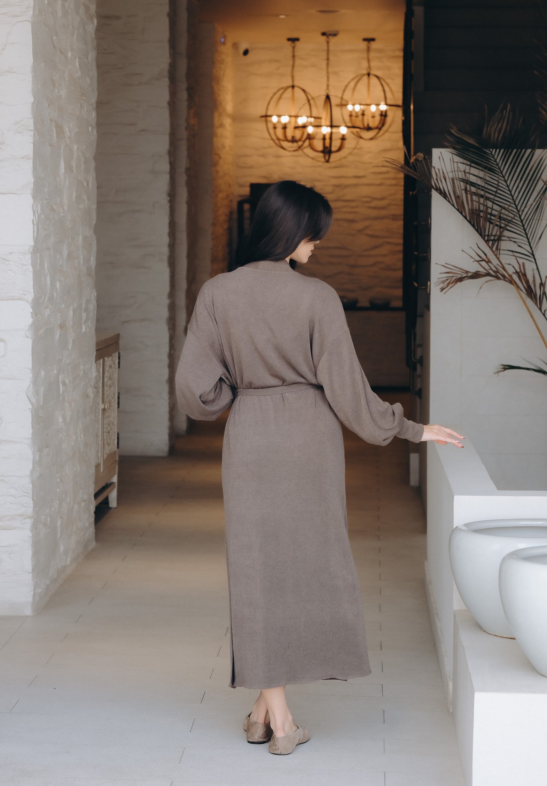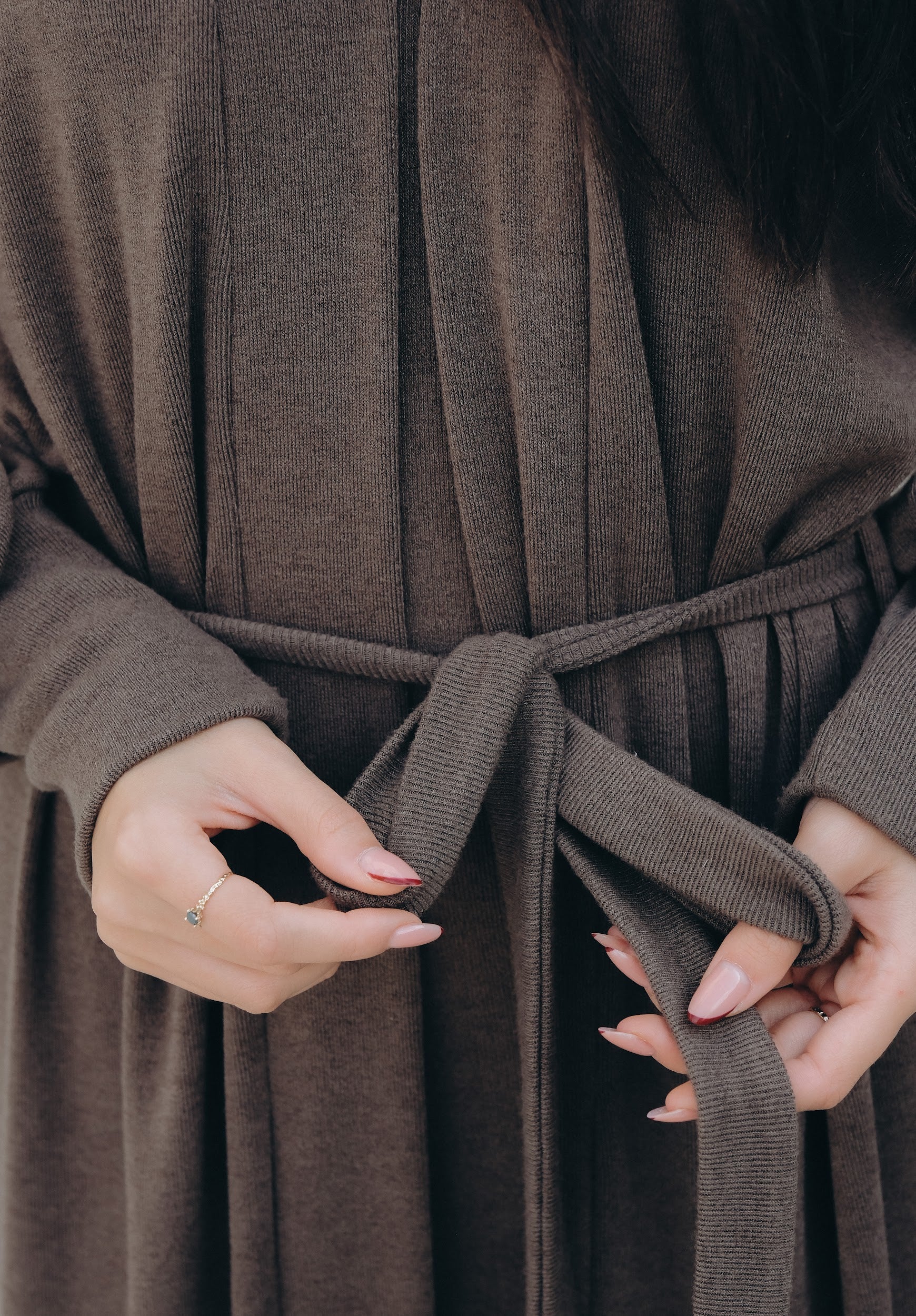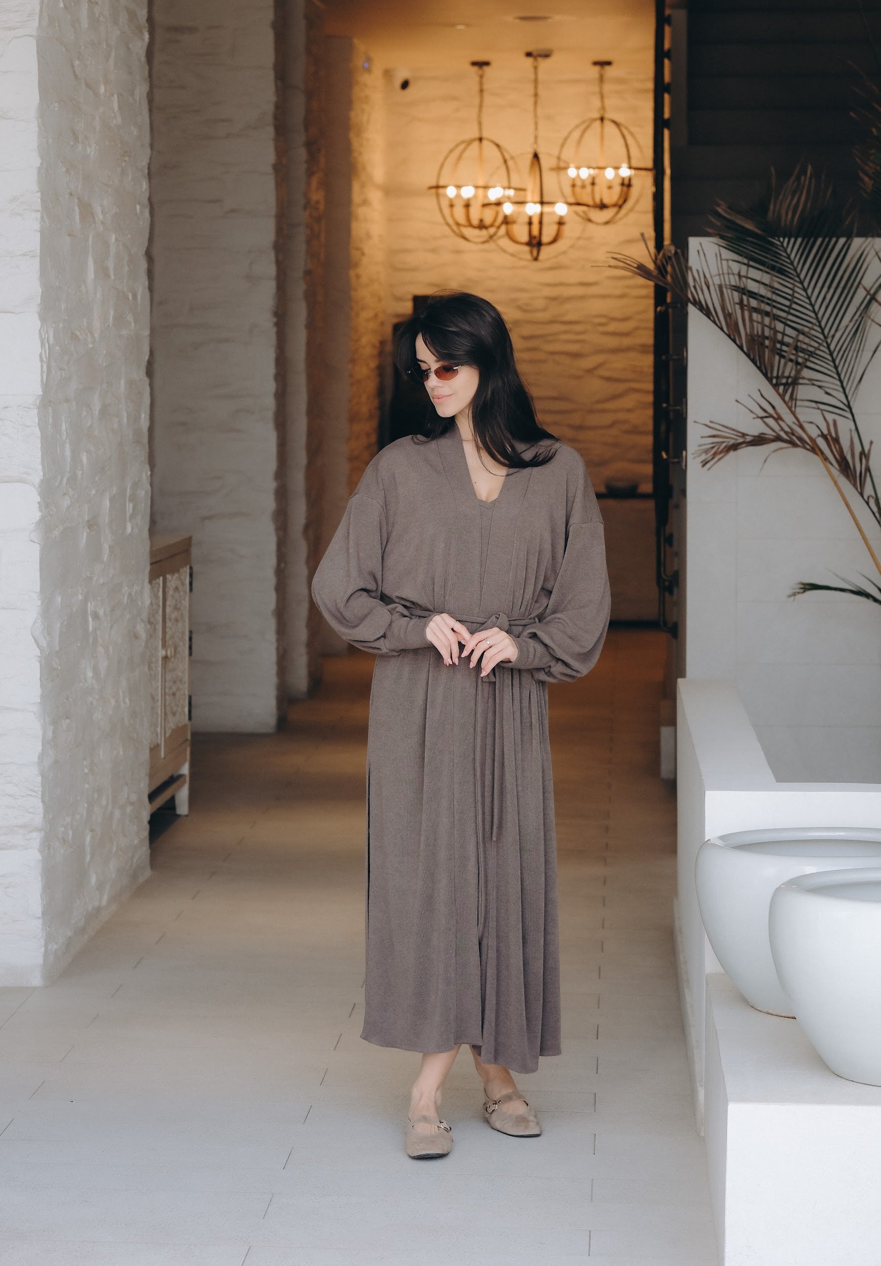 Елегантен сет от двe части – прилягаща миди рокля и дълга жилетка в същия цвят. Роклята е изработена от много мека, еластична трикотажна материя, която прегръща силуета и осигурява комфорт през целия ден. Чистата линия е подчертана от V-образно деколте и дължина под коляното – универсална основа както за ежедневието, така и за по-официални поводи. Жилетката е със свободна, падаща кройка, дълги обемни ръкави и колан от същата материя, който позволява да се носи както отворена, така и пристегната в талията. Универсален размер – стои красиво на различни височини и фигури и лесно се наслоява върху рокли, топове и панталони.