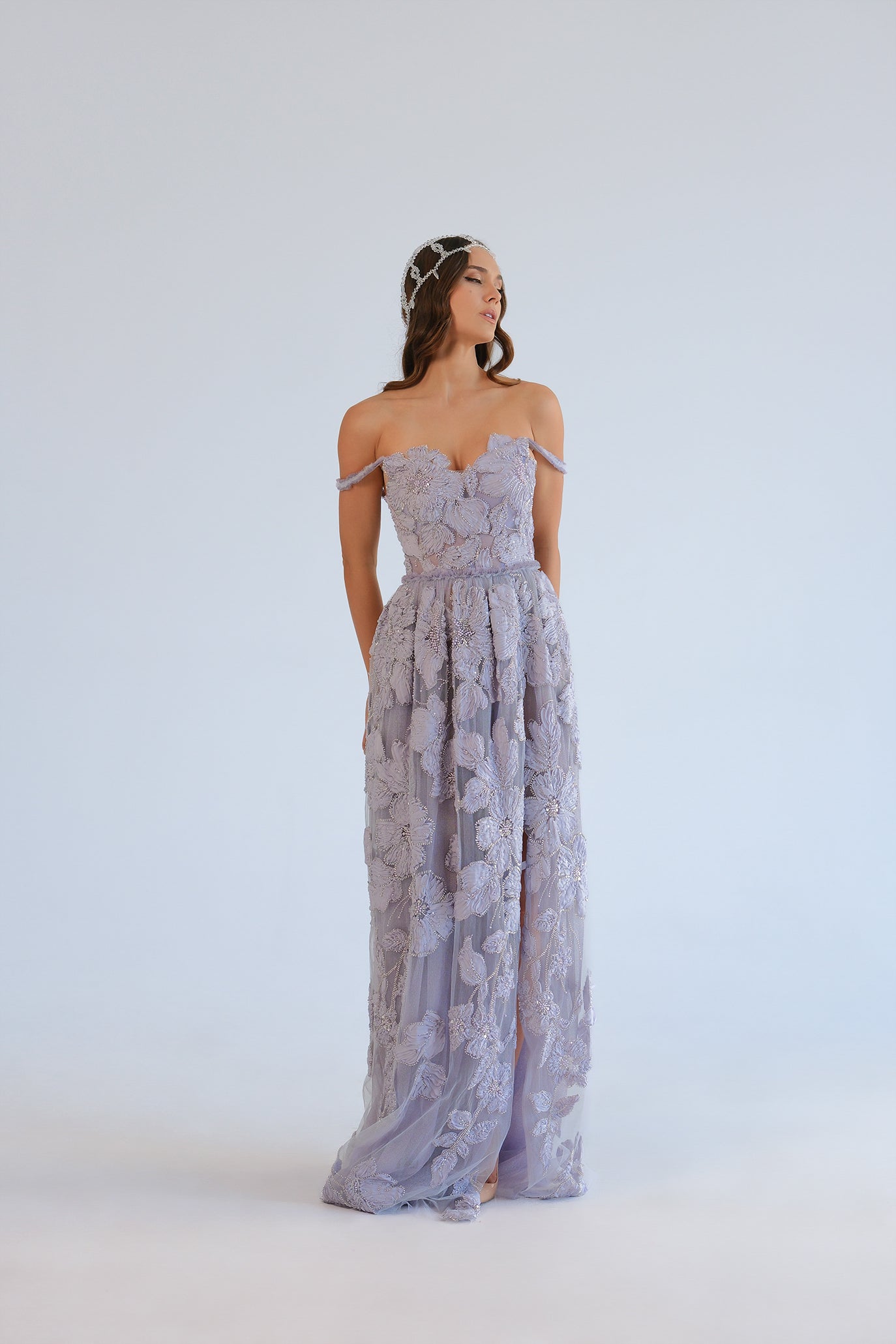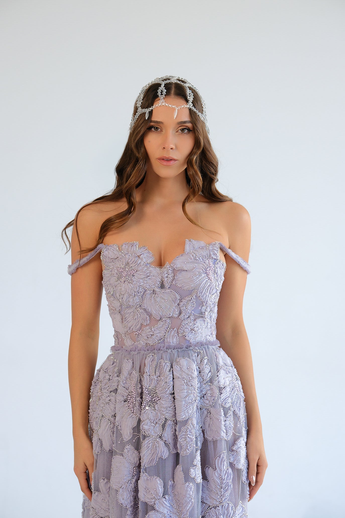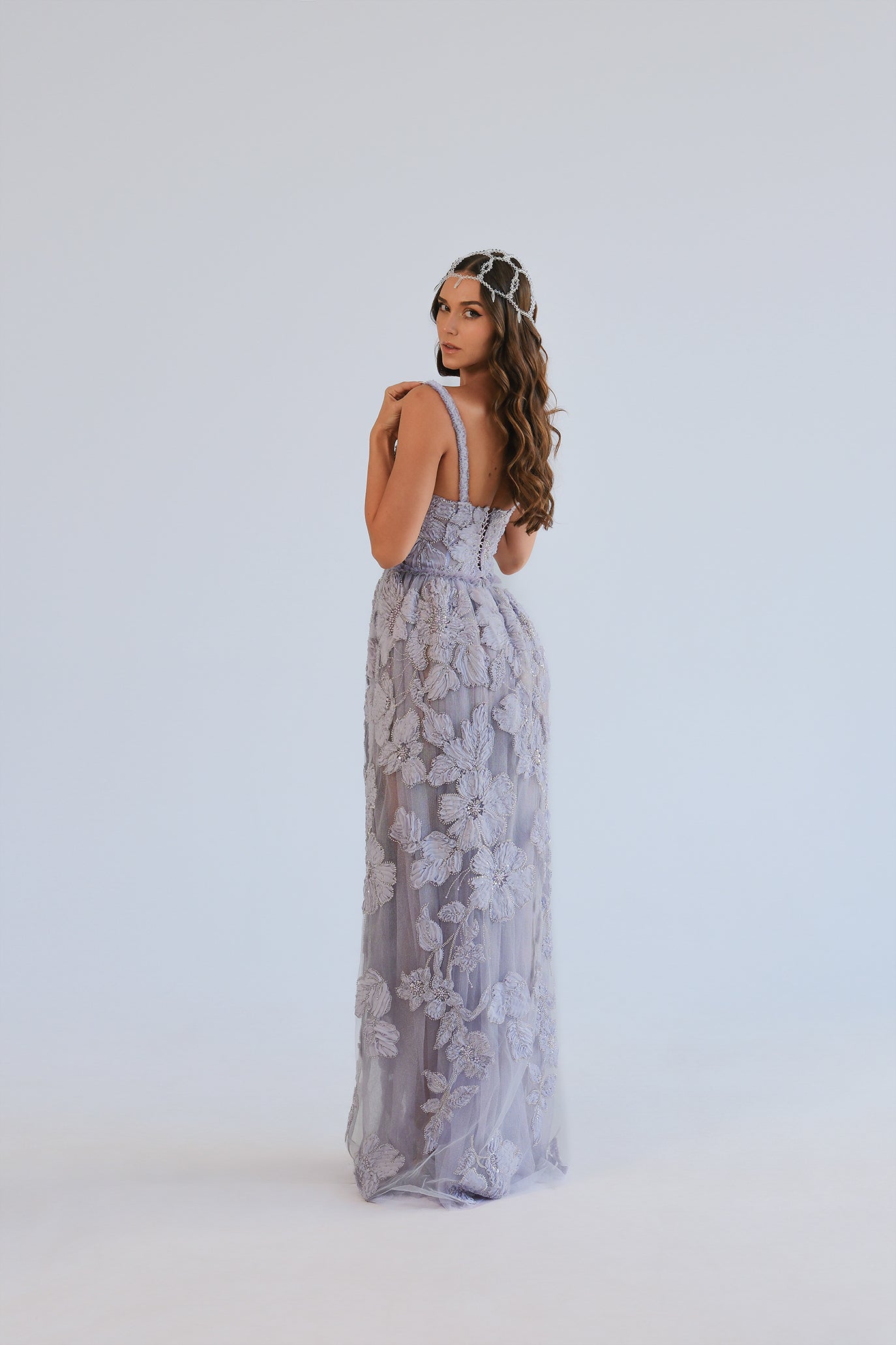 Ефирна рокля, изработена от многопластов тюл и покрита с богати 3D флорални апликации, декорирани с пайети и фини кристални акценти. Горната част е тип корсет със сърцевидно деколте и деликатни презрамки, които подчертават линията на раменете и осигуряват сигурна поддръжка и перфектно прилягане благодарение на връзките на гърба. Полата е права до А-силует с леко падаща линия и дискретна цепка отпред за свобода на движение и елегантен ефект при ходене. Продуктът идва в персонализиран калъф.