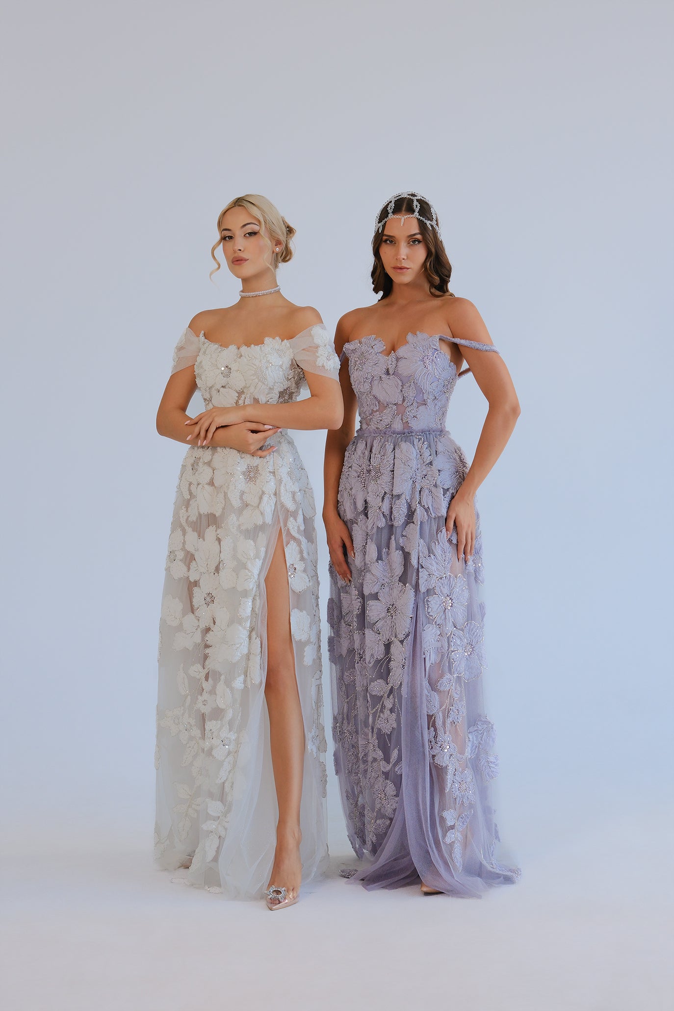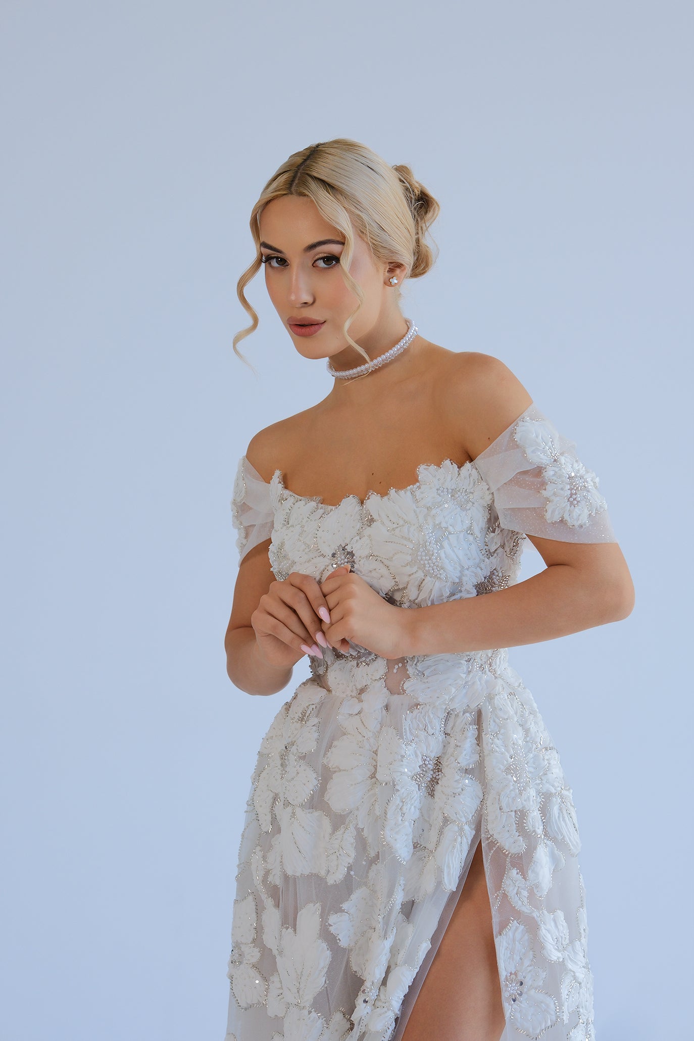 Ефирна рокля, изработена от многопластов тюл и покрита с богати 3D флорални апликации, декорирани с пайети и фини кристални акценти. Горната част е тип корсет със сърцевидно деколте и деликатни паднали презрамки, които подчертават линията на раменете и осигуряват сигурна поддръжка и перфектно прилягане благодарение на връзките на гърба. Полата е права до А-силует с леко падаща линия и дискретна цепка отпред за свобода на движение и елегантен ефект при ходене. Продуктът идва в персонализиран калъф.