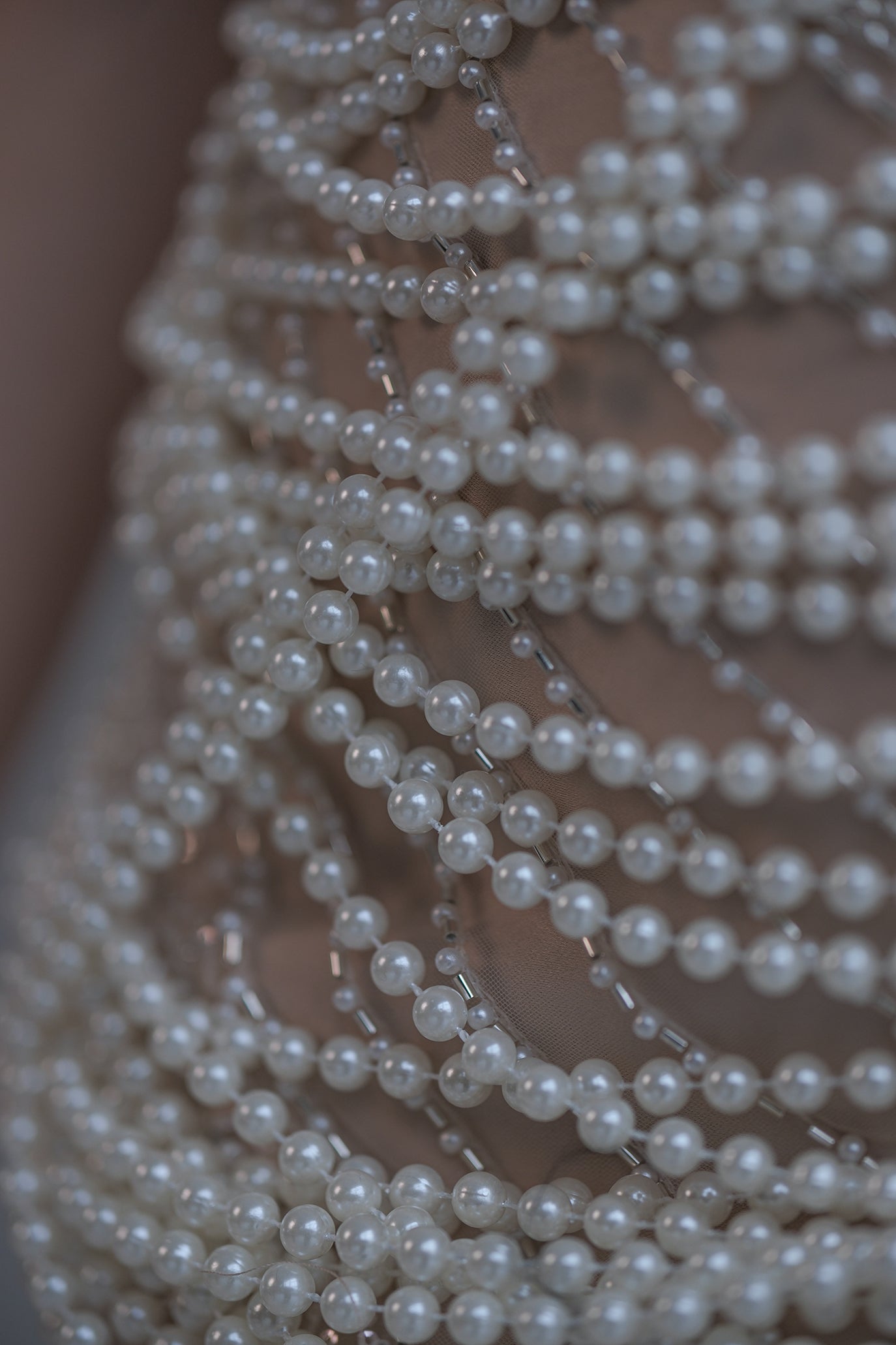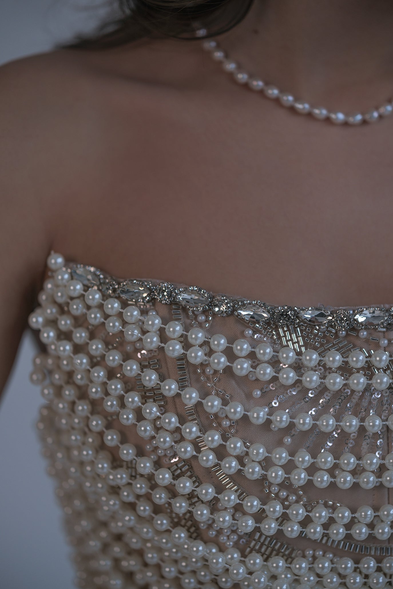 Тази рокля е олицетворение на блясъка и женствеността. Уникалният дизайн е създаден чрез внимателно ръчно преплитане на перлени нанизи, които образуват ефект на естествена драперия върху прозрачната основа. Подплатата в телесен нюанс създава илюзията за втора кожа. Под перлите има и нашити кристали за допълнителен блясък. Вталената кройка подчертава извивките на тялото, а мини дължината придава модерна и съблазнителна визия.