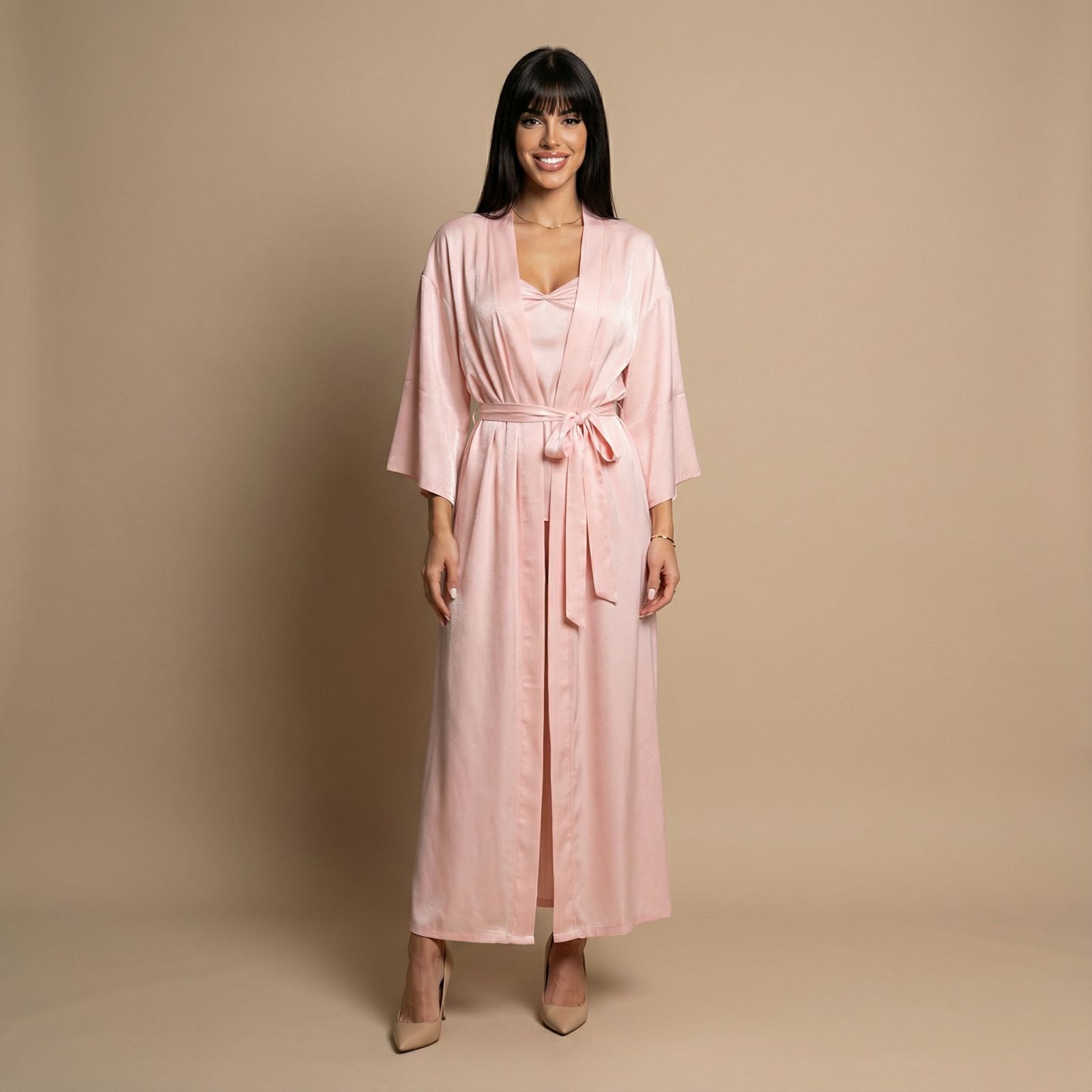 Дълга рокля от луксозен сатен с деликатен блясък, която съчетава женственост и елегантност. Моделът е със свободна, ефирна кройка, тънки презрамки и деколте тип „водопад“. Може да бъде съчетана с жилетката от снимките.