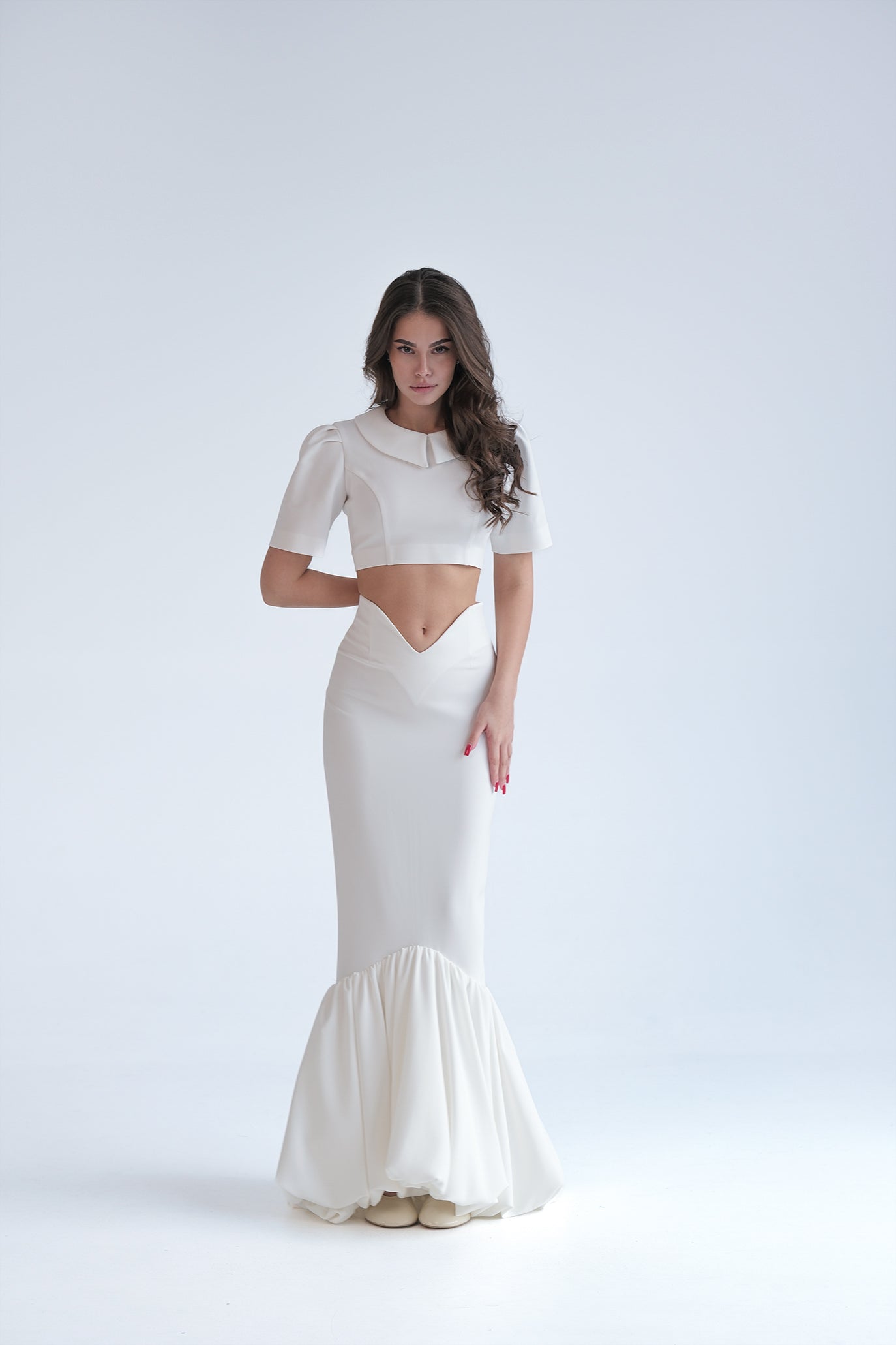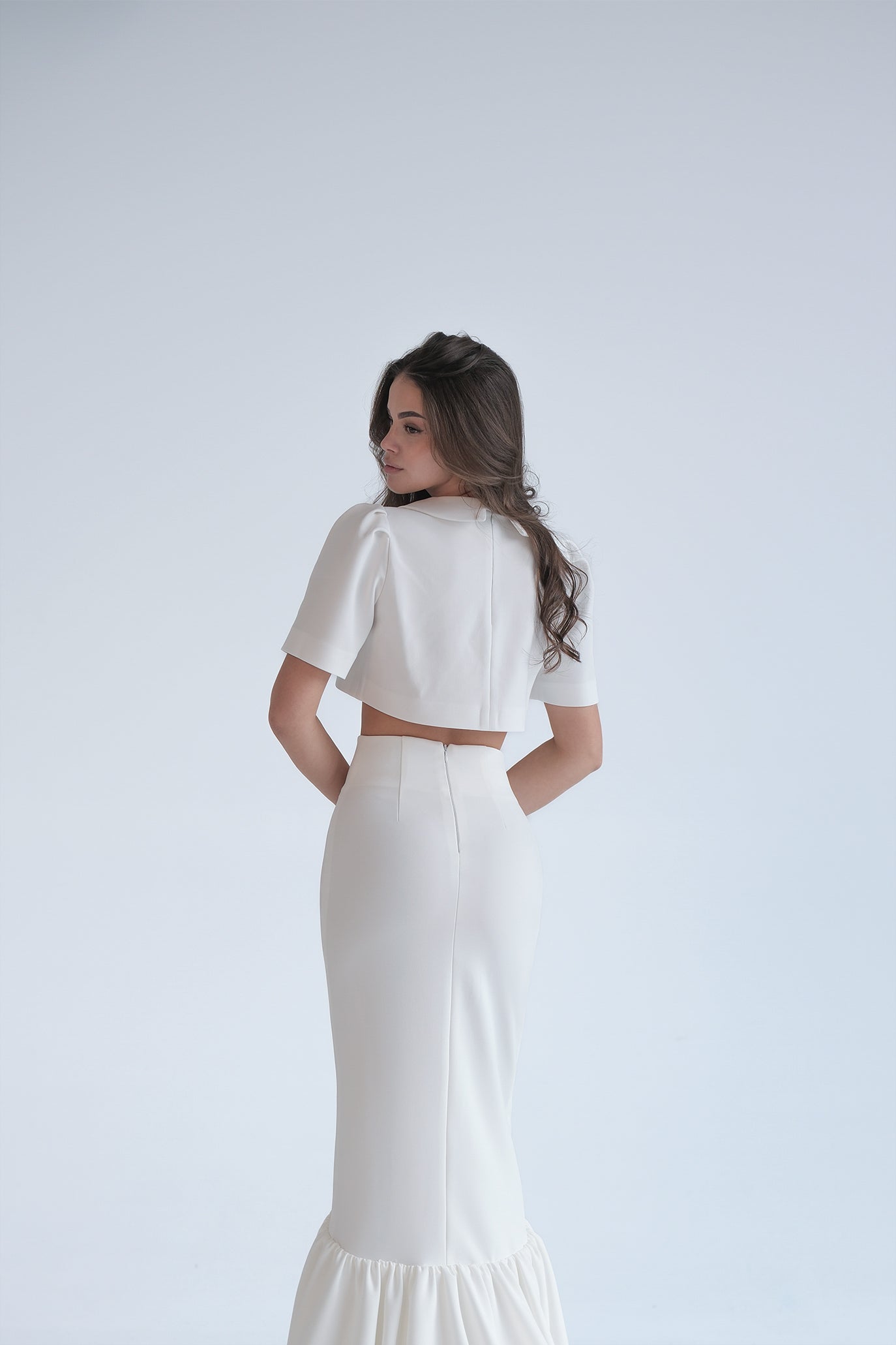 Сет от топ и пола. Пола, създадена да подчертае силуета с изчистена кройка и изразена женственост. Полата е с висока талия и изчистена линия в горната част, която преминава в ефирен разкроен подгъв за движение и лекота. Закопчава се с цип отзад. Късият топ е с ефектен, изчистен силует, изработен от висококачествен материал с леко разтеглива текстура. Силуетът подчертава талията. Моделът е с къси ръкави. Задният цип и висока яка с леко удължен ръкав добавят акцент на външния вид.