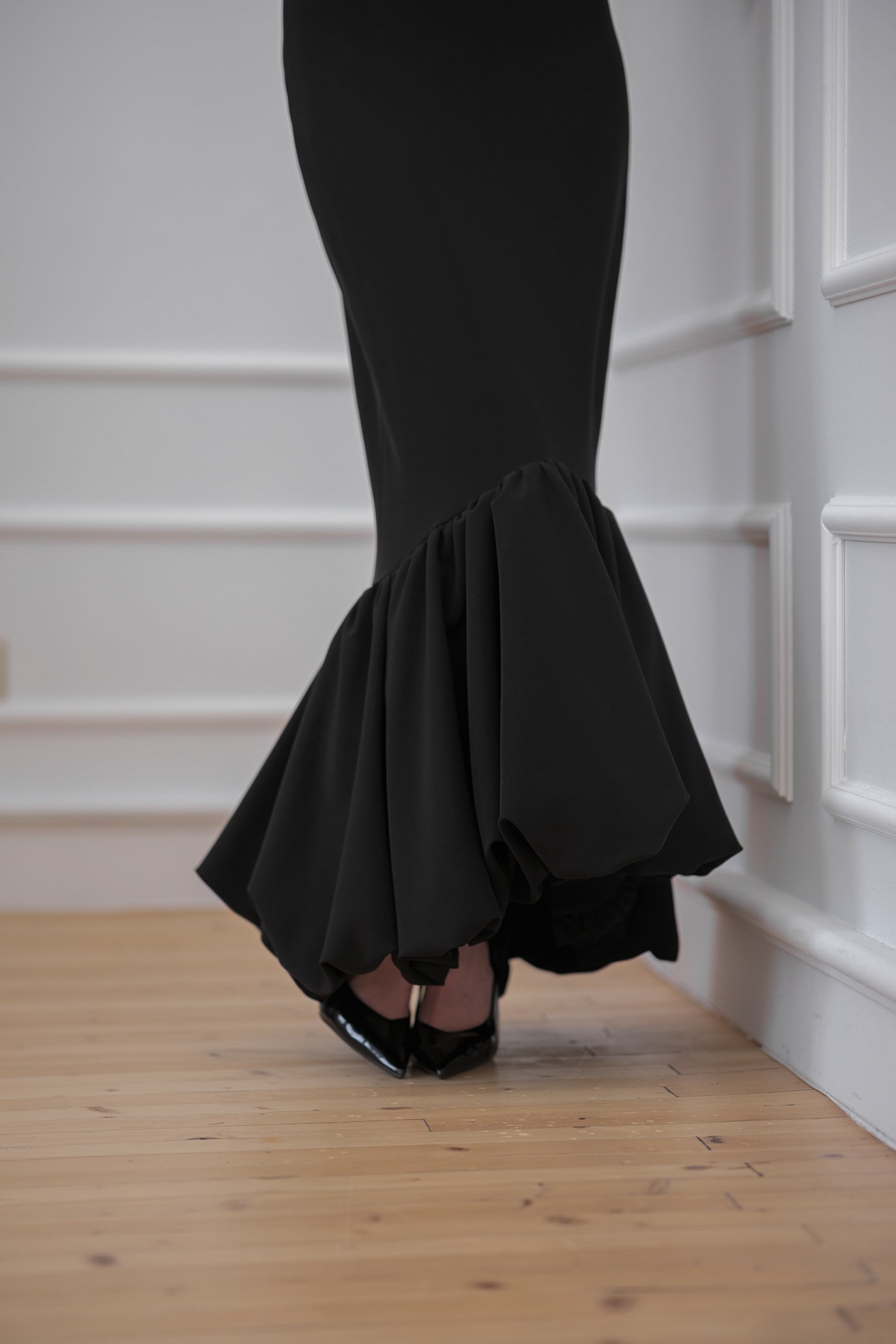 Сет от топ и пола. Пола, създадена да подчертае силуета с изчистена кройка и изразена женственост. Полата е с висока талия и изчистена линия в горната част, която преминава в ефирен разкроен подгъв за движение и лекота. Закопчава се с цип отзад. Късият топ е с ефектен, изчистен силует, изработен от висококачествен материал с леко разтеглива текстура. Силуетът подчертава талията. Моделът е с къси ръкави. Задният цип и висока яка с леко удължен ръкав добавят акцент на външния вид.
